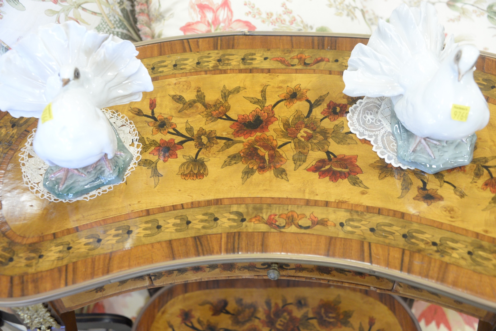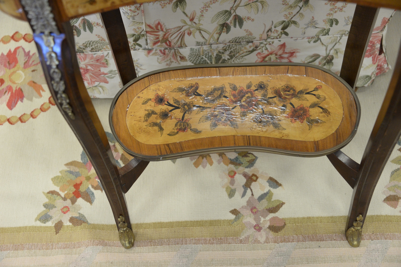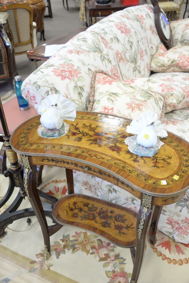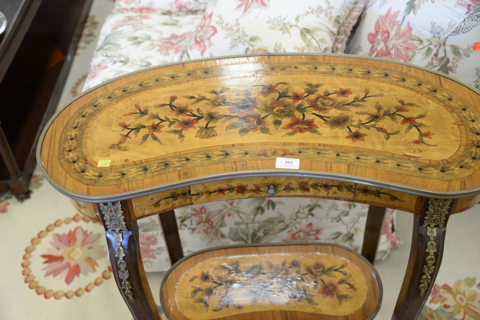 Lot 302: Pair Louis XV Style Kidney Shaped Tables, with brass mounts, 20th Century, height 30 inches, top 14 1/2 x 32.