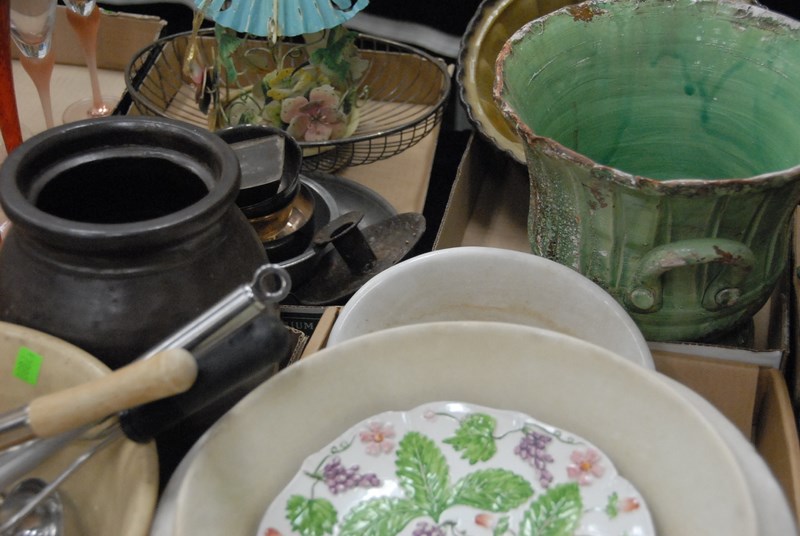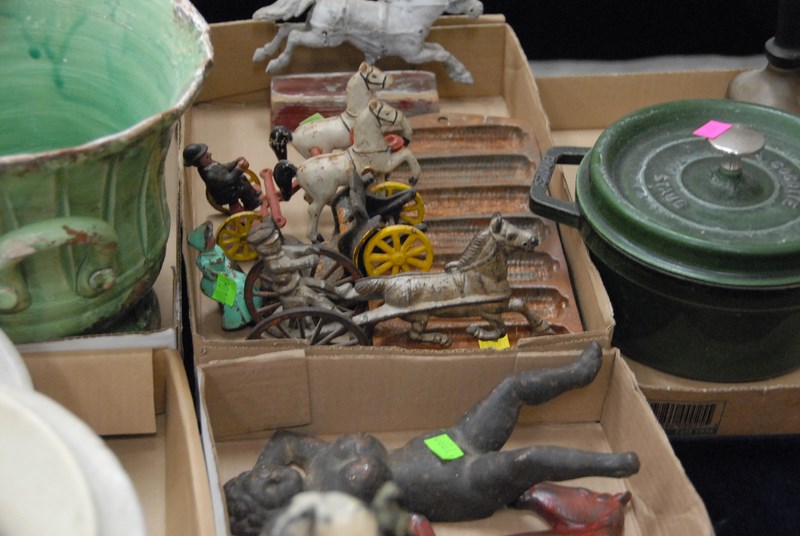 Seven box lots to include iron dog doorstop, iron toys, early model, iron covered pot, molds, bell, etc.