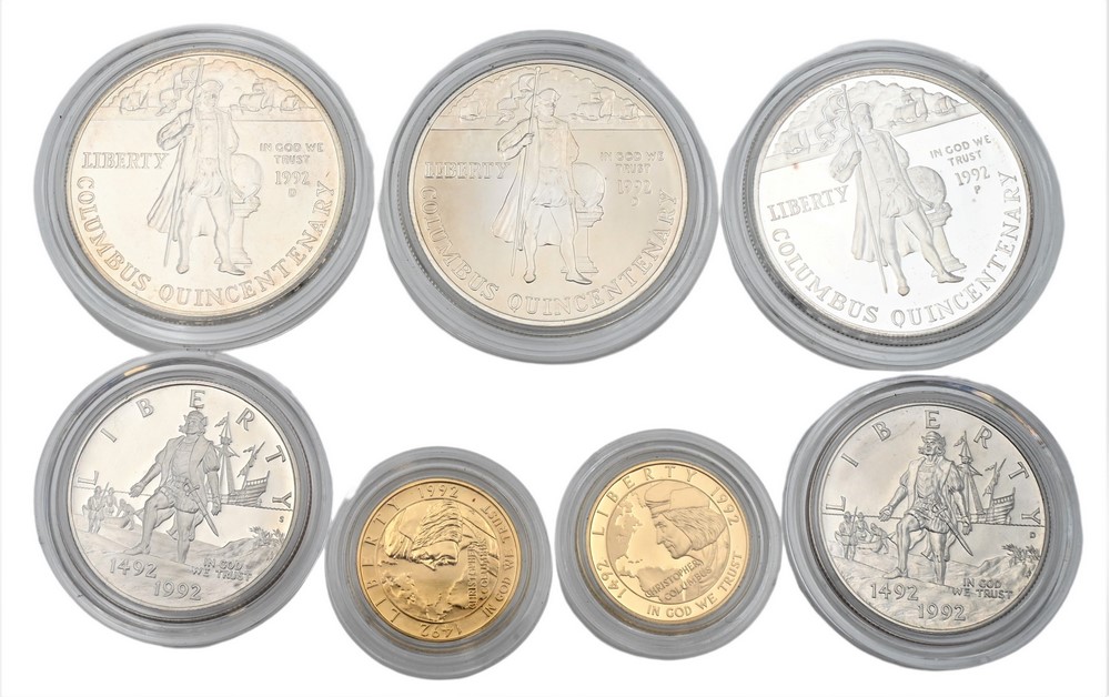 Seven Piece Coin Lot, to include one 5 dollar proof, one uncirculated 5 dollar, along with five 1992 Christopher Columbus coins to include one uncirculated, one proof half-dollar, two uncirculated one dollar silver, and one proof one dollar silver.