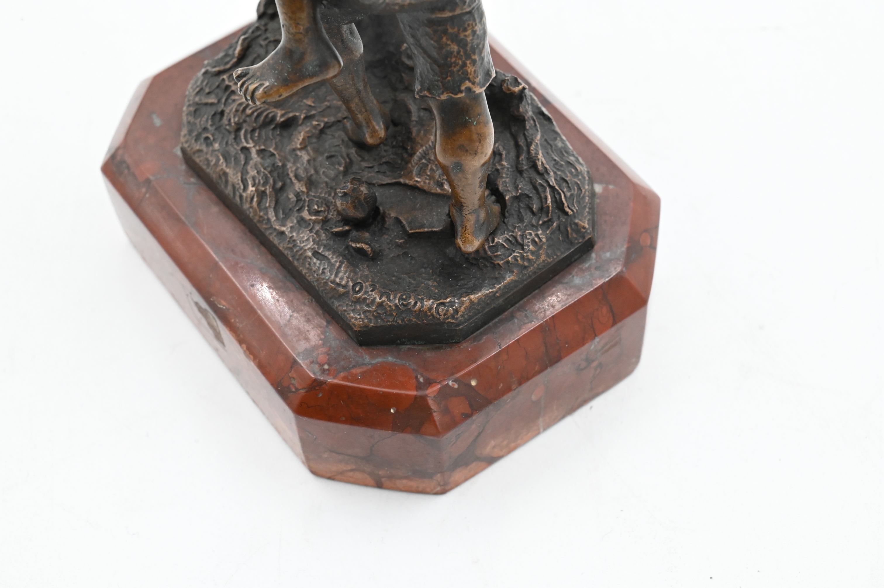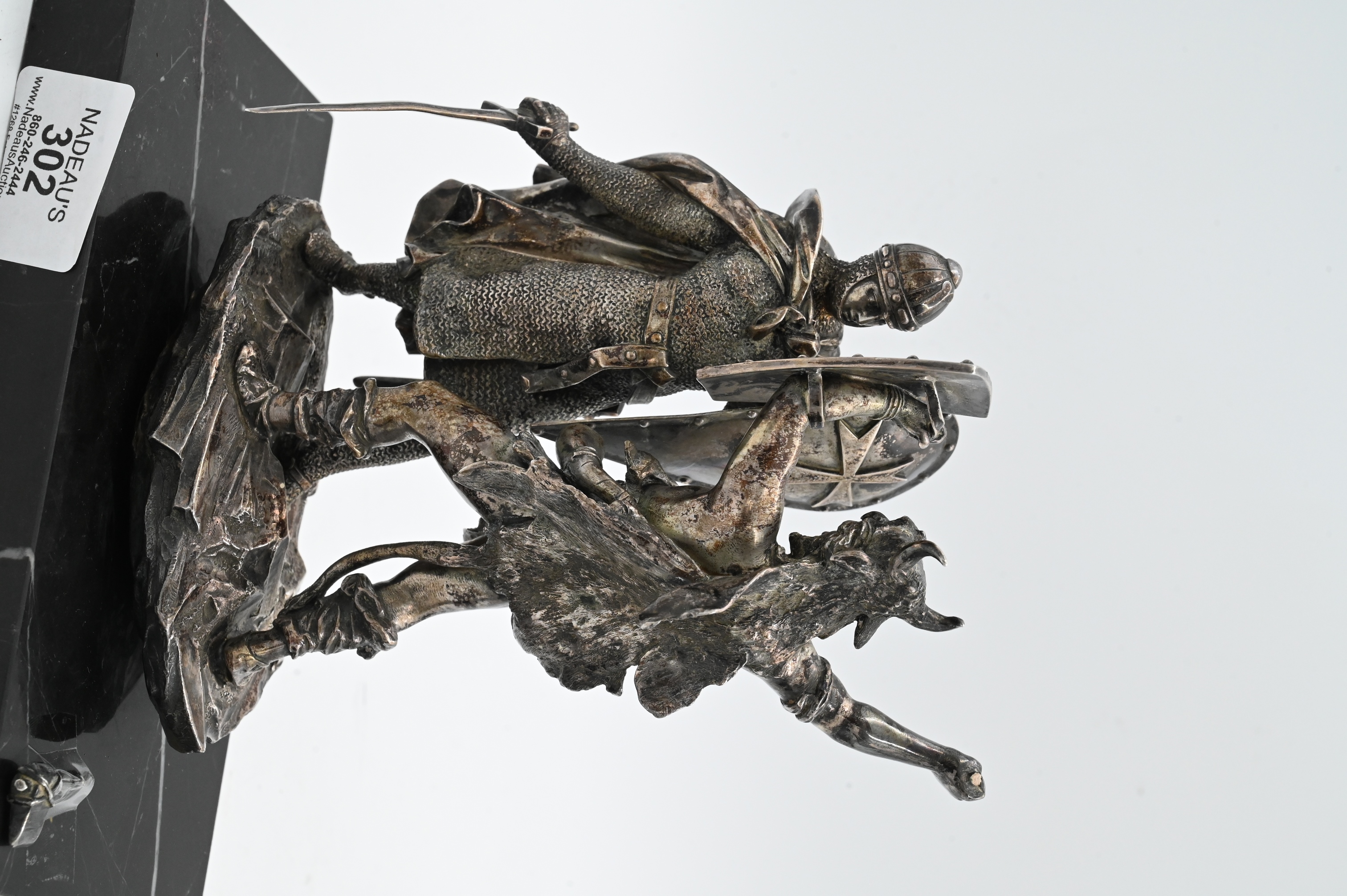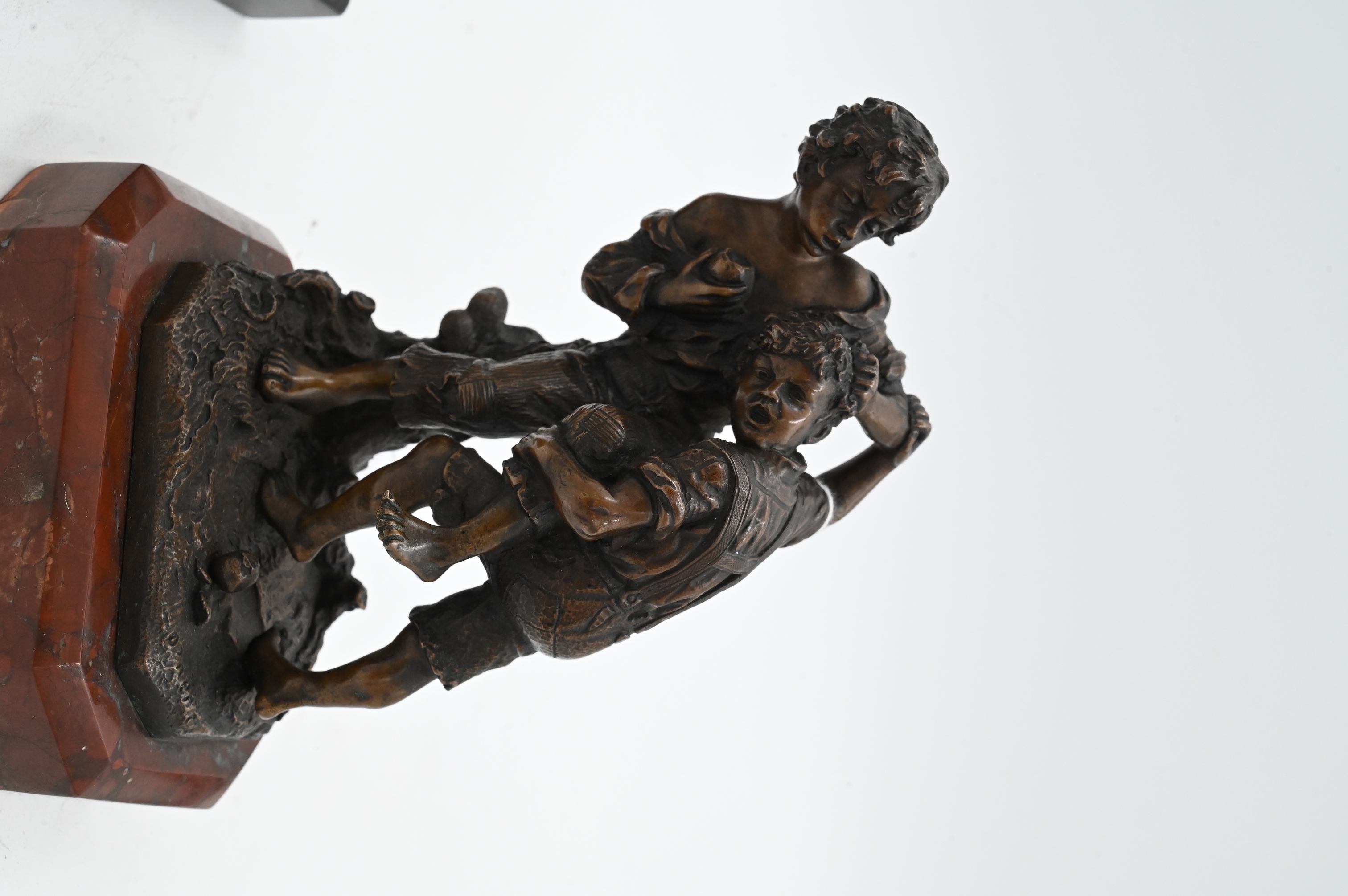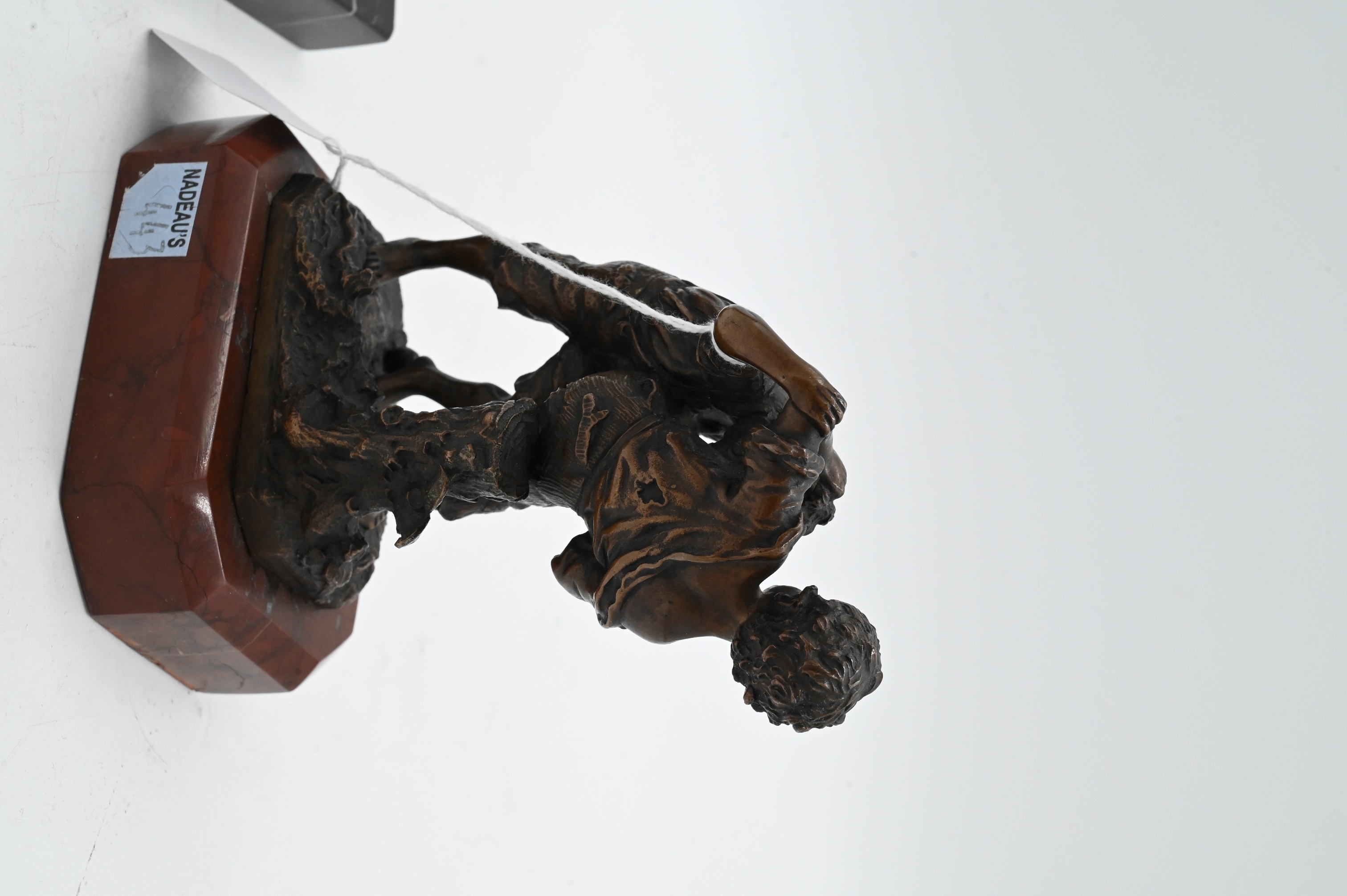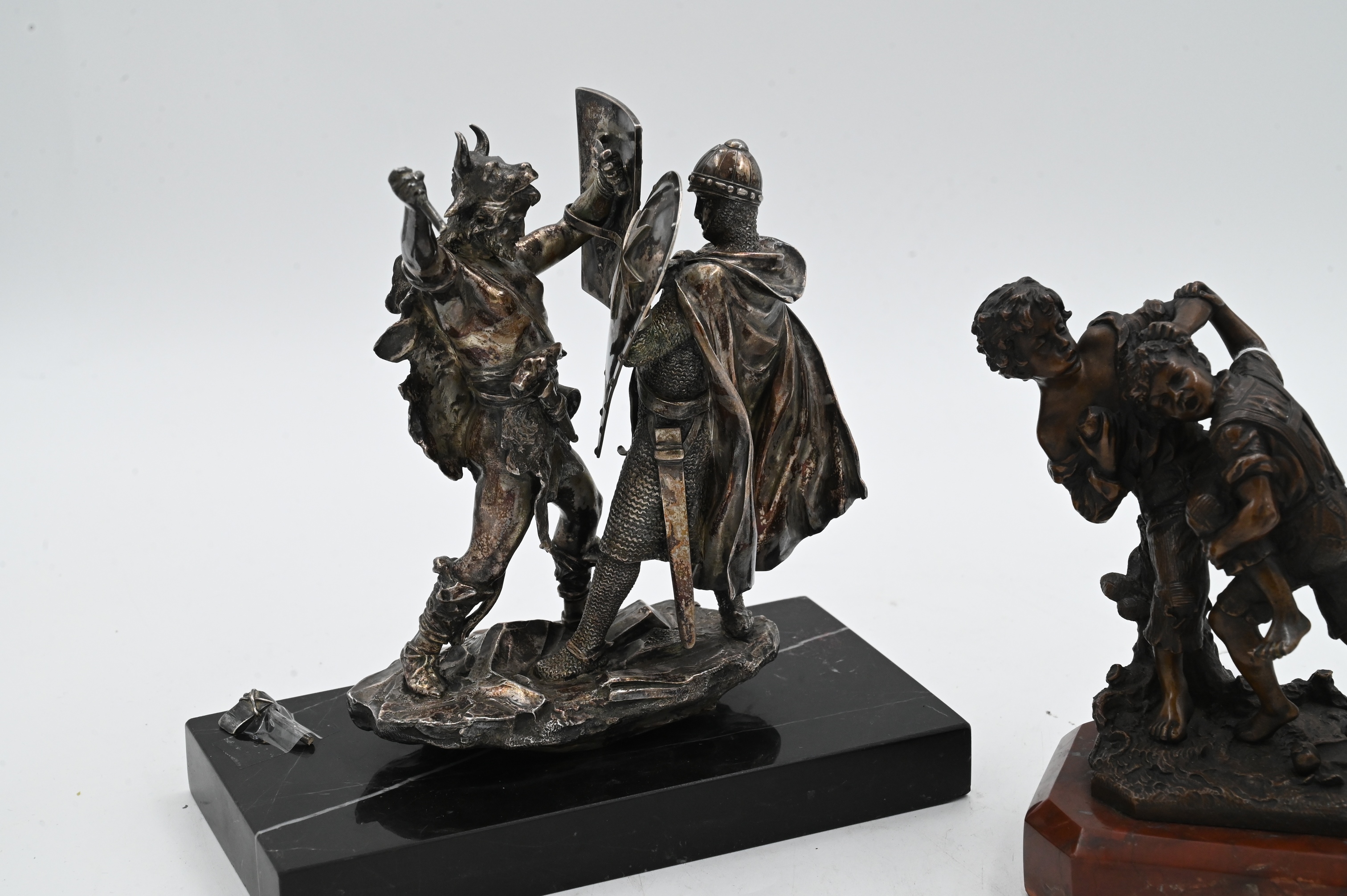 silvered bronze of battle having crusader on marble base having broken ax handle, along with bronze on red marble base of two boys fighting