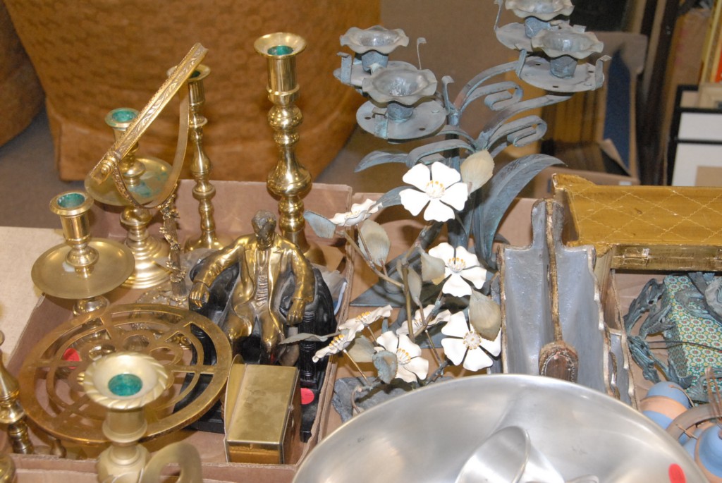 Six box lots of metal items brass candlesticks, brass stands, pewter, silverplate, and miscellaneous.