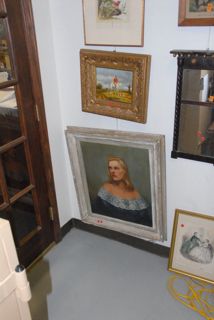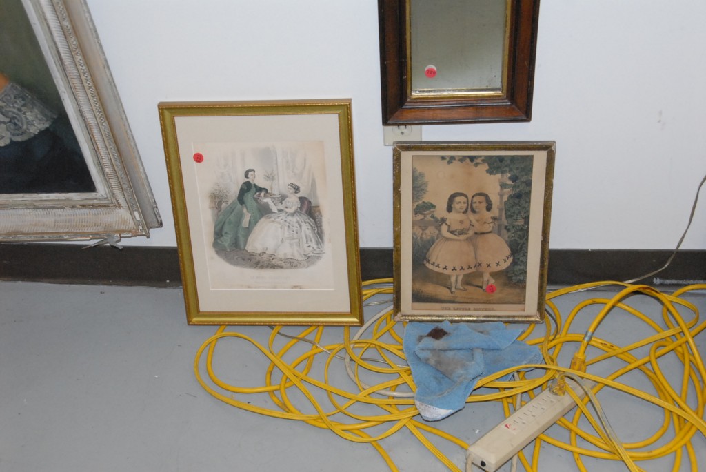 Ten piece lot 2 small Currier and Ives prints, painting portrait of a woman, Oriental watercolor of a bird, Godey print, photographs in deep frames.