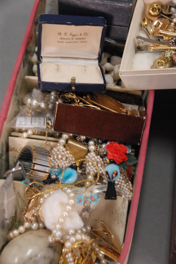 Lot 302: Two box lots of costume and sterling silver jewelry, and two enameled salts and salts spoons.