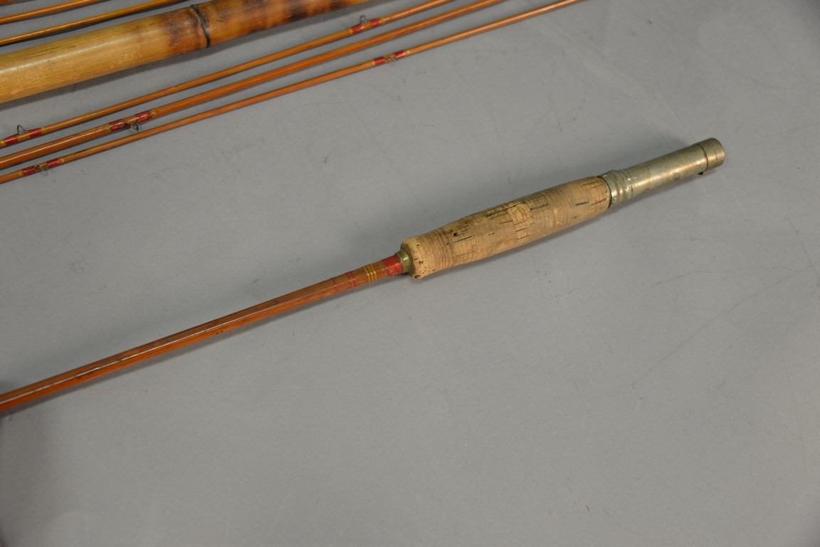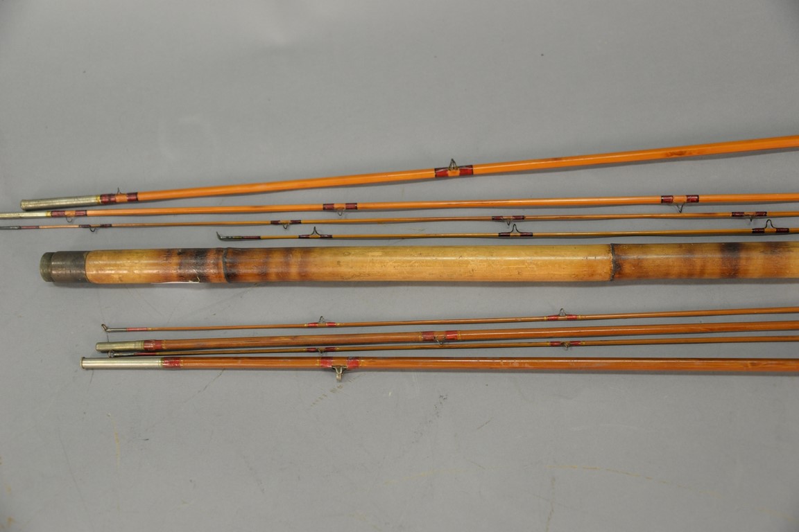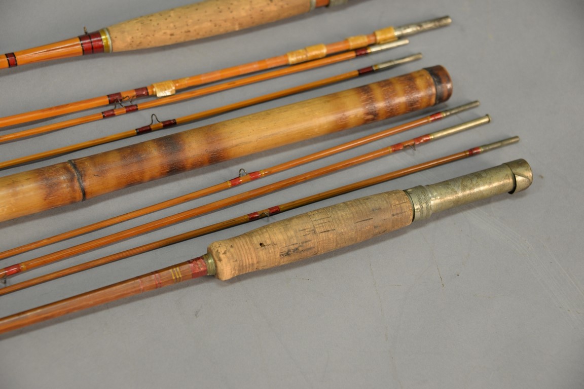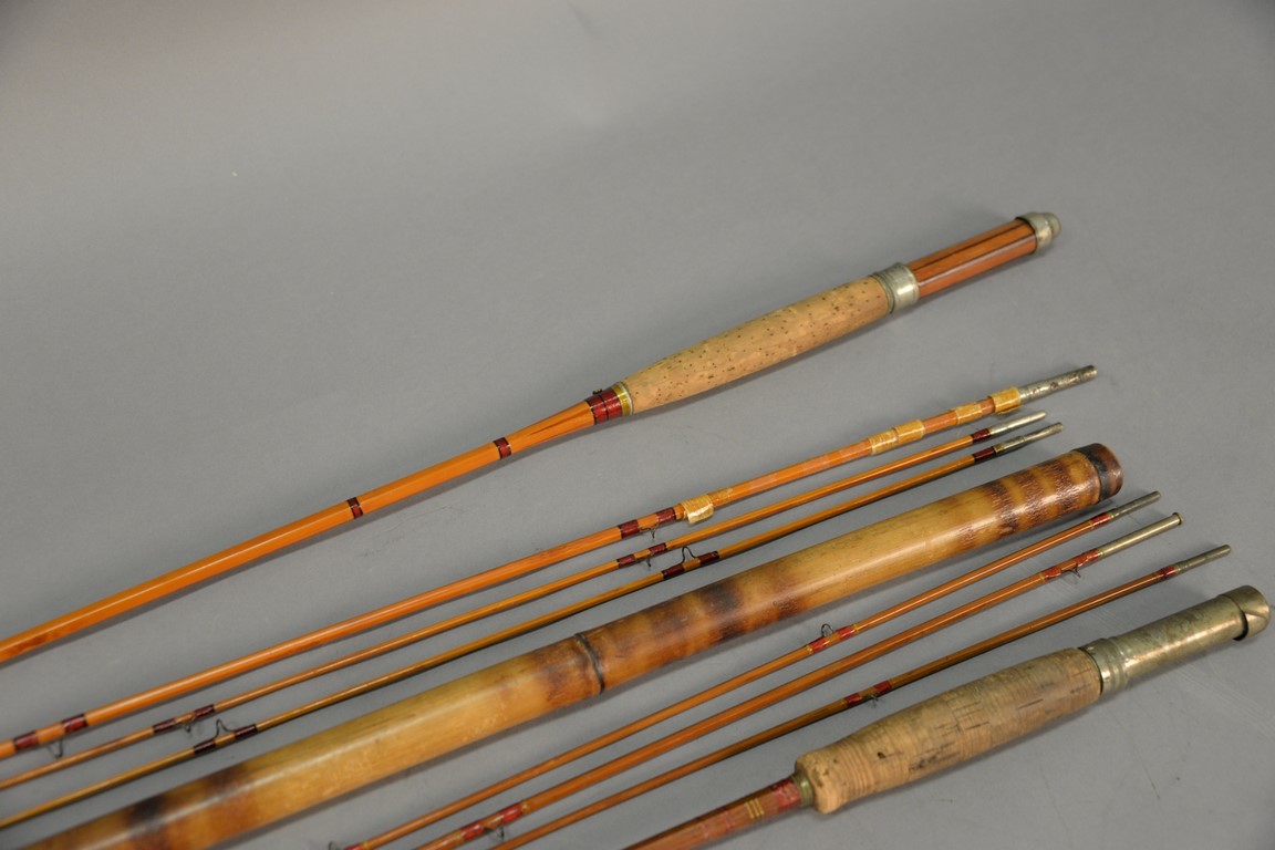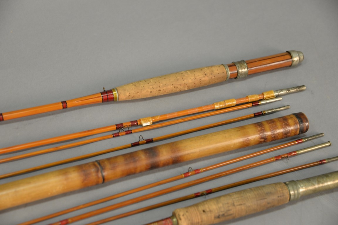 Lot 302: Two custom bamboo fly rods, both three part, one with two full length tips 8’6 and one with two shortened tips, one with tips in ba…
