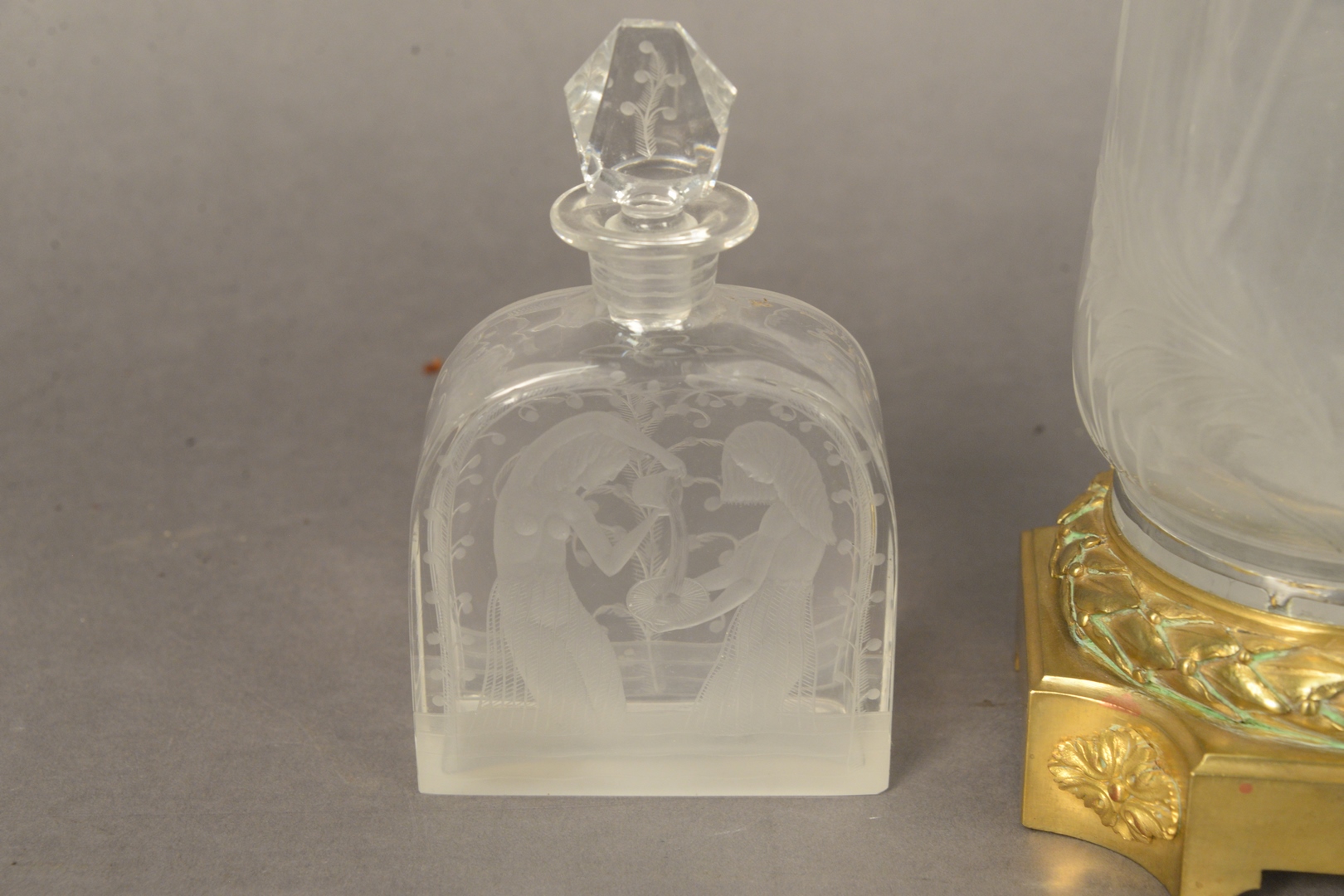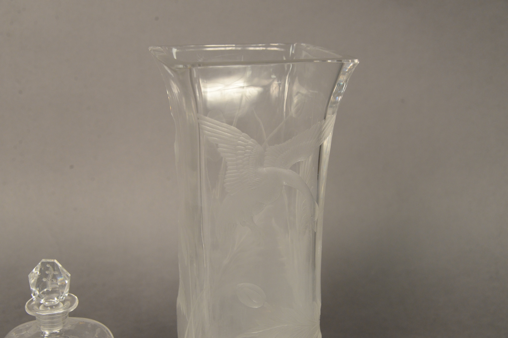 Two Etched Glass Pieces, to include Orrefors Intaglio perfume bottle along with French glass vase depicting goose with flowers and leaves, heights 5 1/2 and 11 1/2 inches.