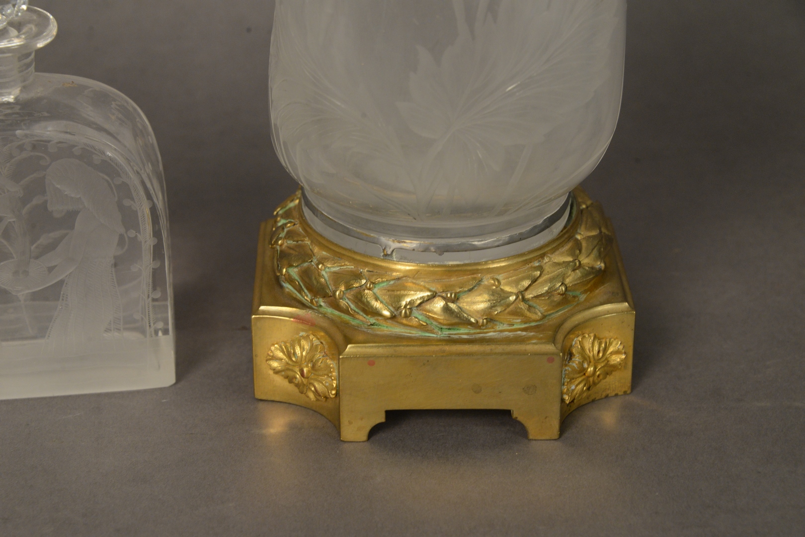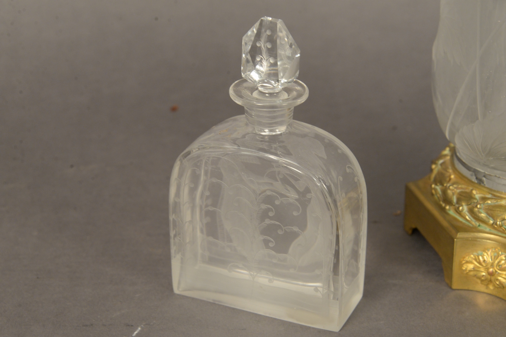 Lot 302: Two Etched Glass Pieces, to include Orrefors Intaglio perfume bottle along with French glass vase depicting goose with flowers and leaves, heights 5 1/2 and 11 1/2 inches.