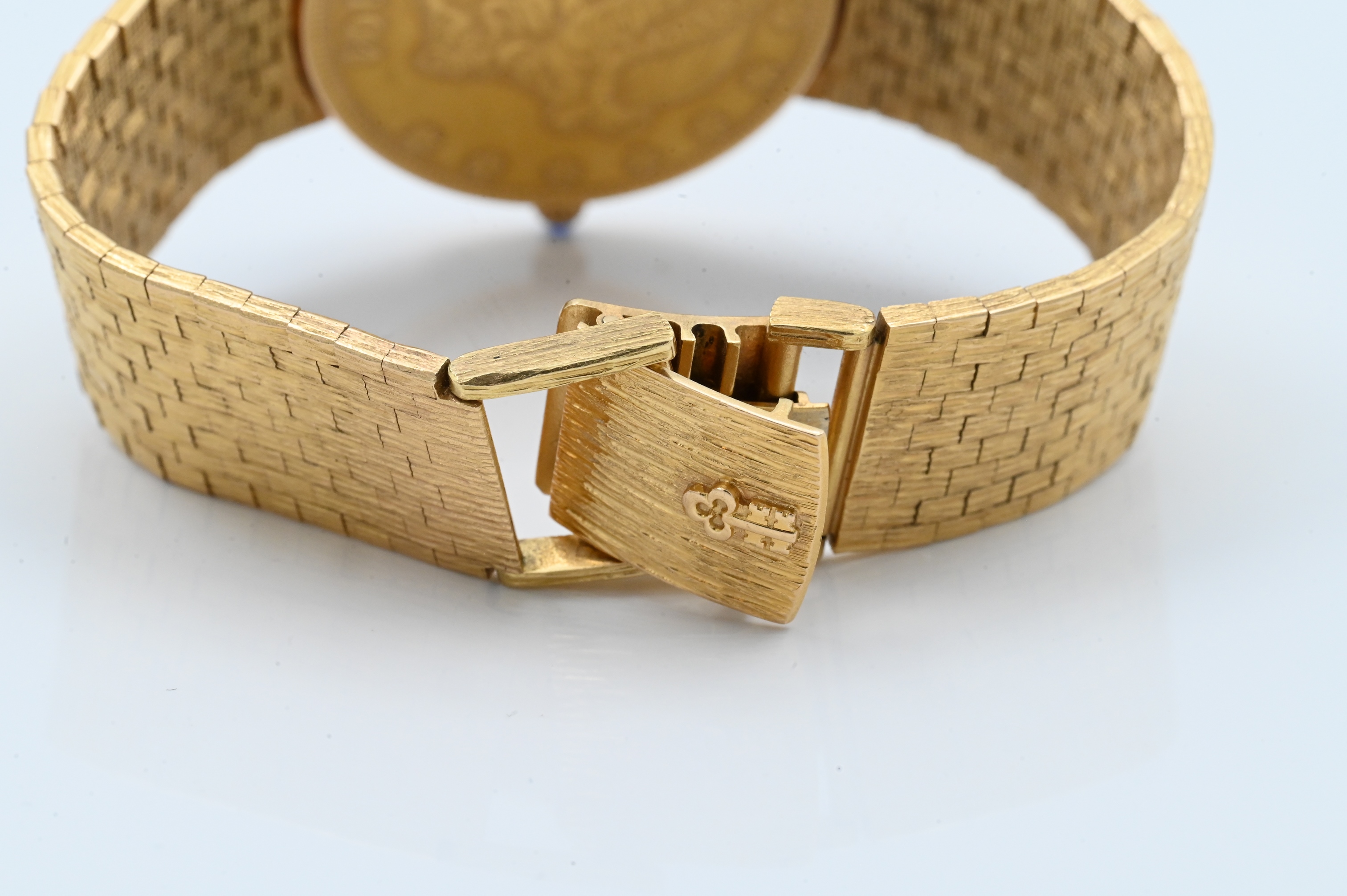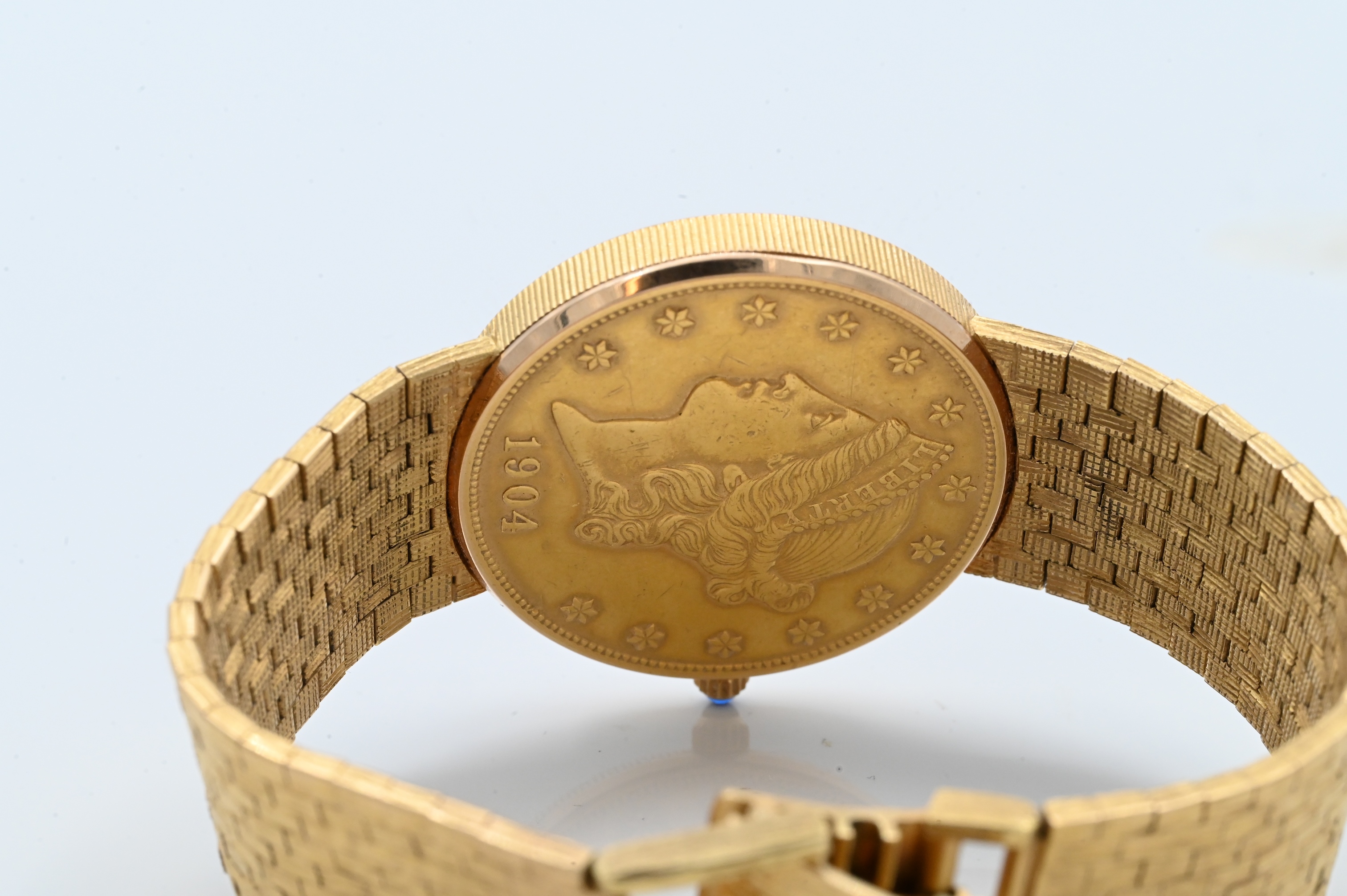 having 1904 $20 U.S gold liberty, mesh 18K yellow gold band with sapphire