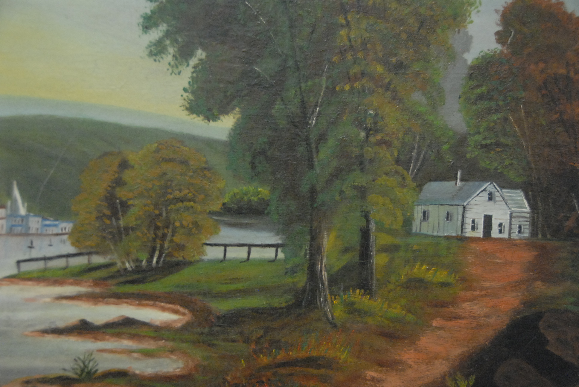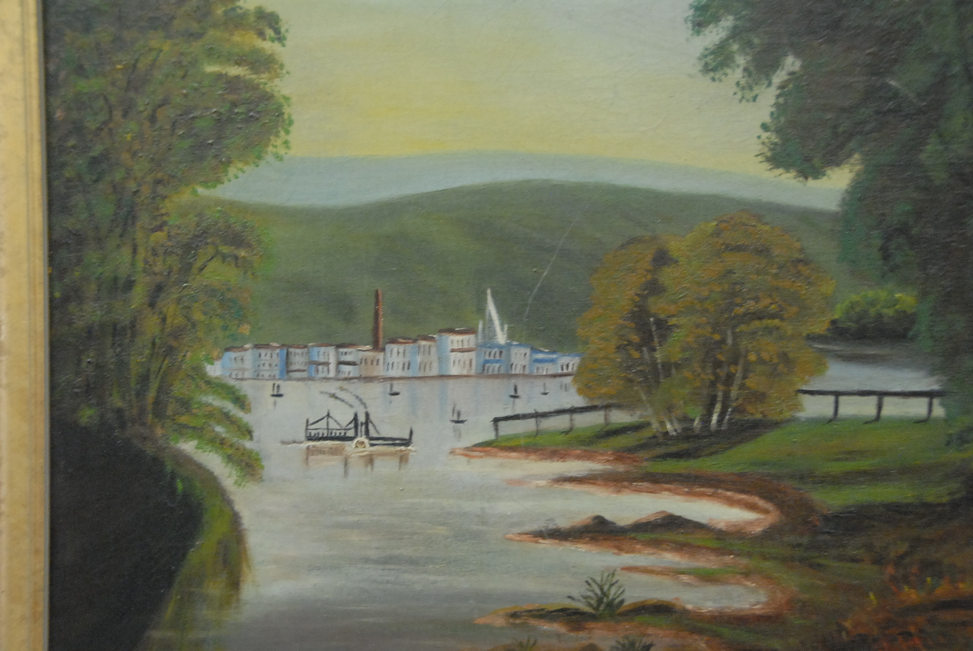 19th Century Landscape POND AND PADDLE BOAT oil on canvas unsigned 24 x 32