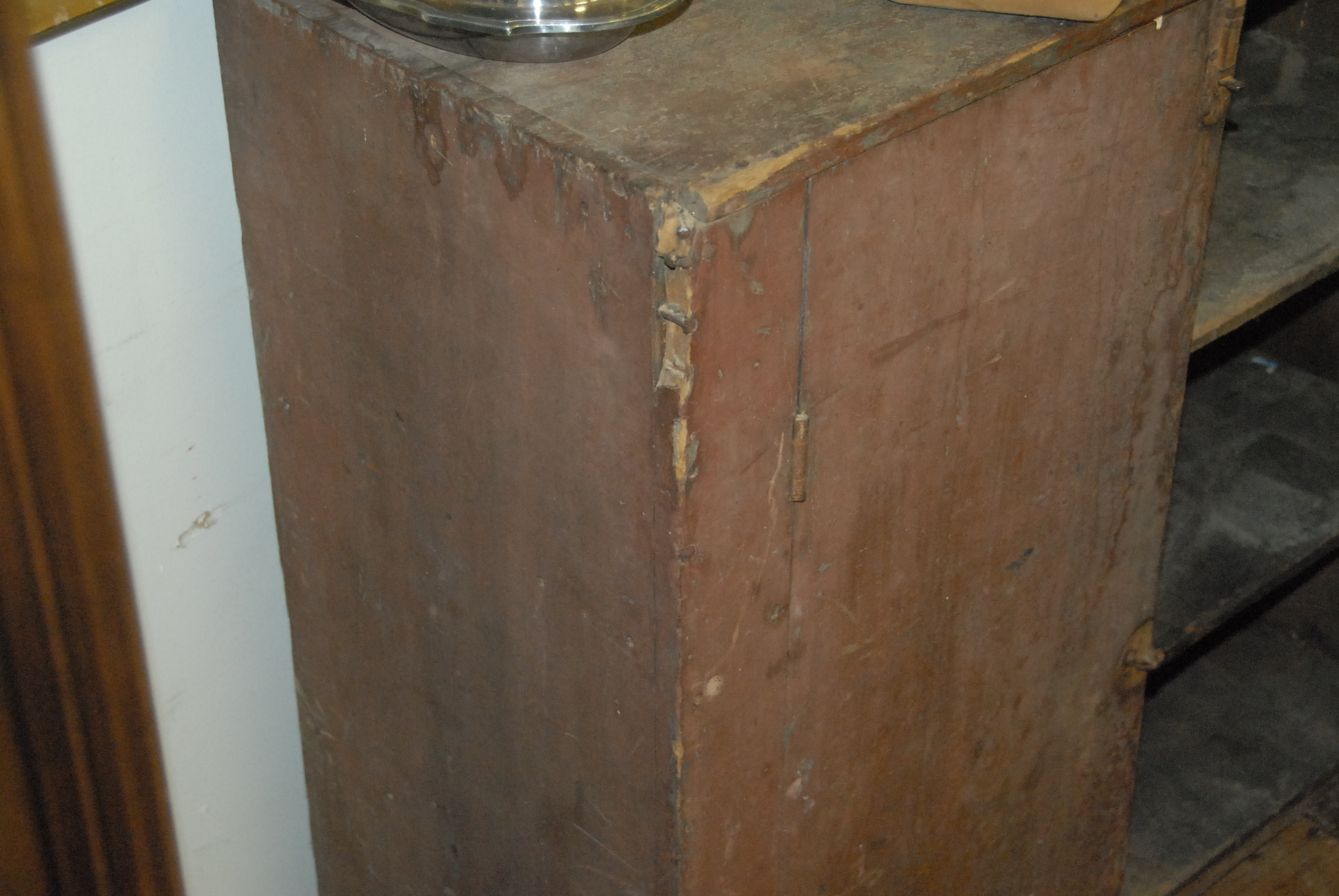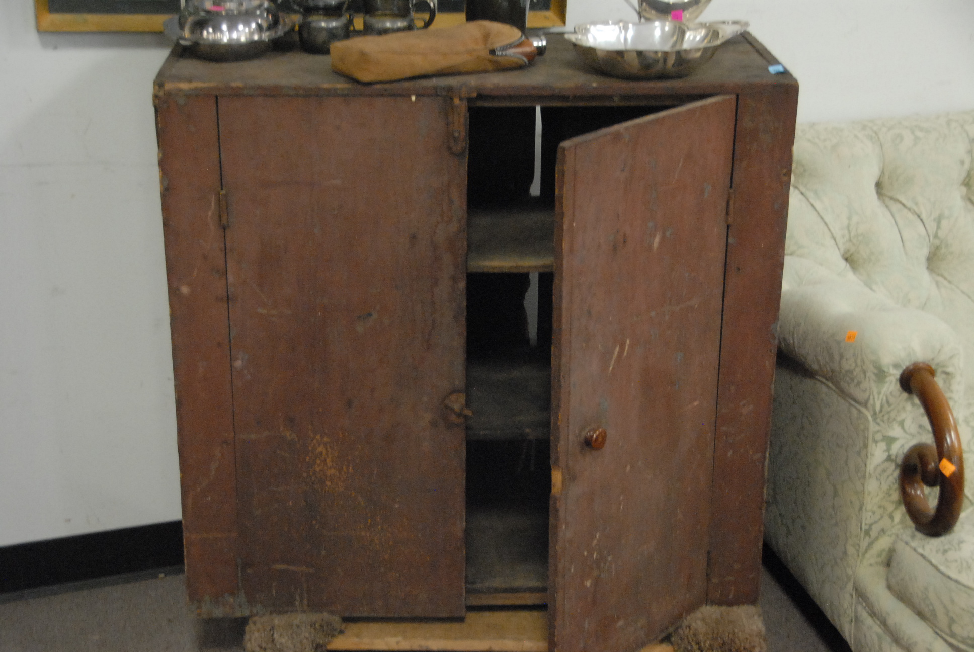 Early two door cupboard in old red paint, ht. 33in. wd. 35in.