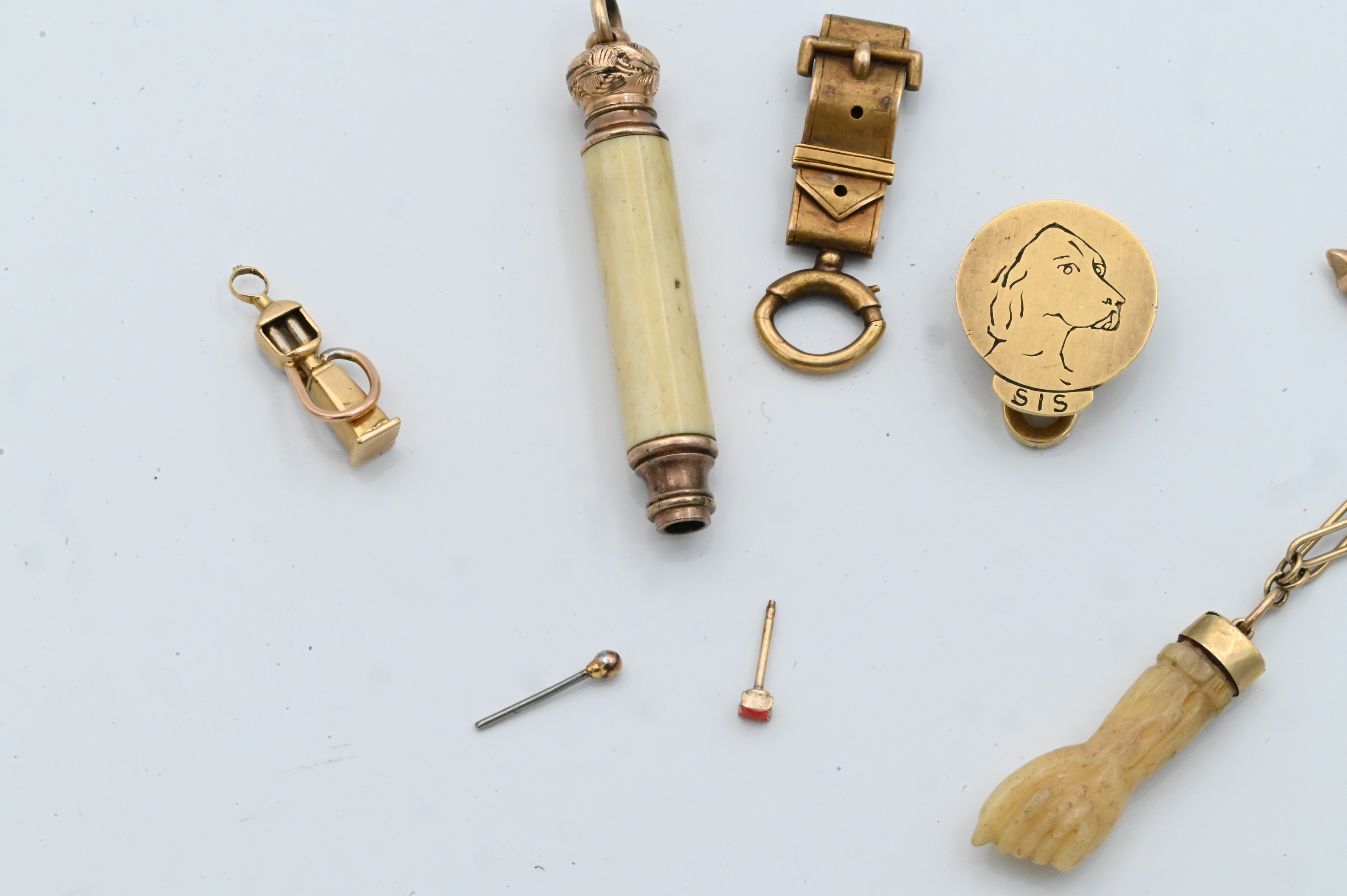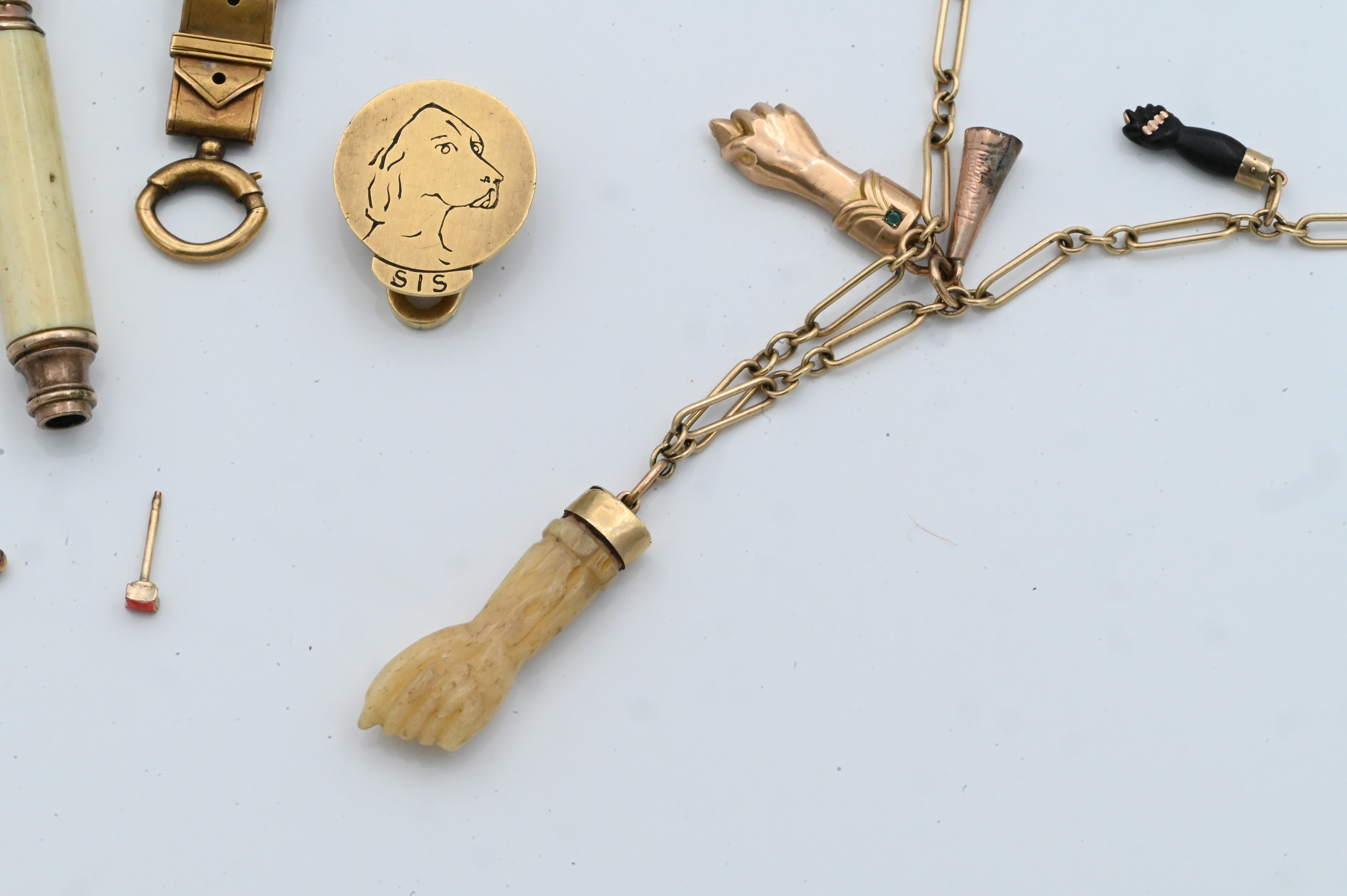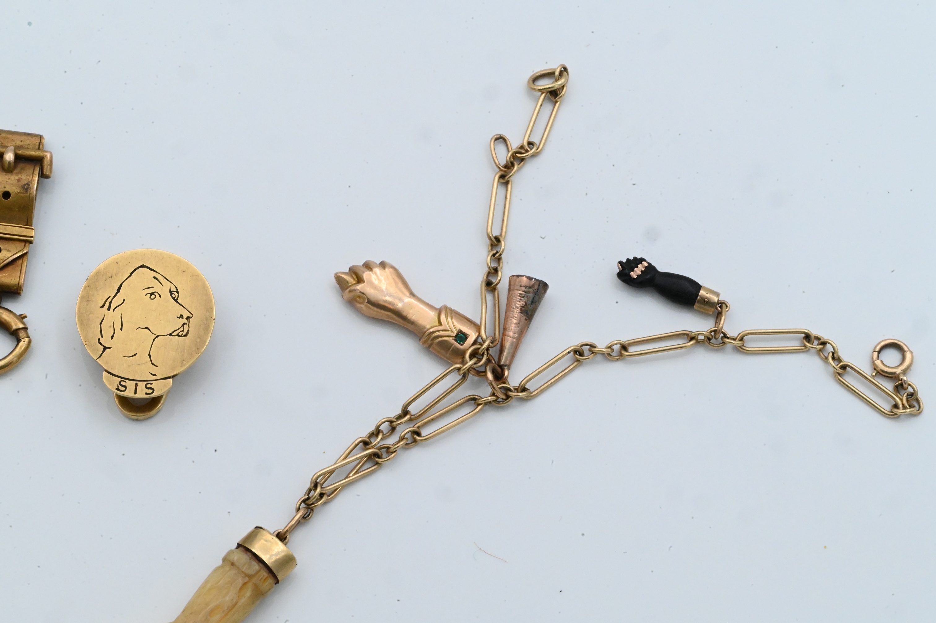 Including a 14K gold paperclip-link bracelet with carved bone hand and horn charms, a gold-tone retractable mechanical pencil with bone body and gold mounts, a gold and gold-tone fob engraved with a dog, an enamel charm, and other assorted small components.