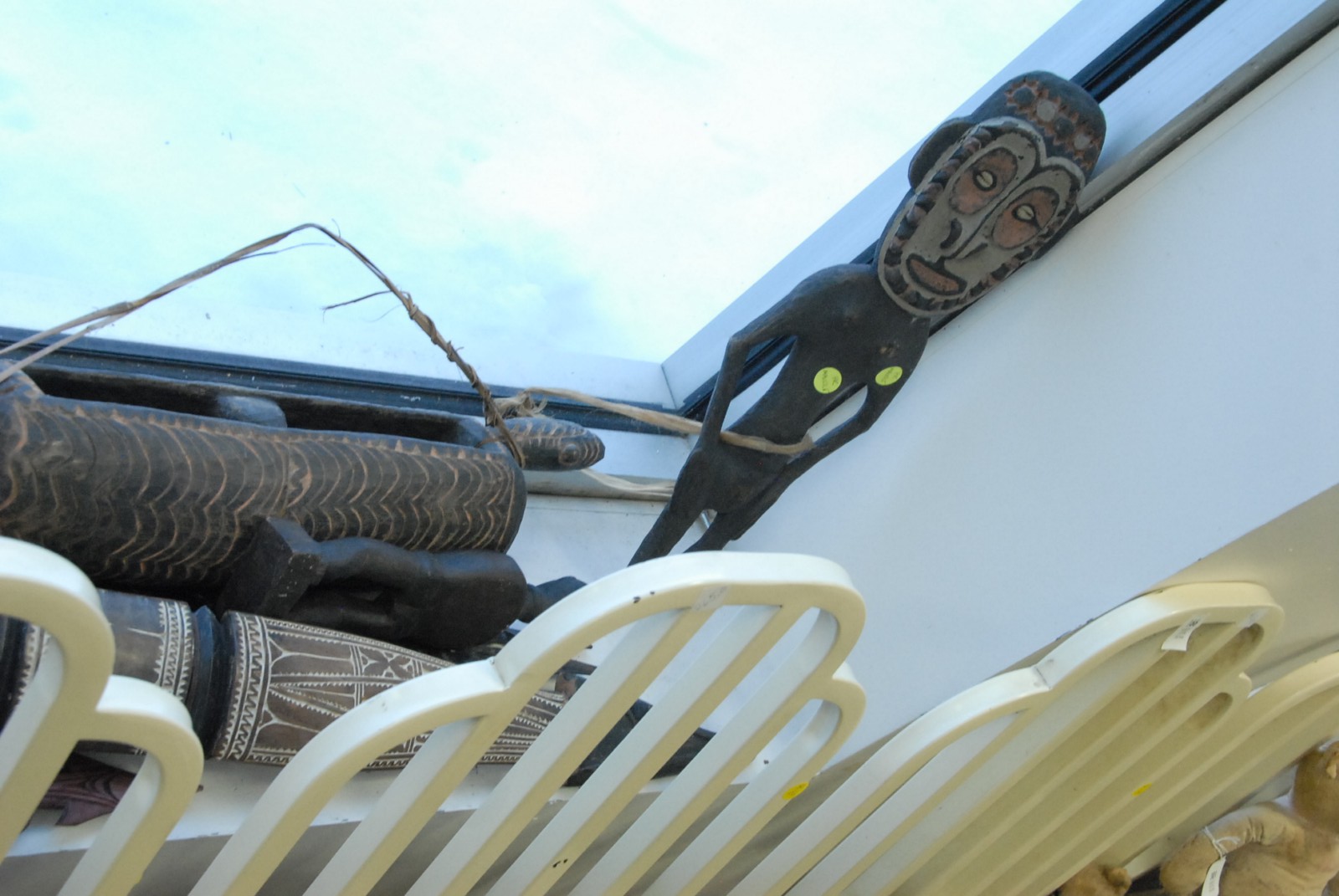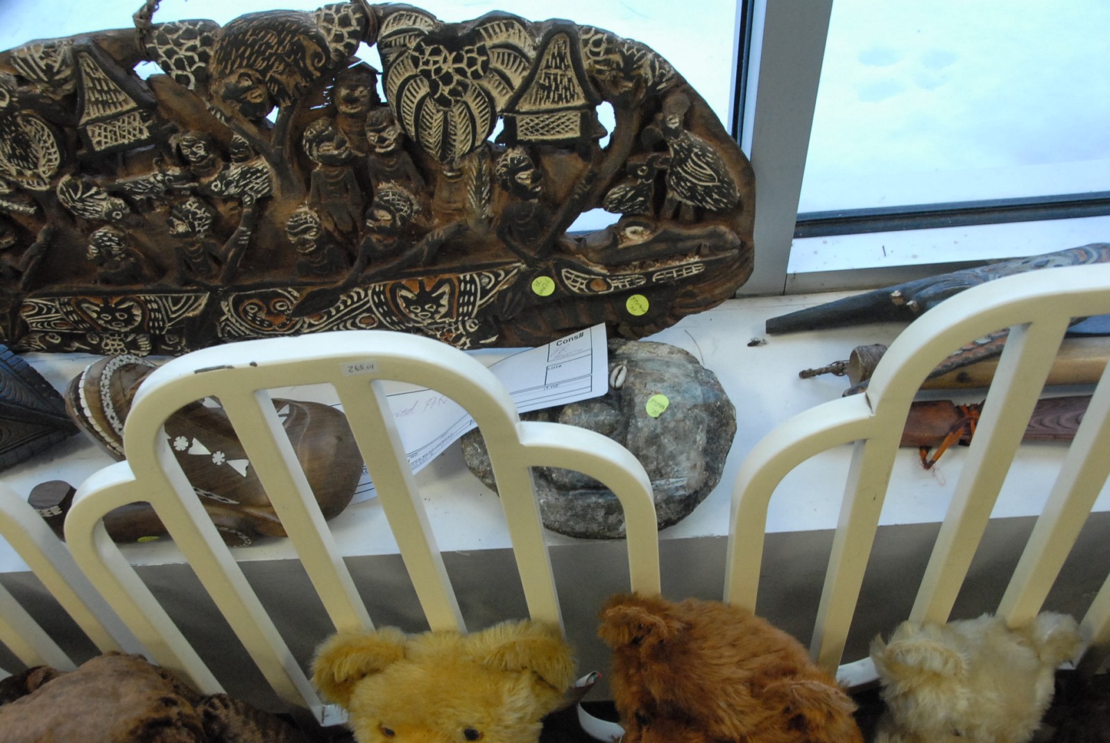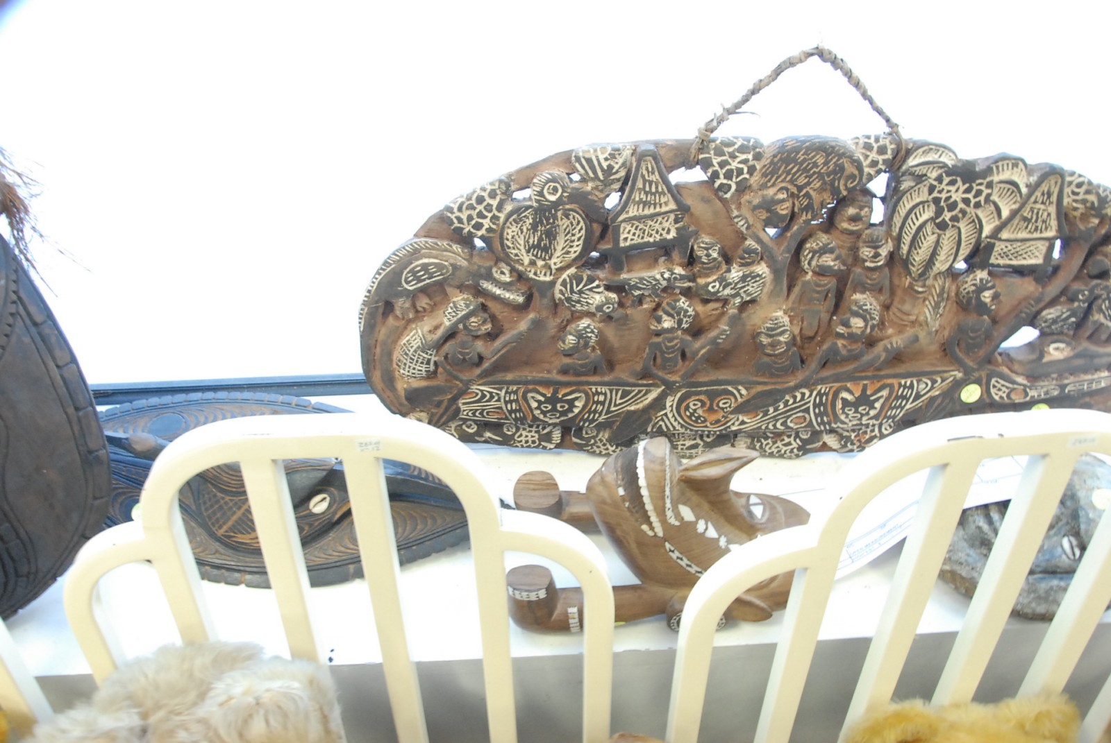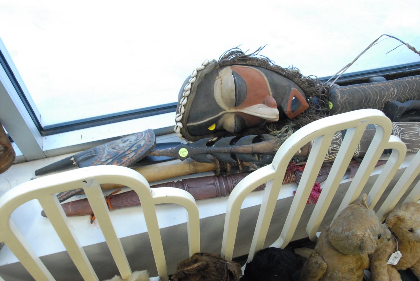 Large group of African pieces, masks, wall mount carvings, spears, misc pieces