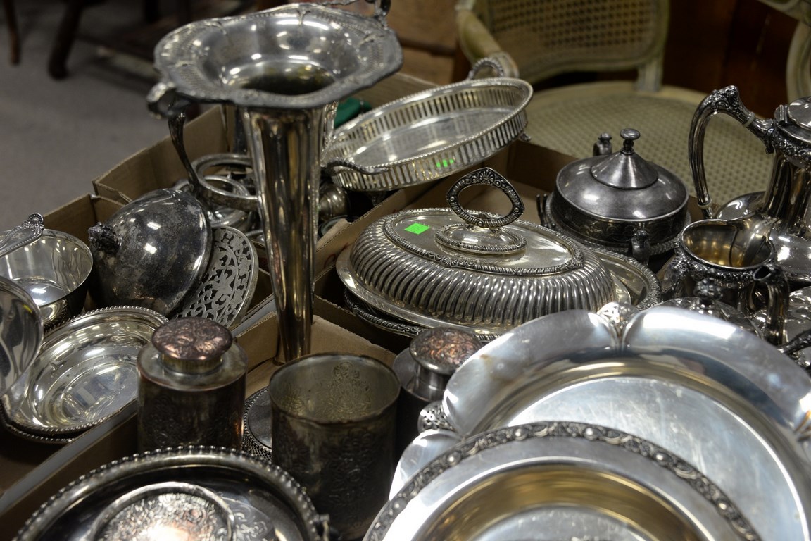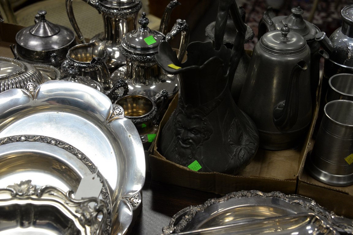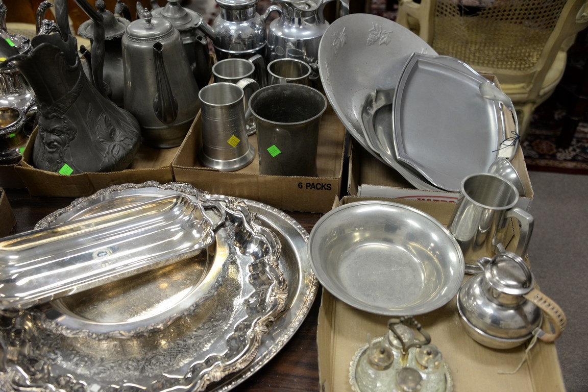 Lot 303: Large lot of silverplate plate and pewter to include trays, serving dishes, vases, pitchers, bowls, flatware, etc.