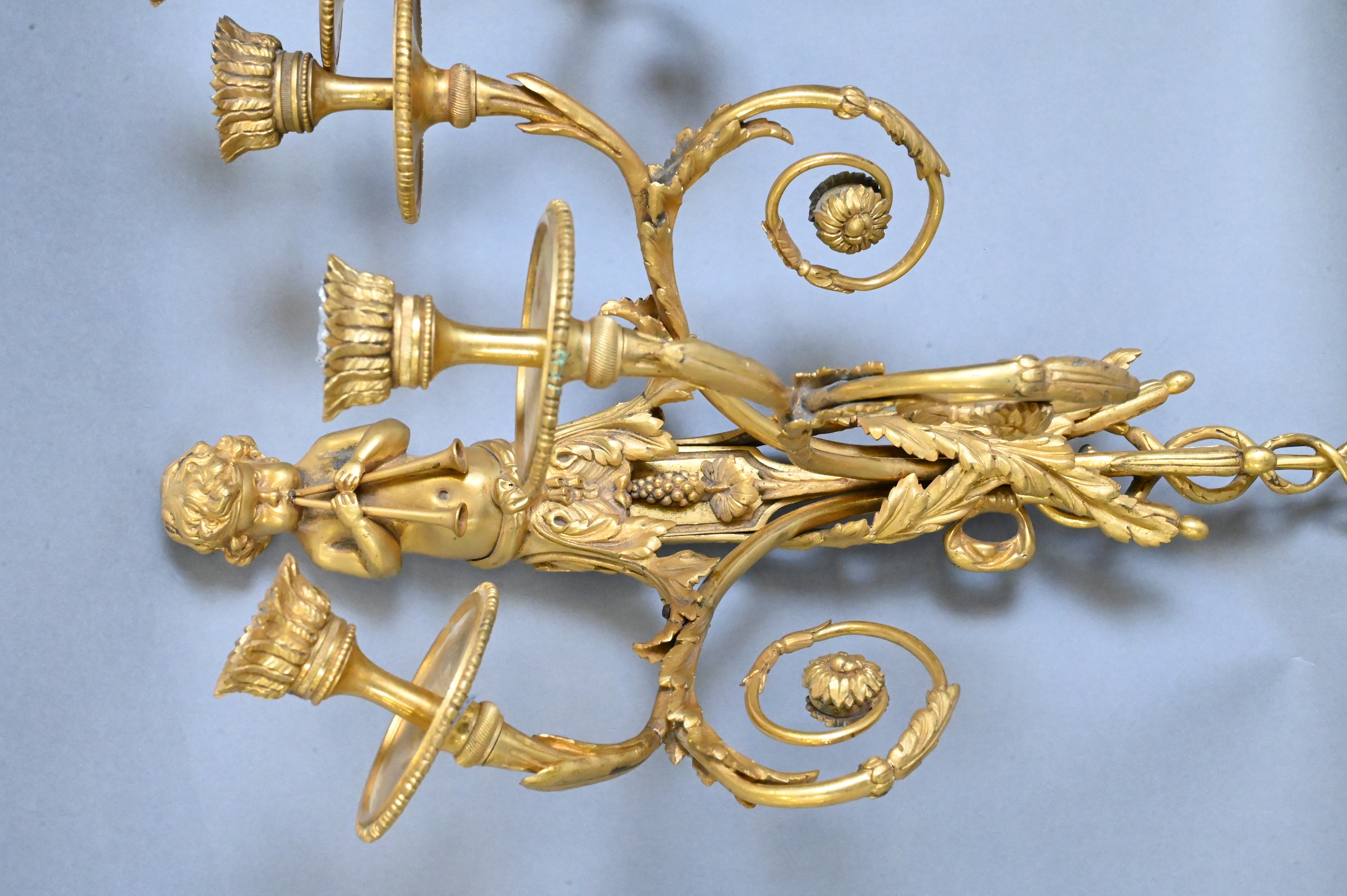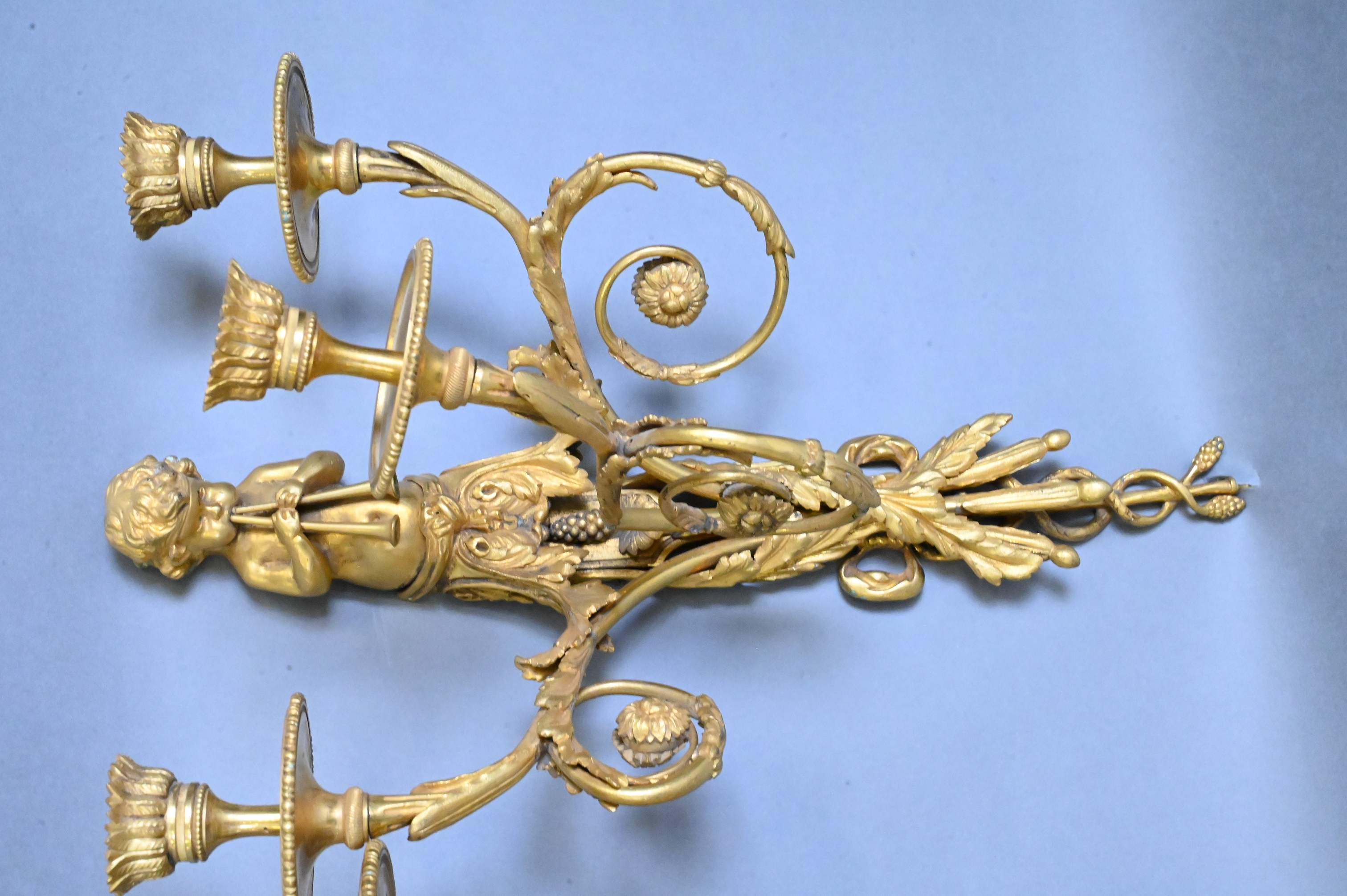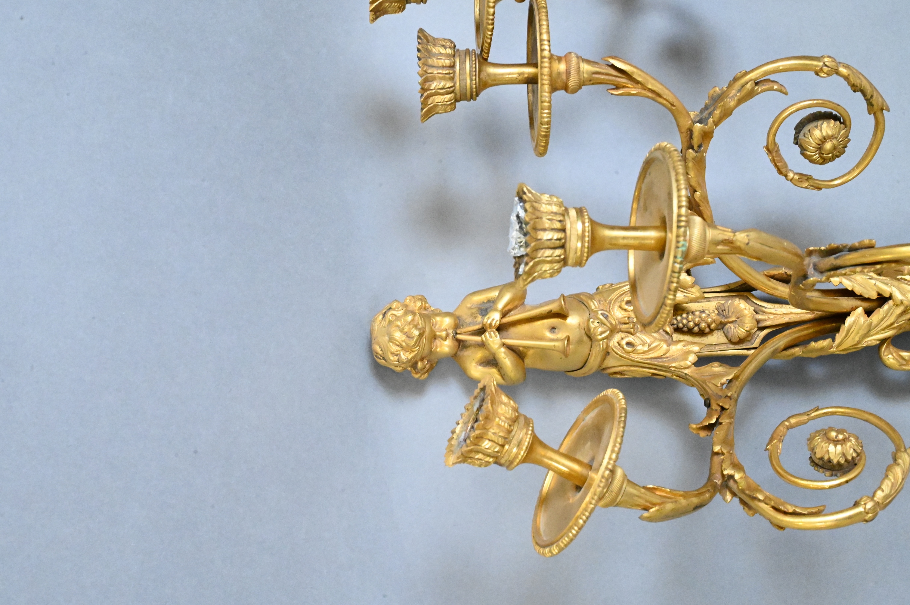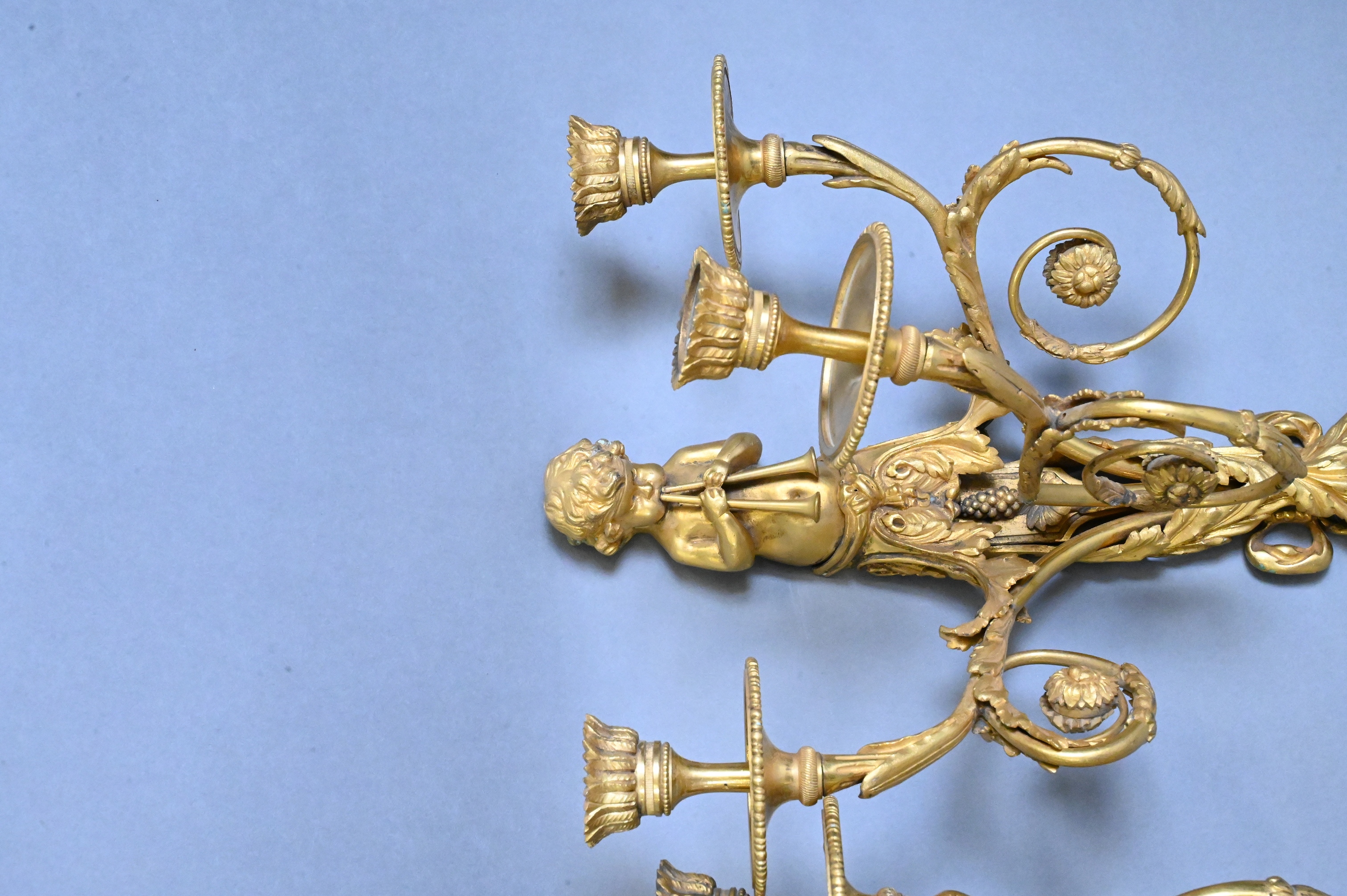 both featuring center putti playing double flutes extending out to three scrolling foliate arms over bowtie and ribbon black plate