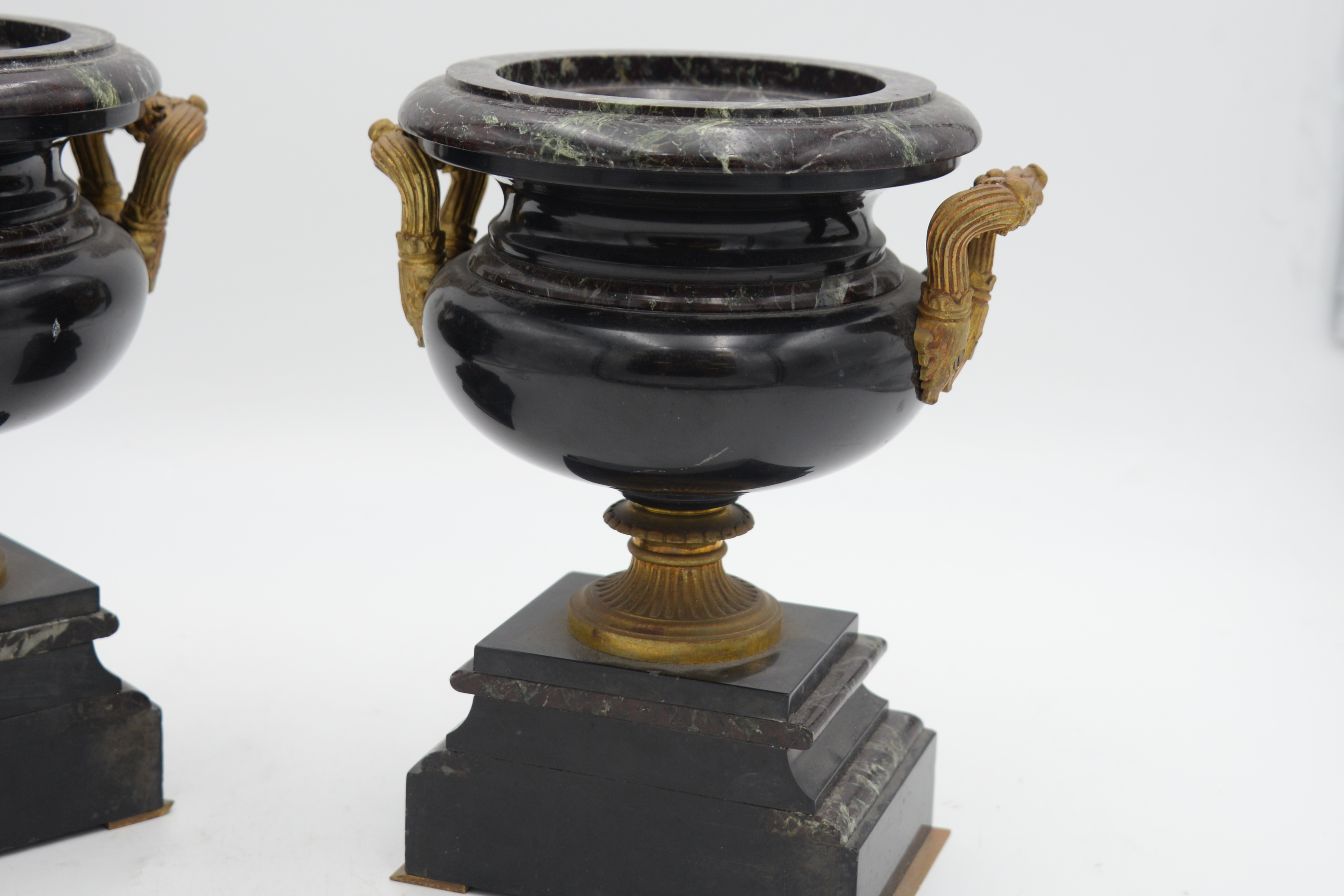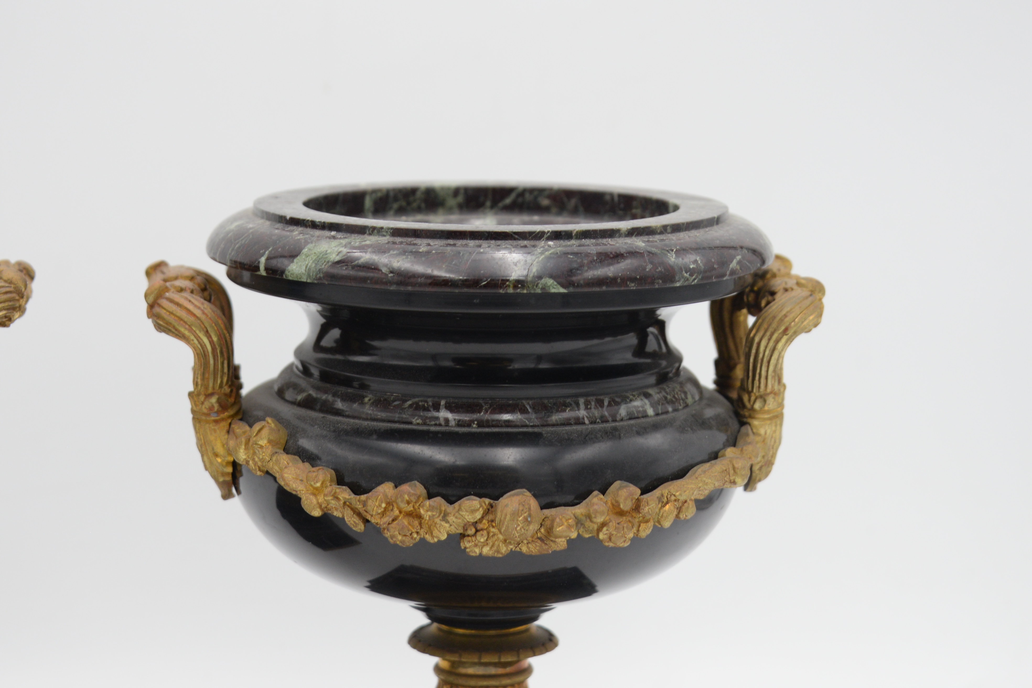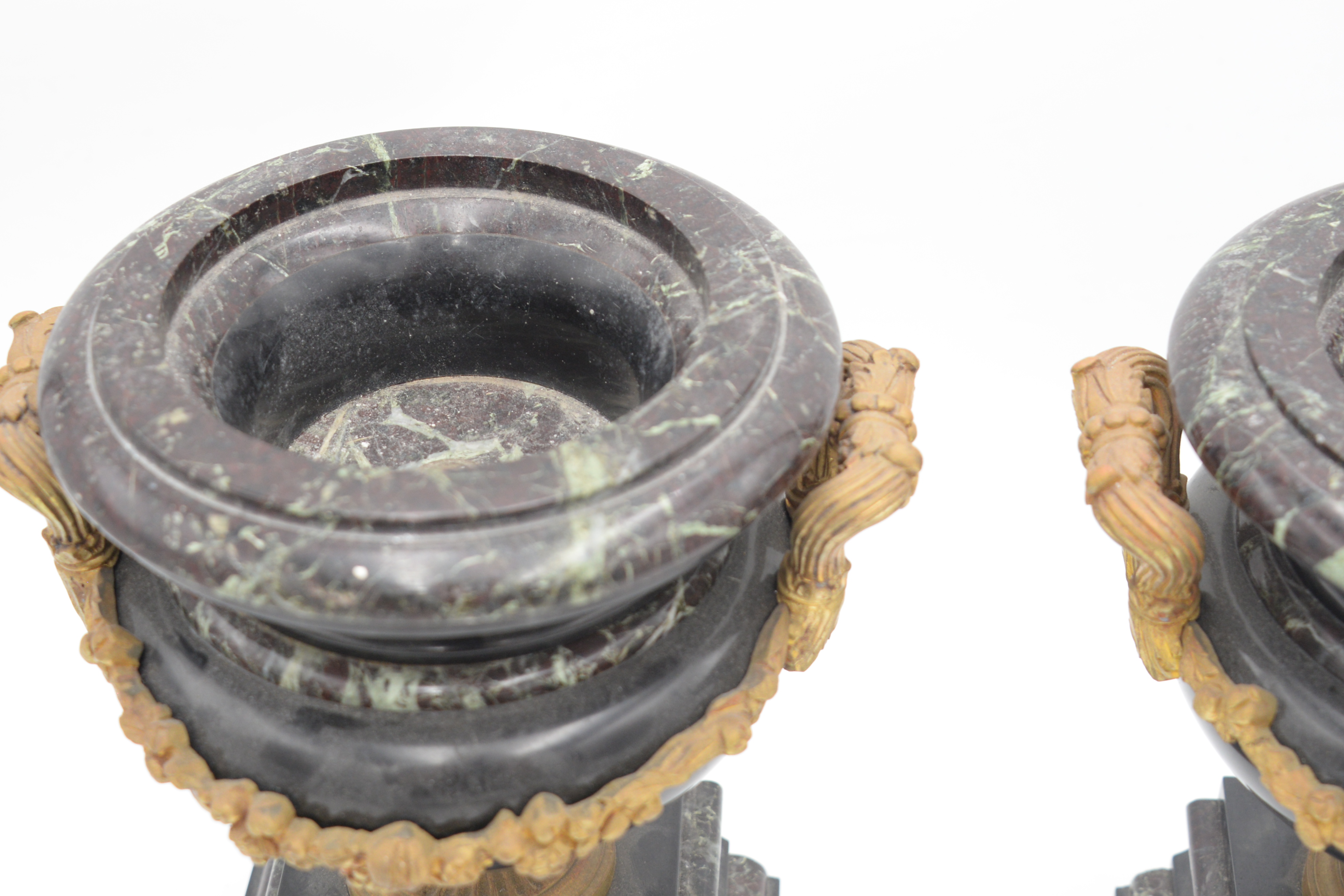 Pair Of Neoclassical Rouge Marble Tazza Urns, 19th century, made of slate and marble, with bronze mounted handles and floral wreath on pedestal base, height 9 1/2 inches
