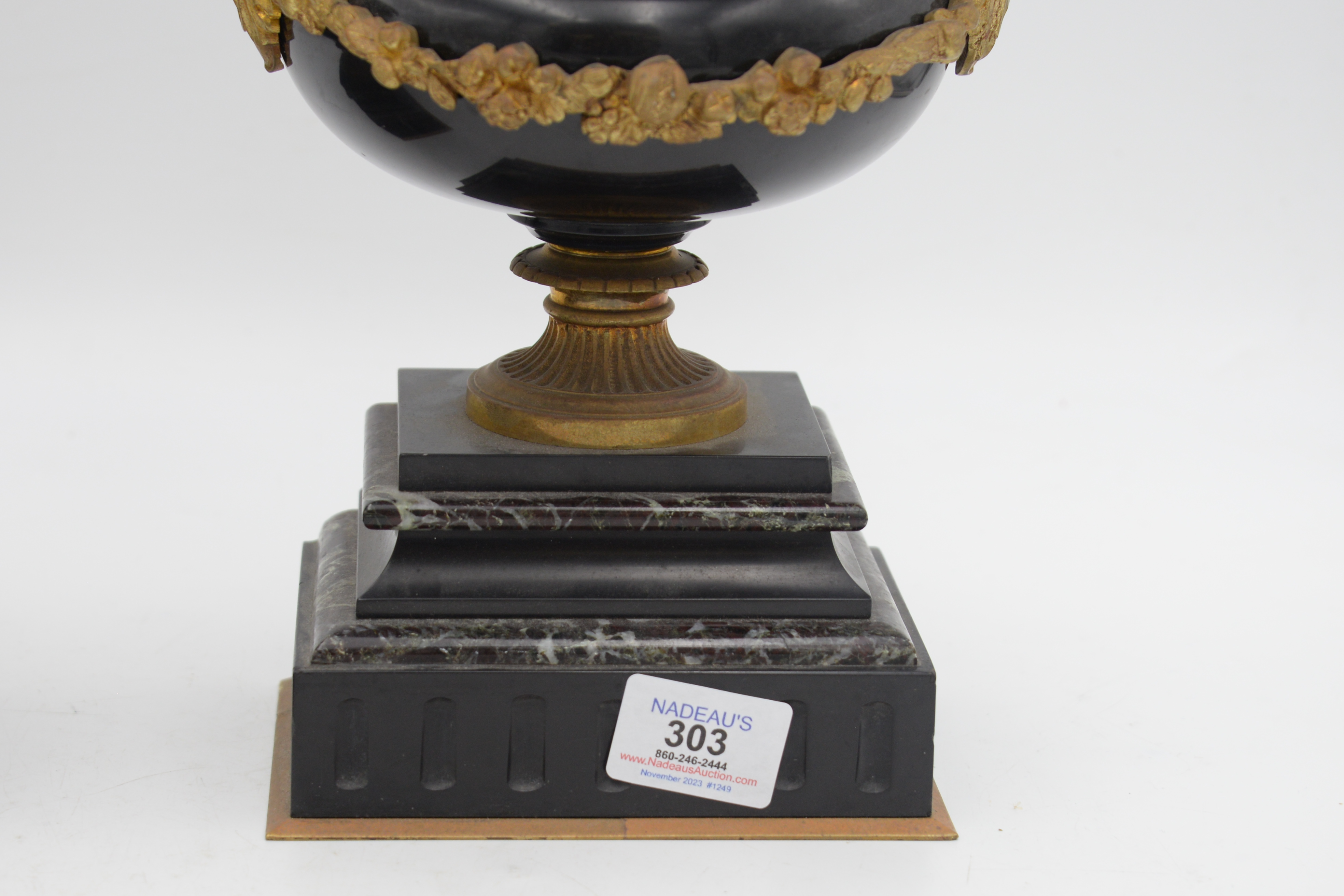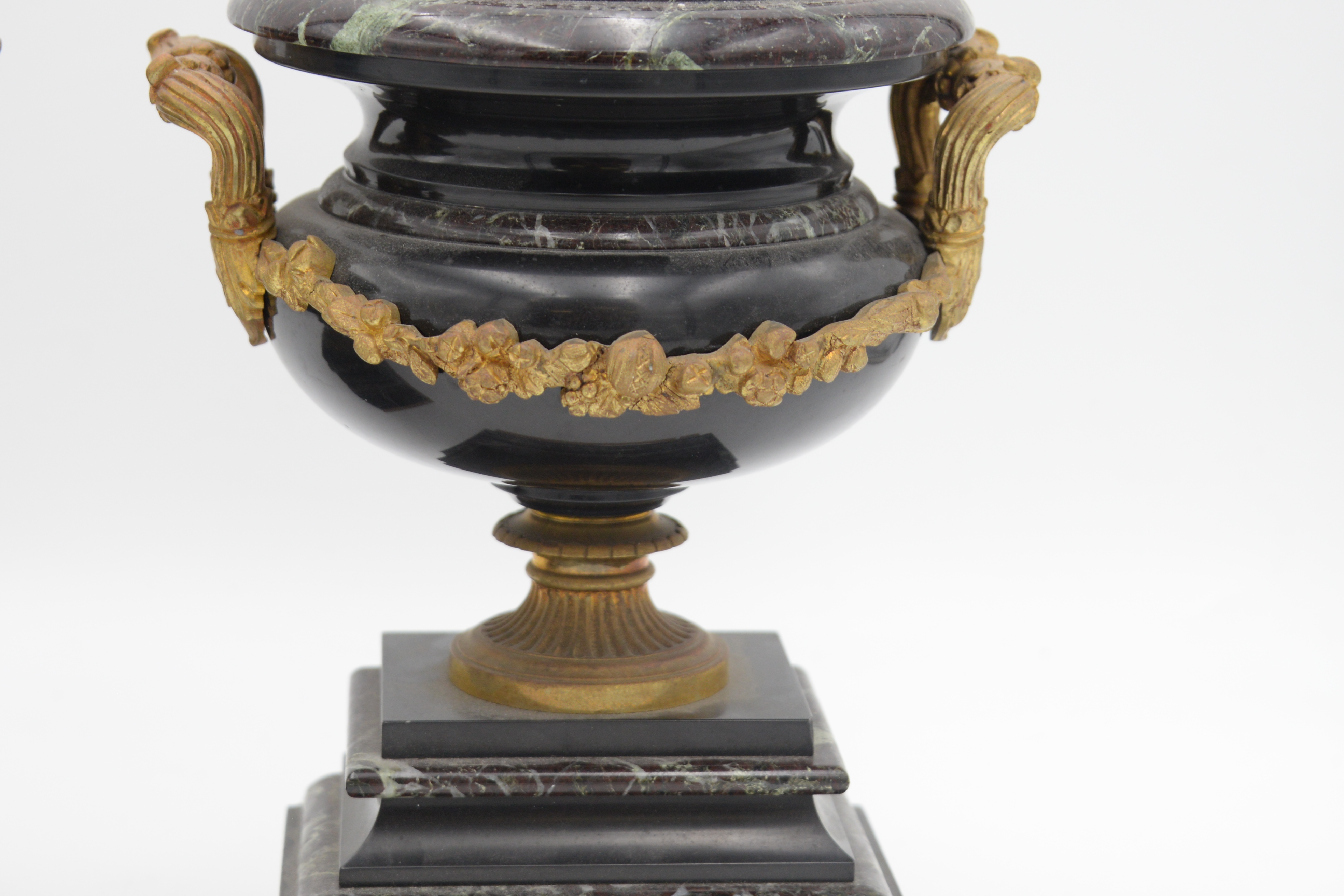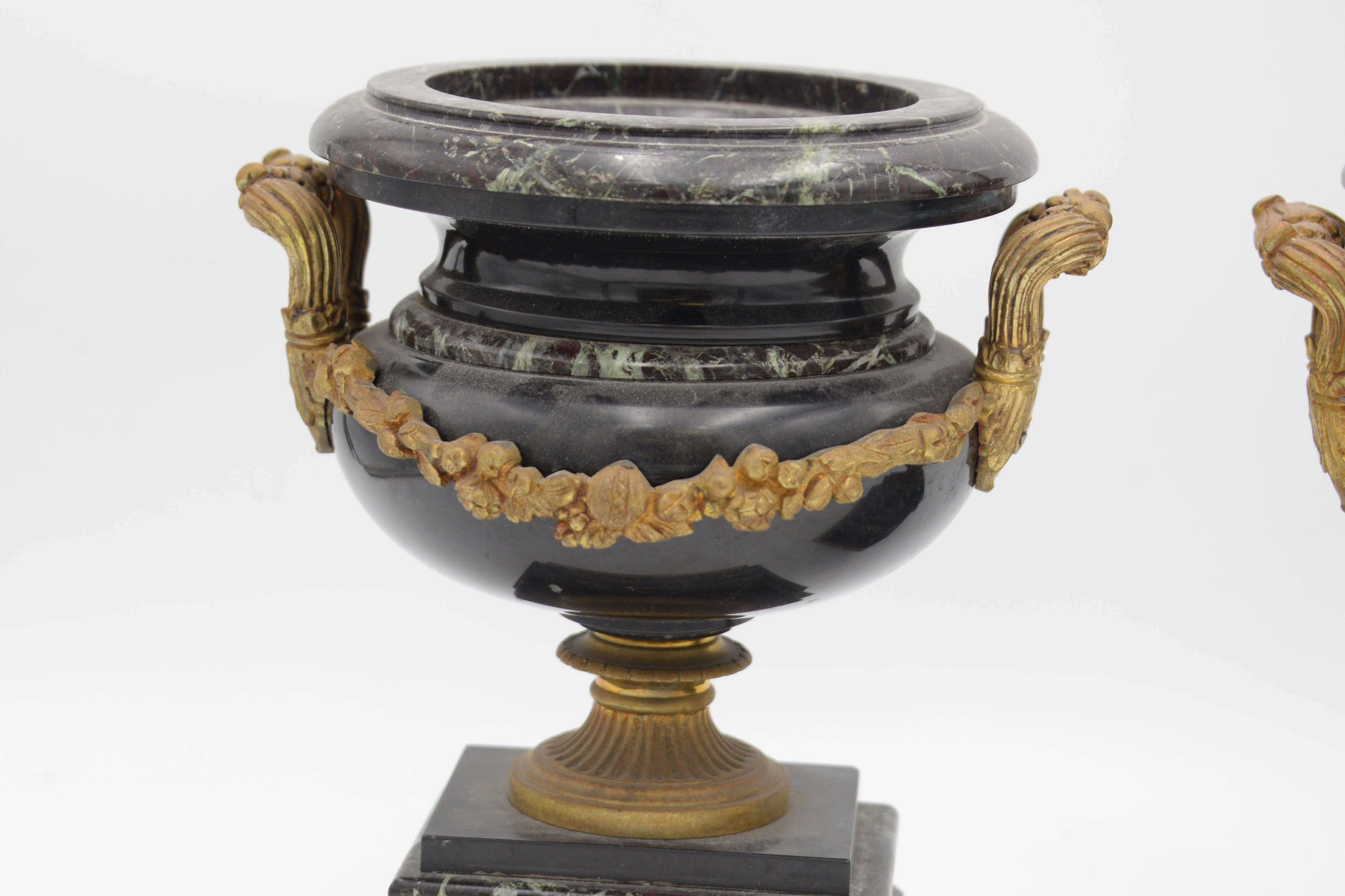 Pair Of Neoclassical Rouge Marble Tazza Urns, 19th century, made of slate and marble, with bronze mounted handles and floral wreath on pedestal base, height 9 1/2 inches