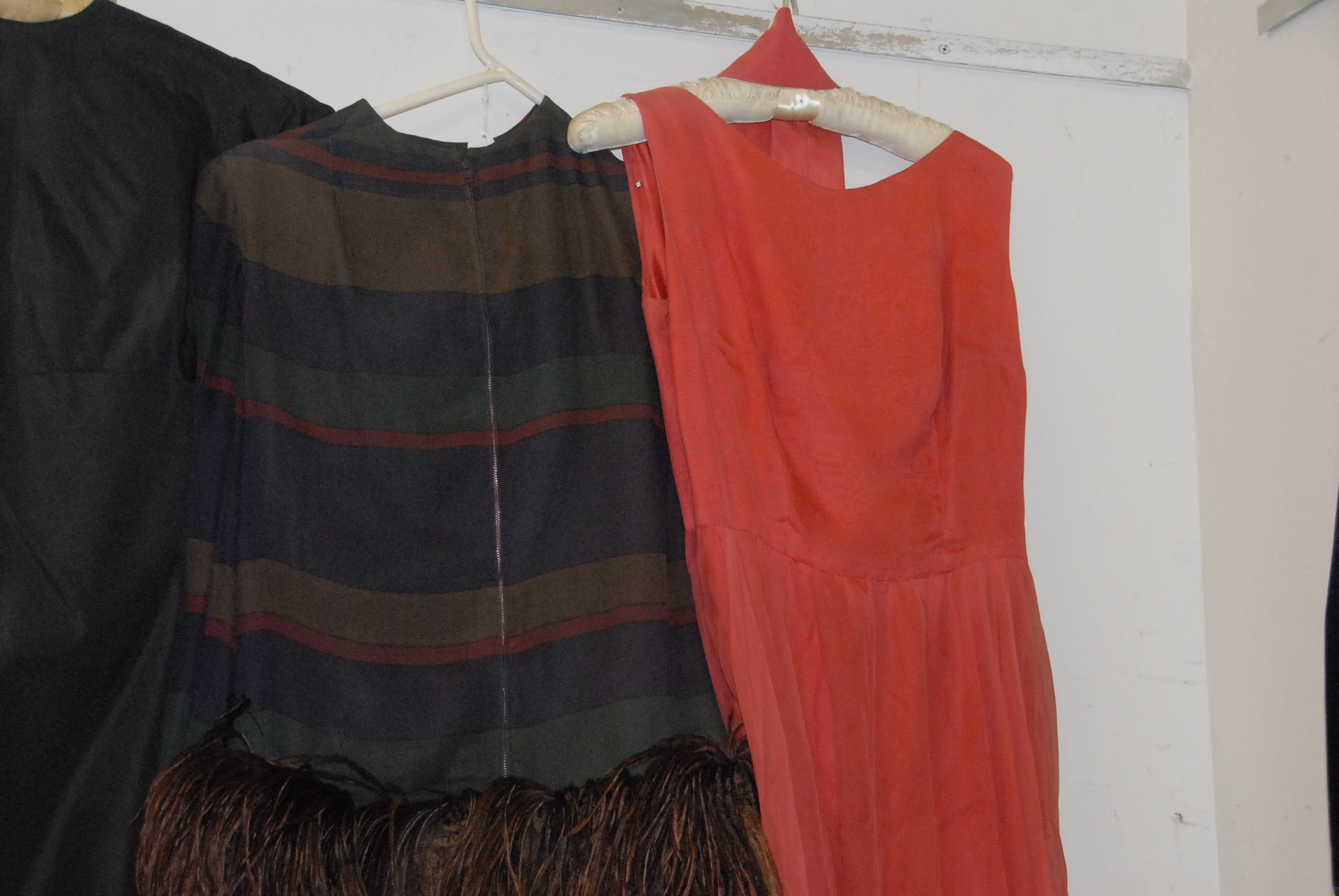 Seven piece lot including purple evening gown with matching cape full length, evening dresses and two piece set with pants and top with feathers.
