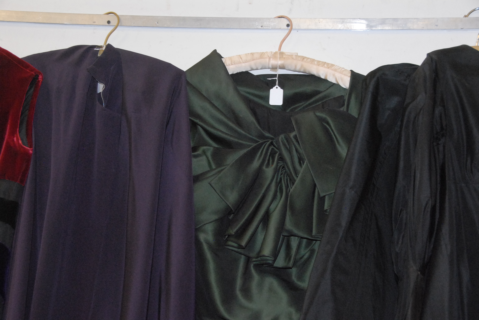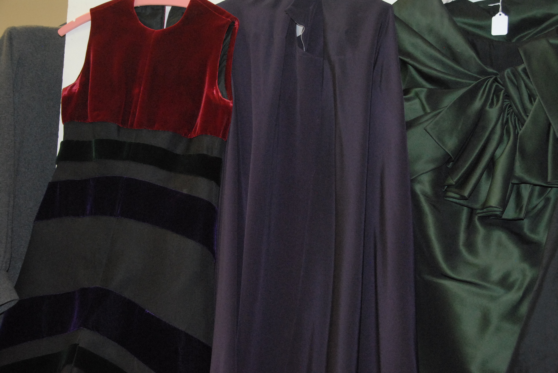 Lot 303: Seven piece lot including purple evening gown with matching cape full length, evening dresses and two piece set with pants and top w…