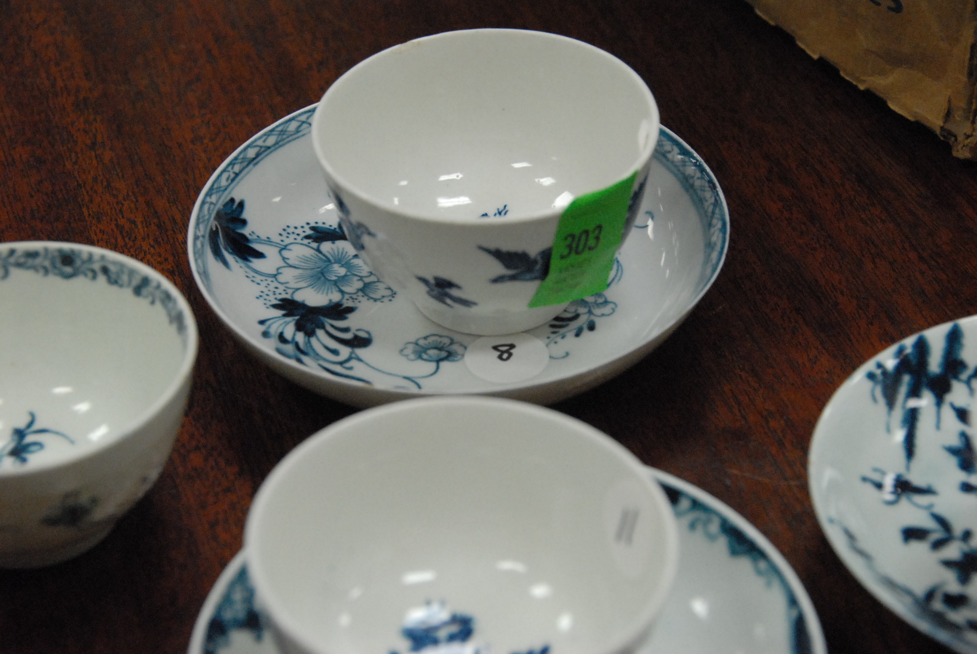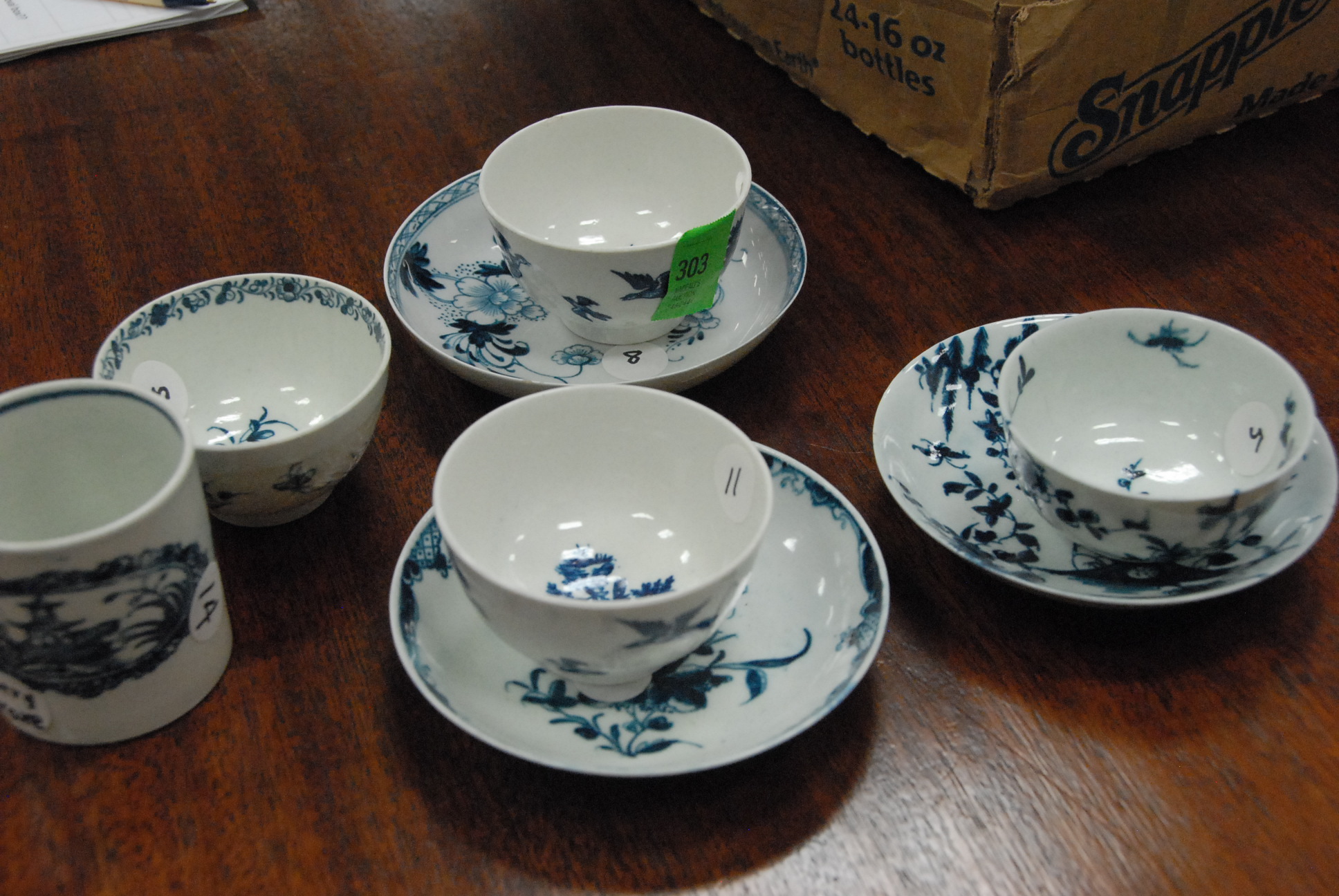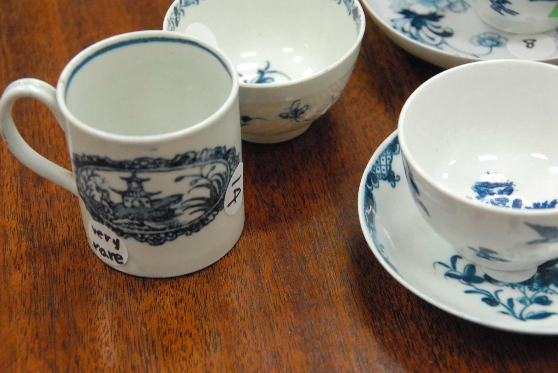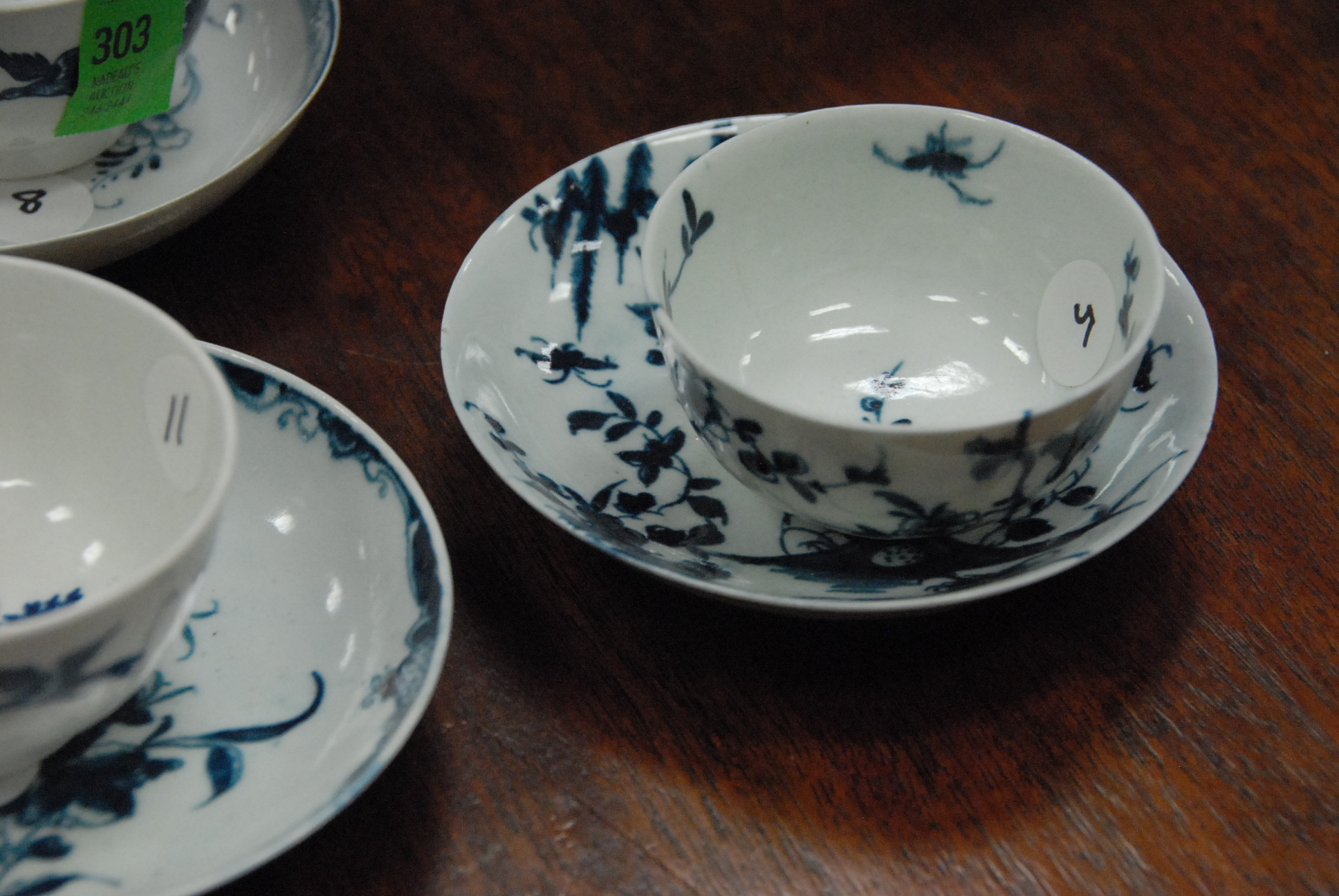 Three Worcester saucers and five cups, one marked Pennington, one chipped cup.