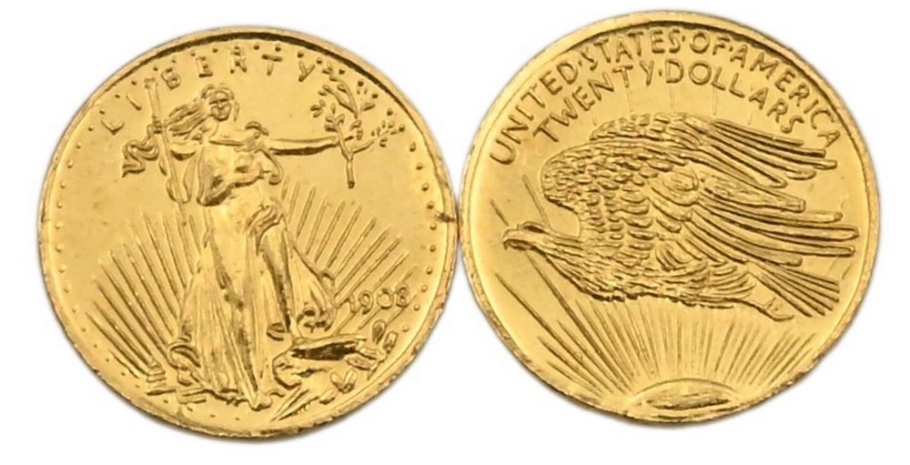 Lot 303: Two miniature replicas of 1908 Saint Gaudens Twenty Dollar Gold Pieces, marked United States of America Twenty Dollars Liberty 1908,…