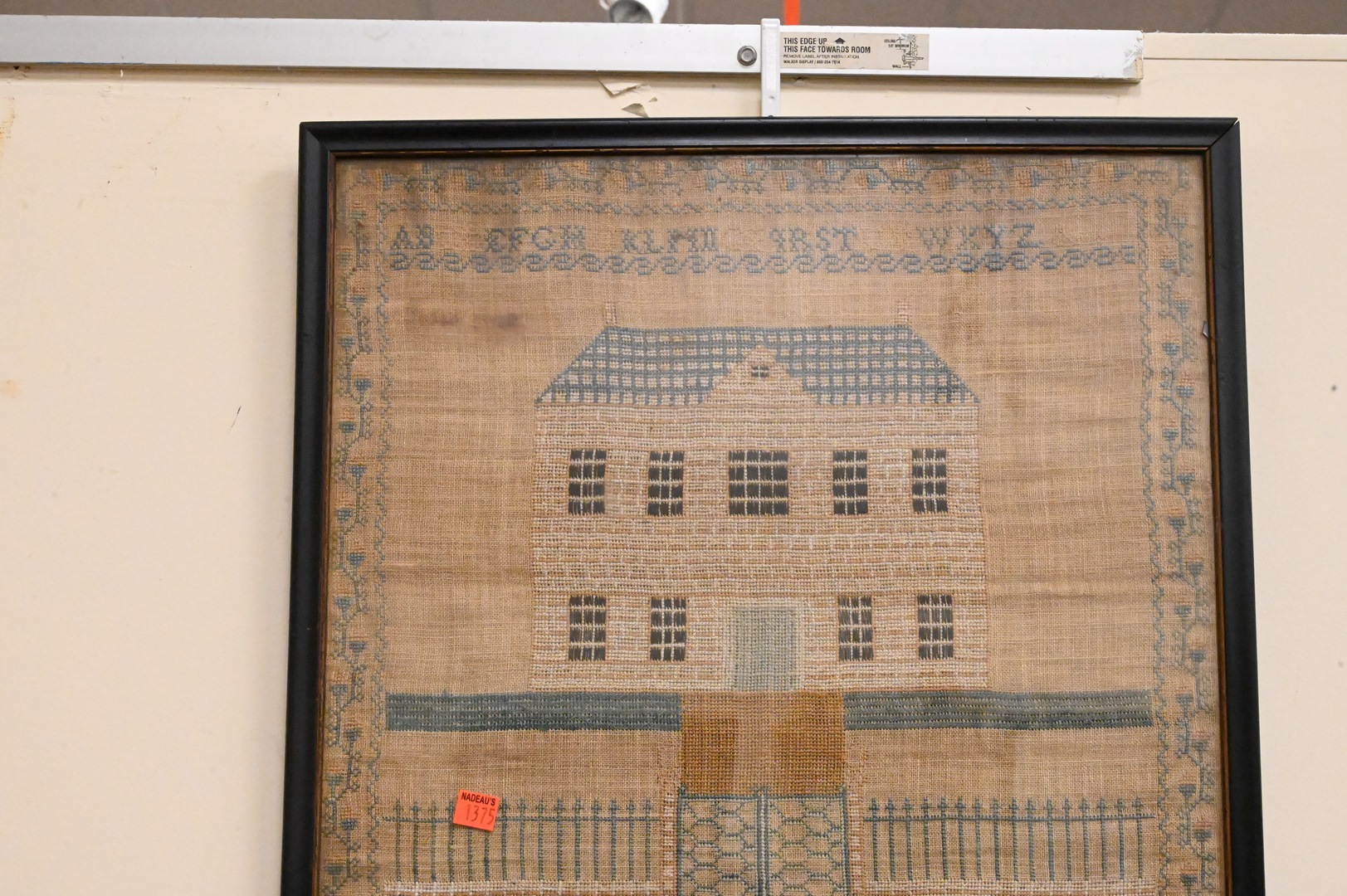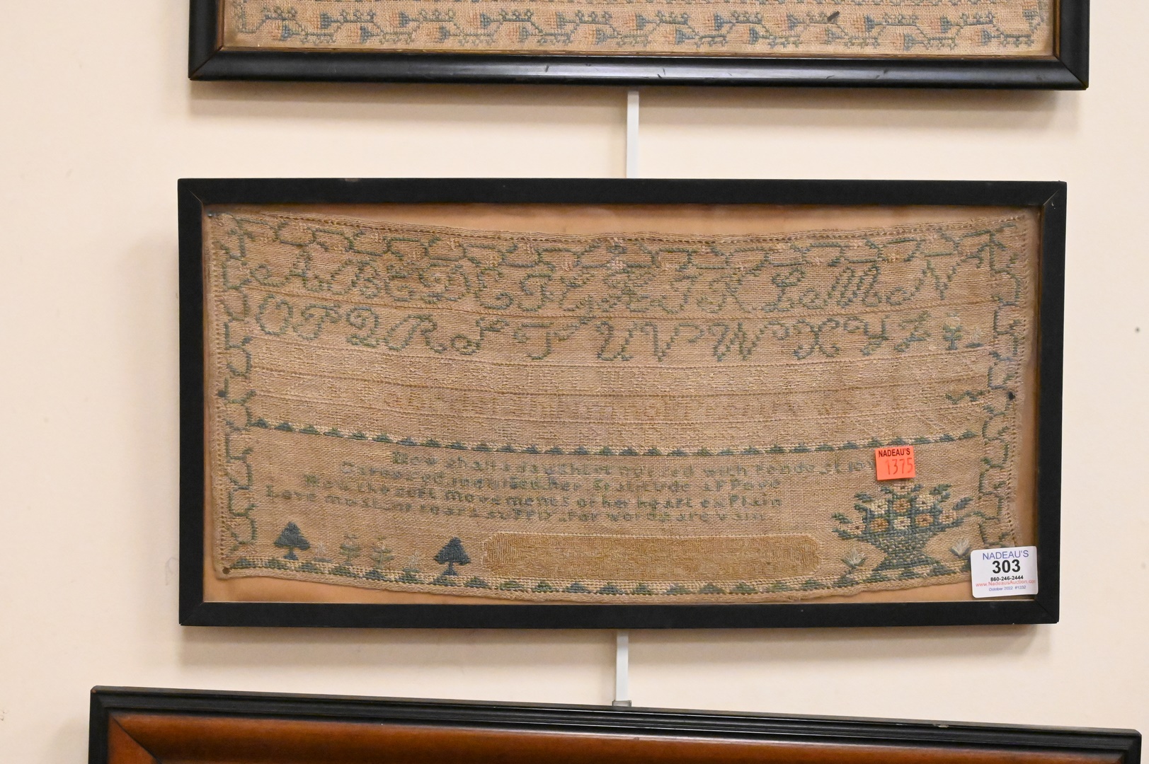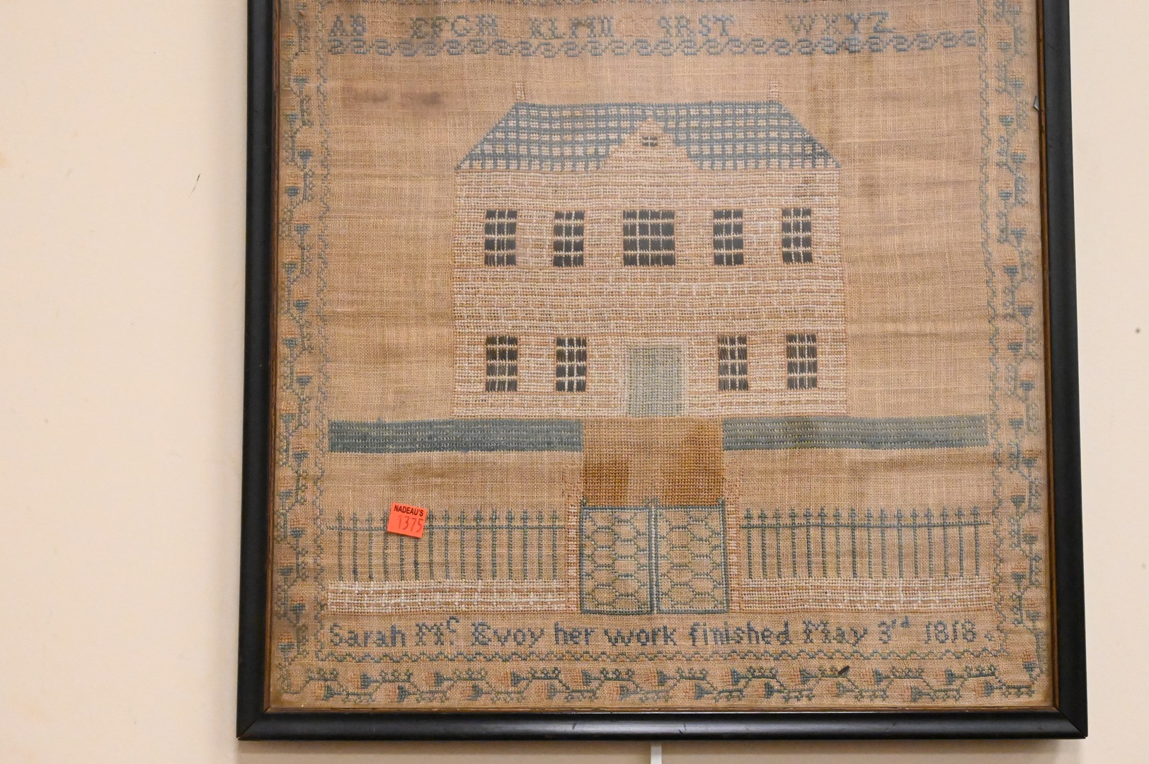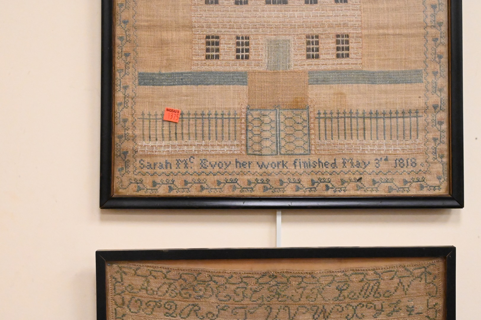 Two Needlework Samplers, to include one having house, Sarah McEvoy, May 1818, 17″ x 17 1/2″; along with one marked Rachael _____, 18___, 7 1/2″ x 17″, (illegible)Provenance: Estate of Cyril H. Moore Jr, Kent, Connecticut.