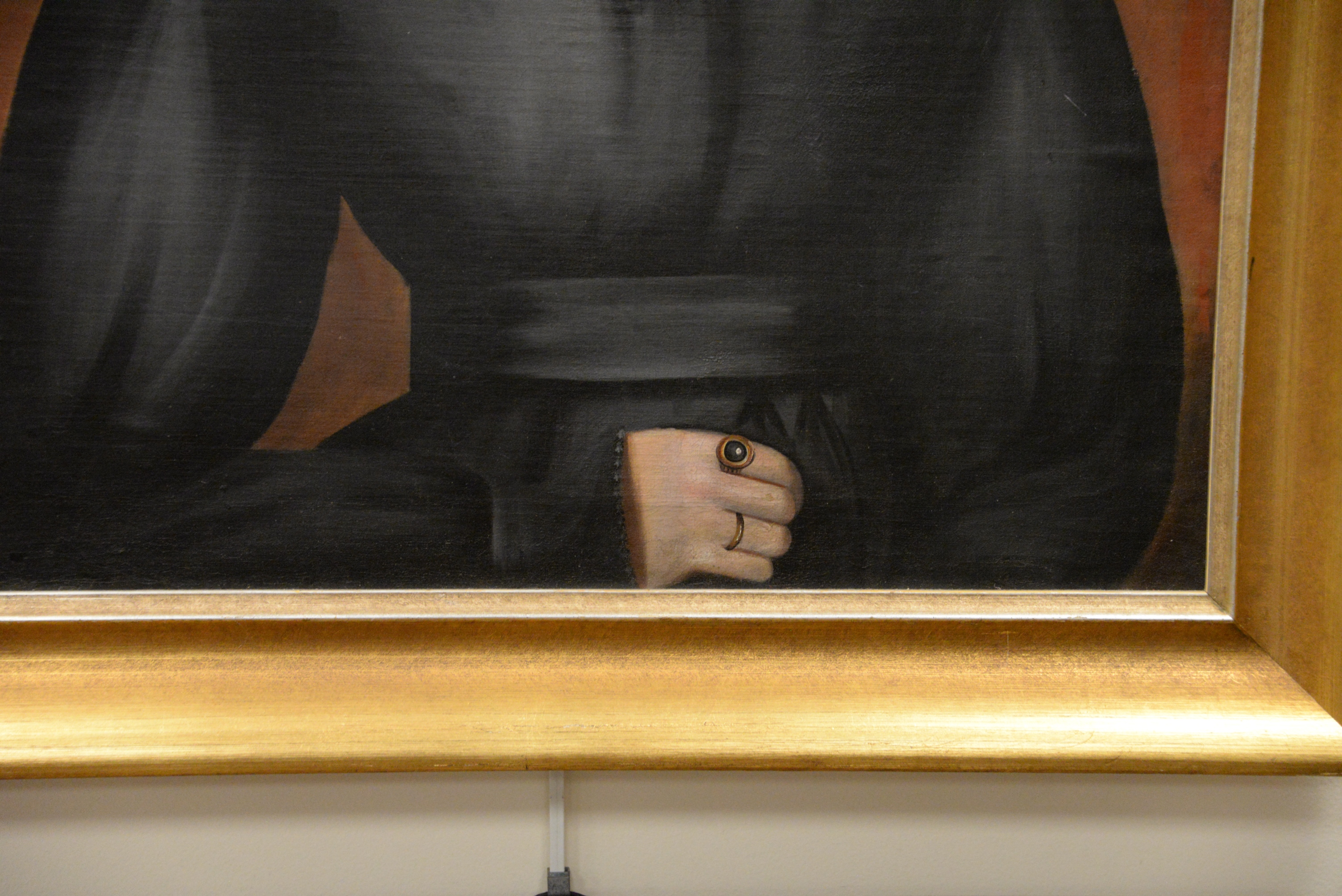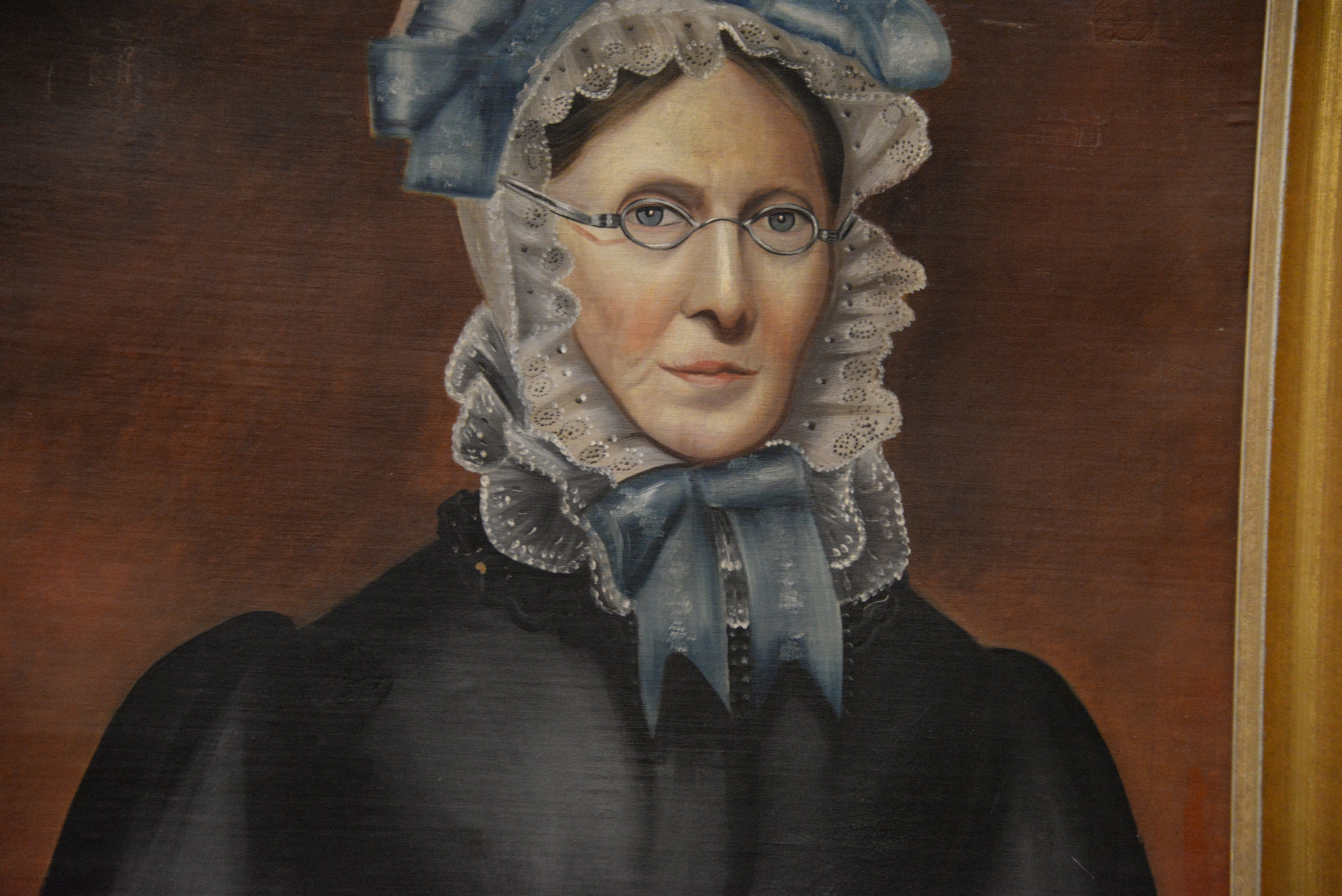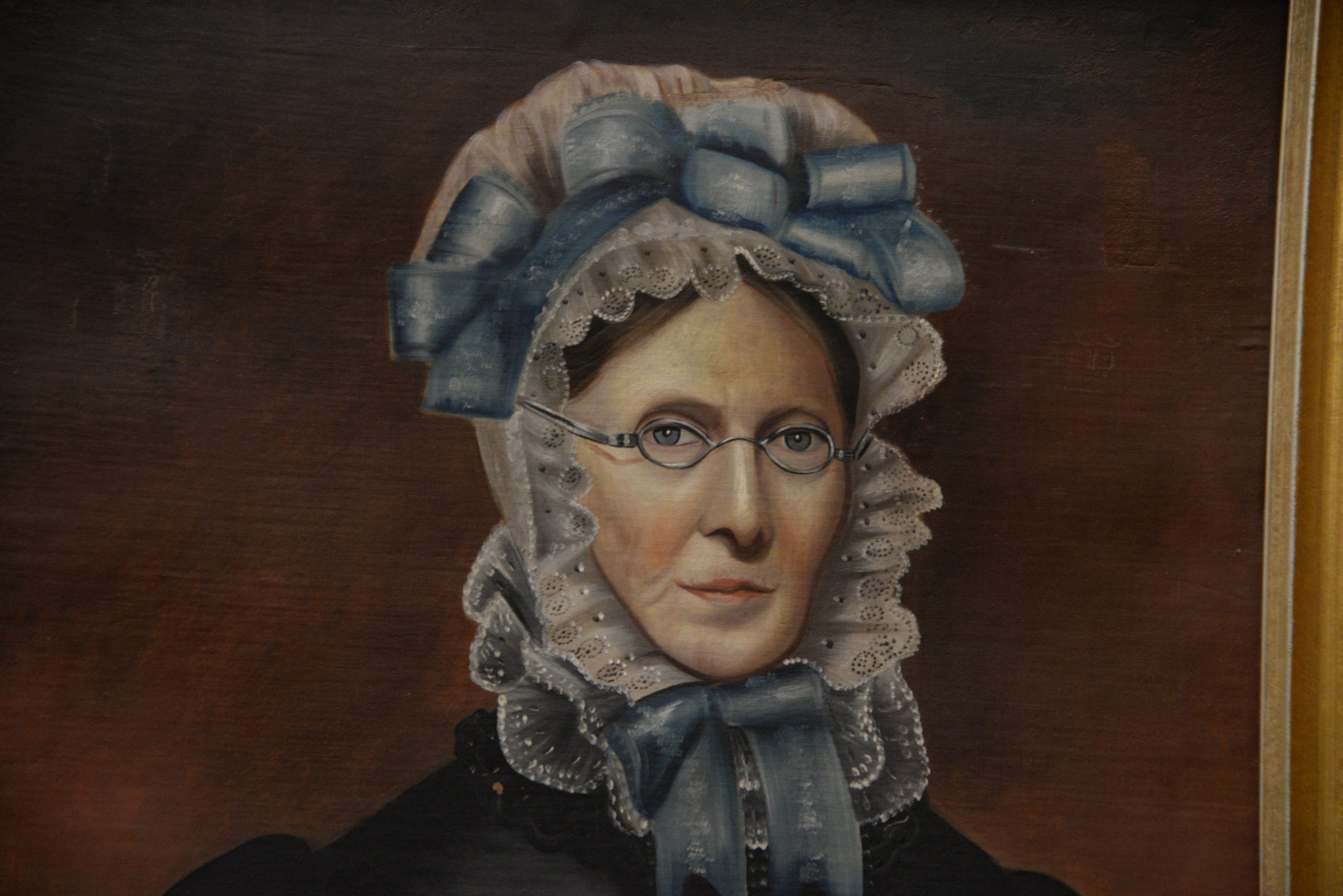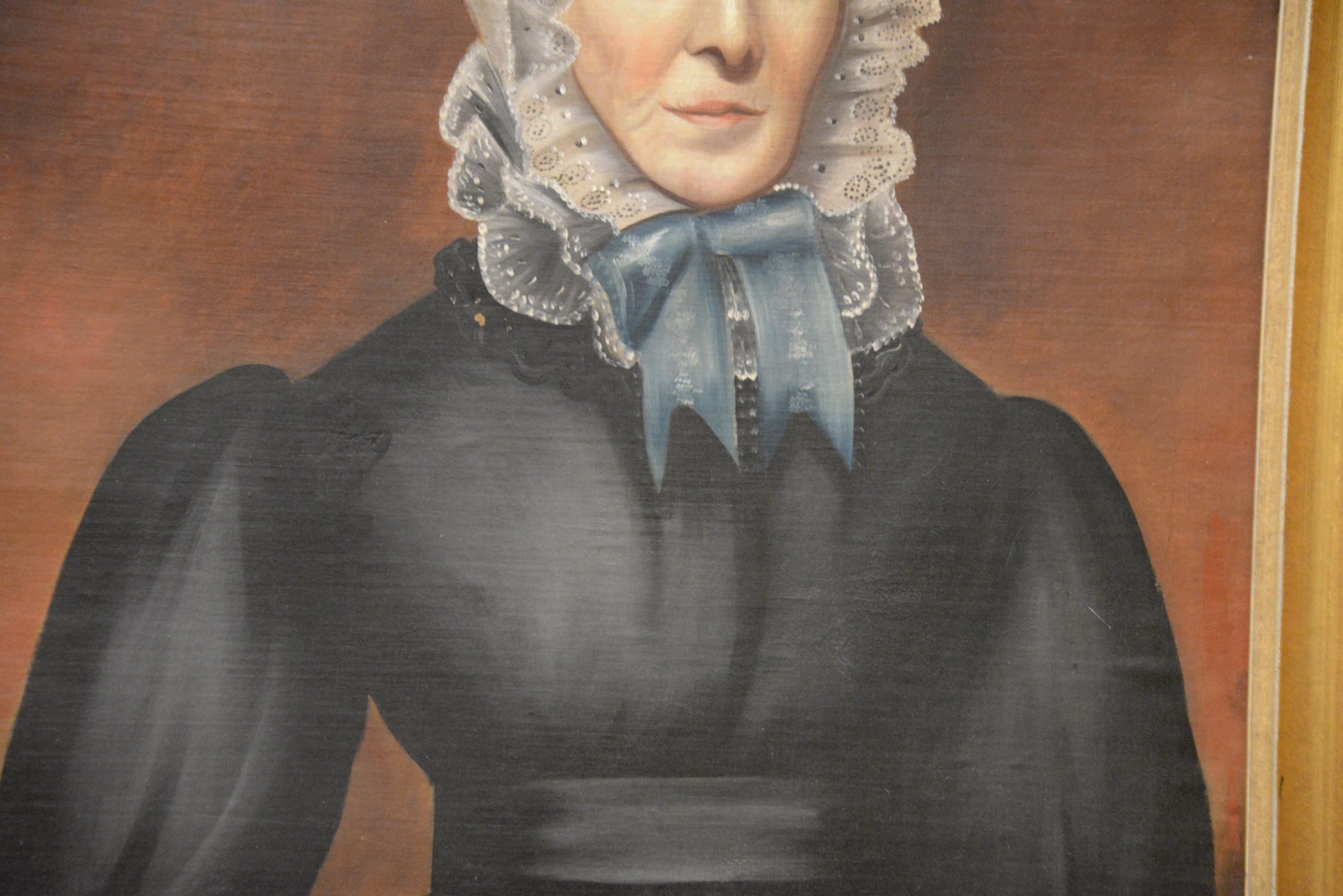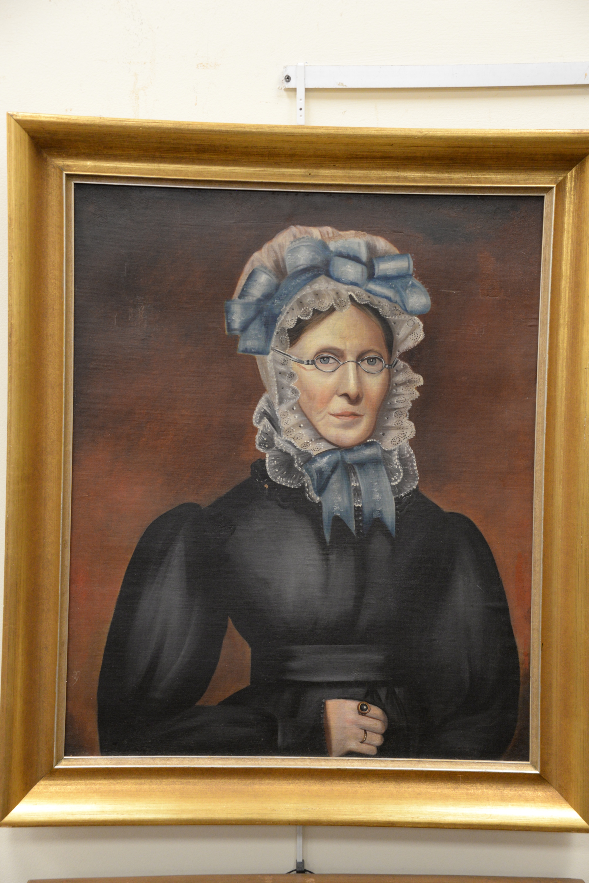 Unknown American Folk Artist early 19th century portrait on canvas unsigned 27″ x 22 1/2″. Provenance: Garfield Galleries label on back.