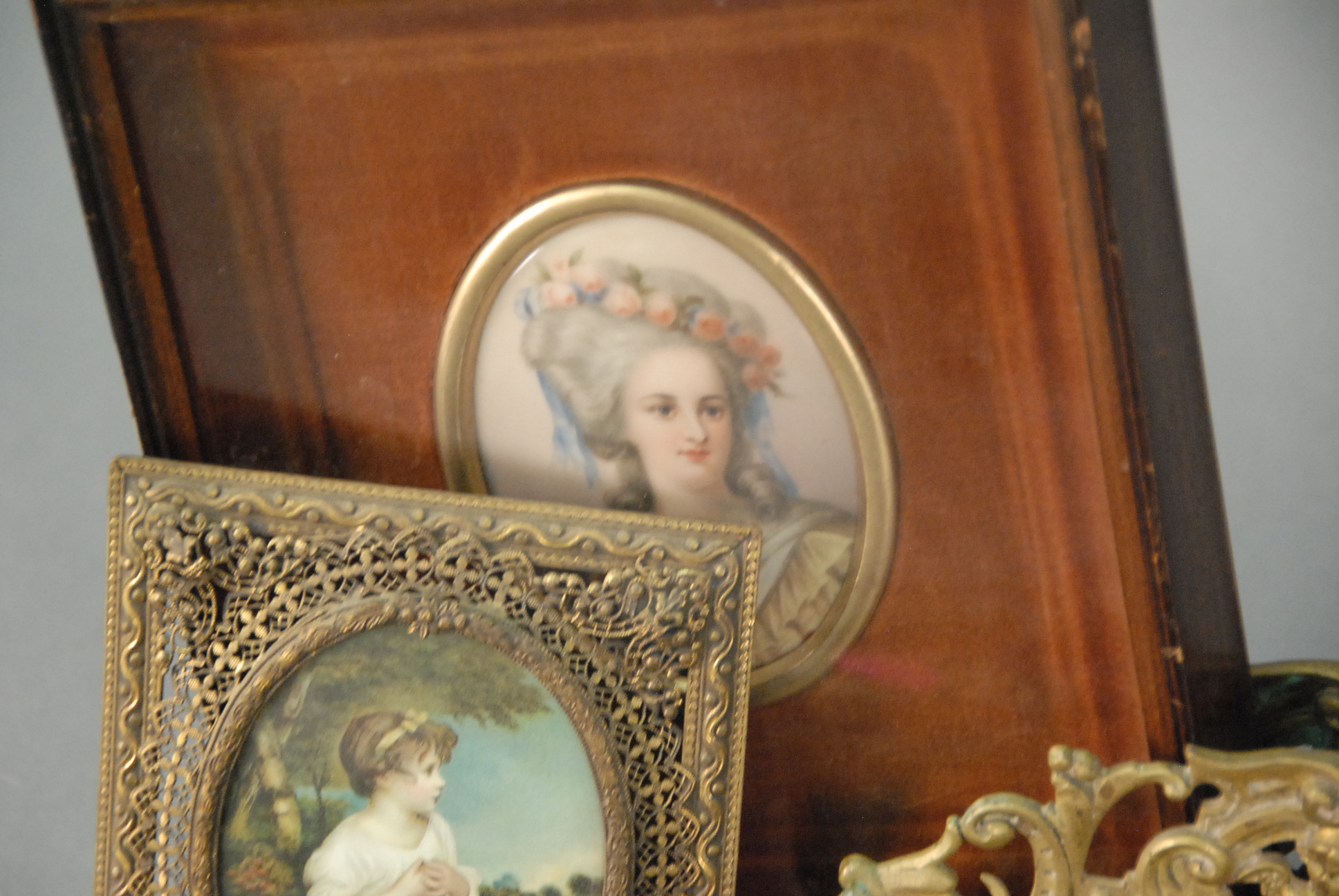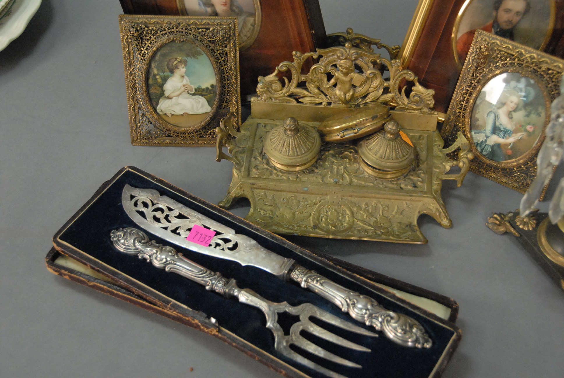 Lot 304: Box lot to include brass inkwell set, sterling handled serving pieces, and four framed miniatures one is painting on porcelain.
