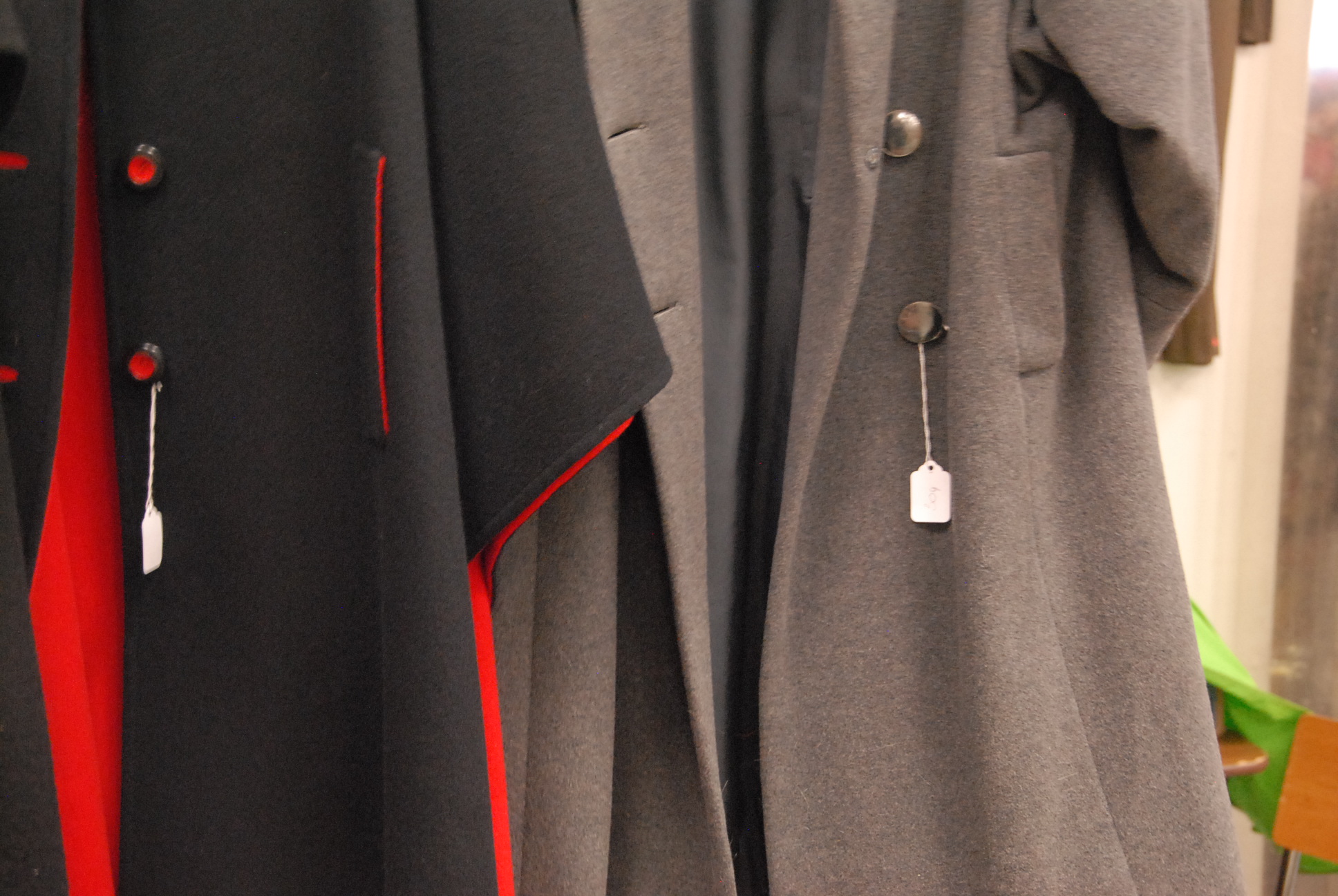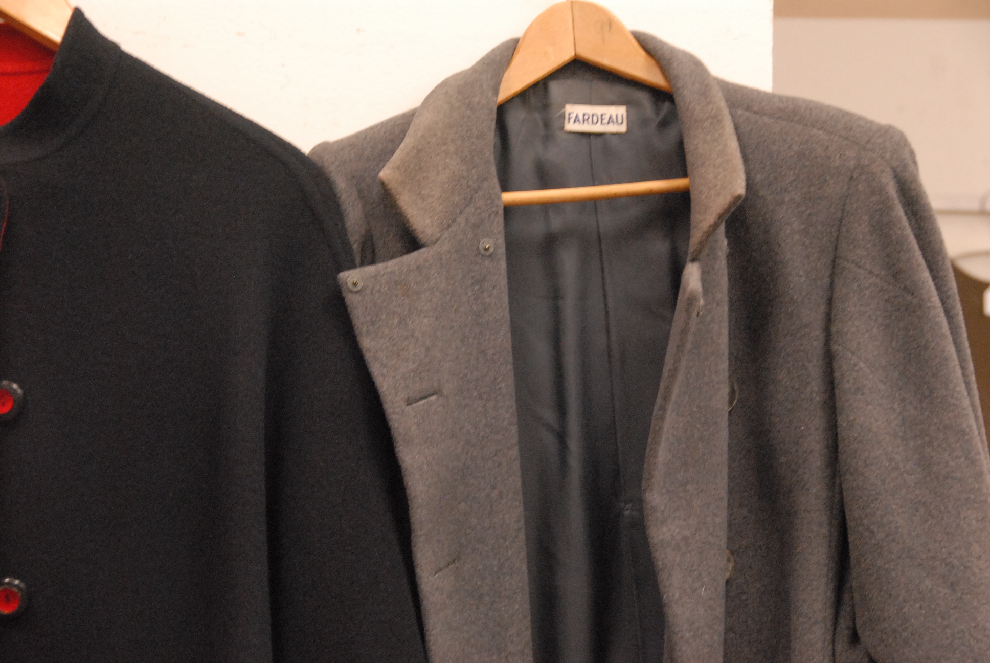 Lot 304: Four piece lot to include Fardeau coat, black wool wrap, coat made in Finland, and black wool wrap with red interior.