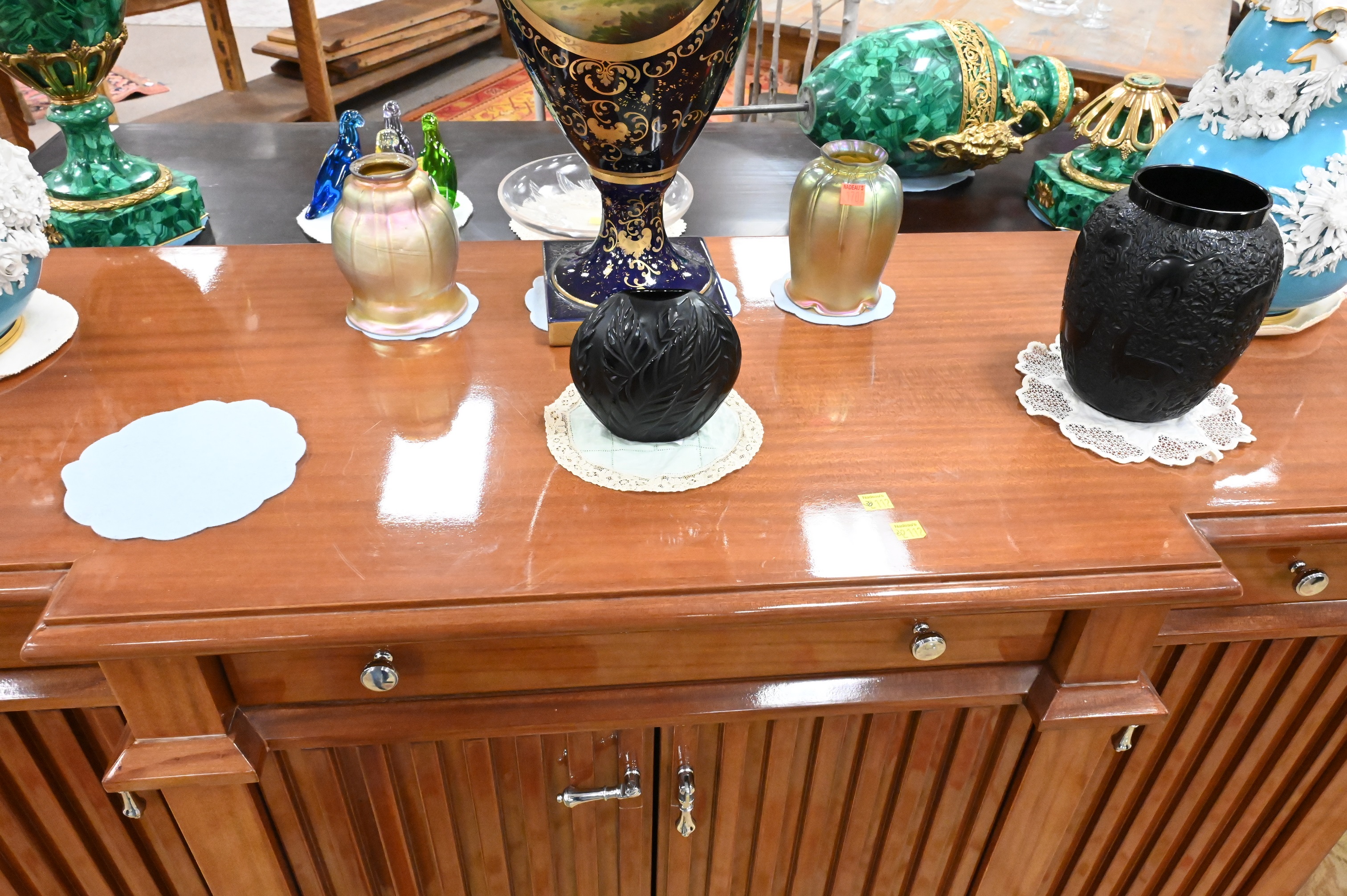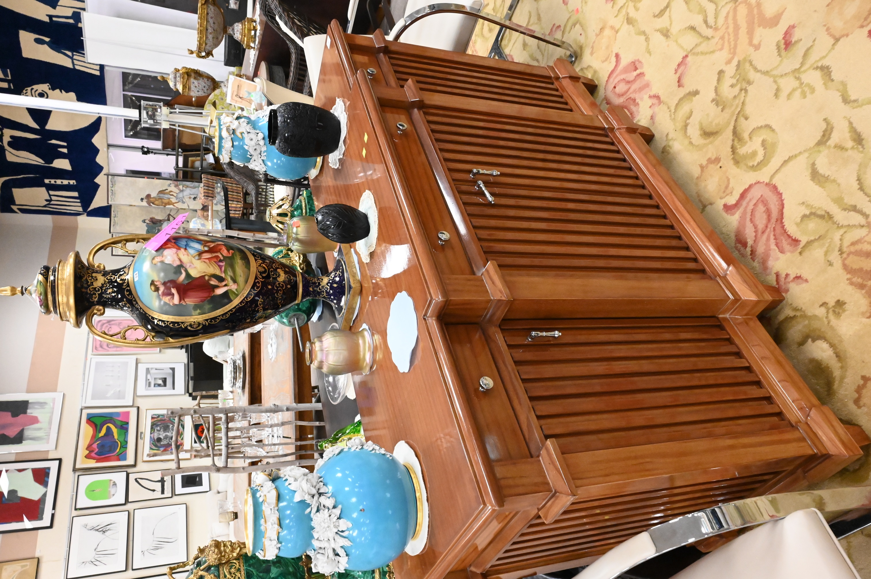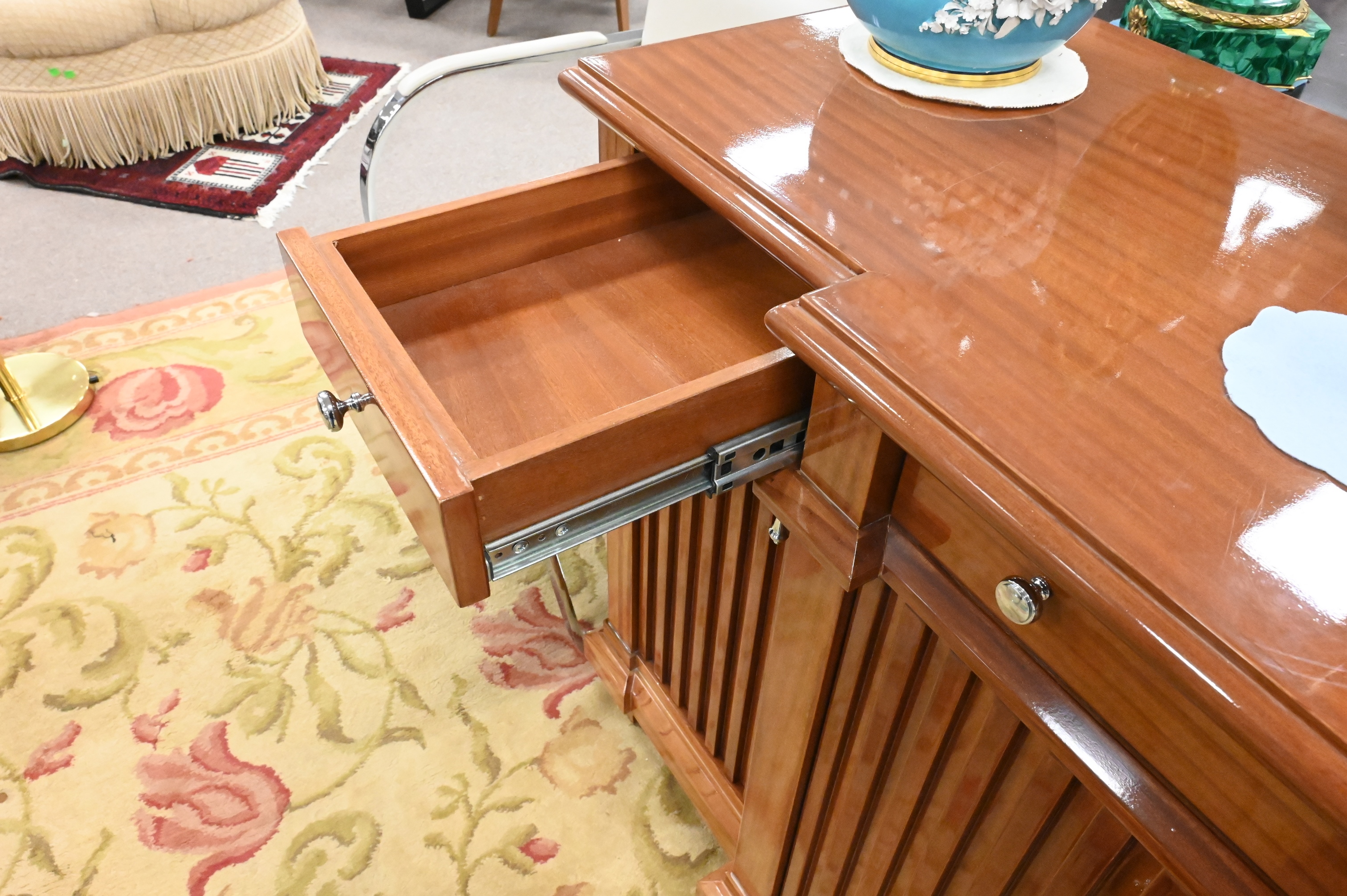 having three drawers over four doors on reeded front