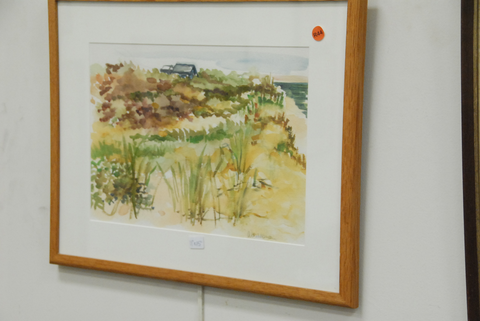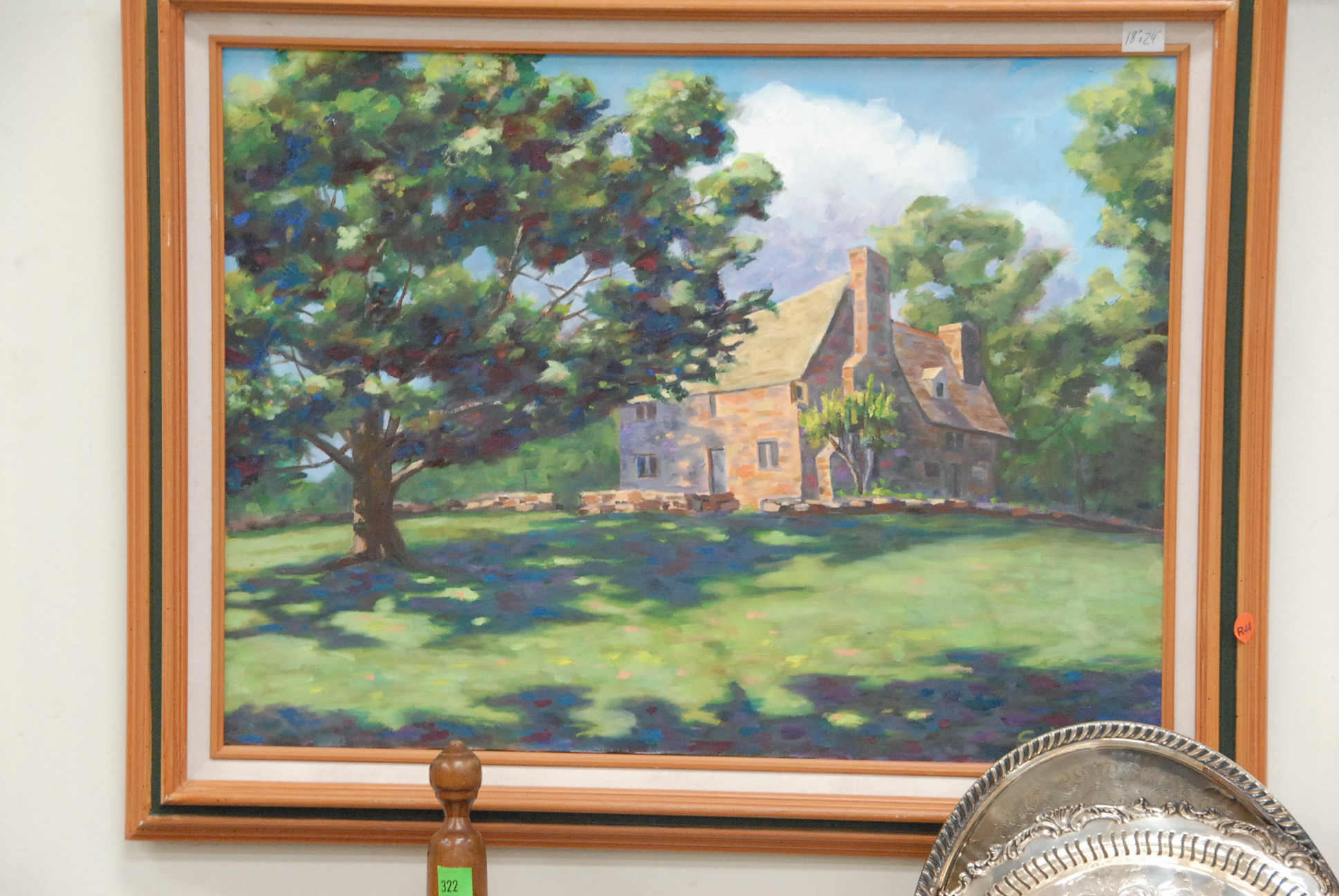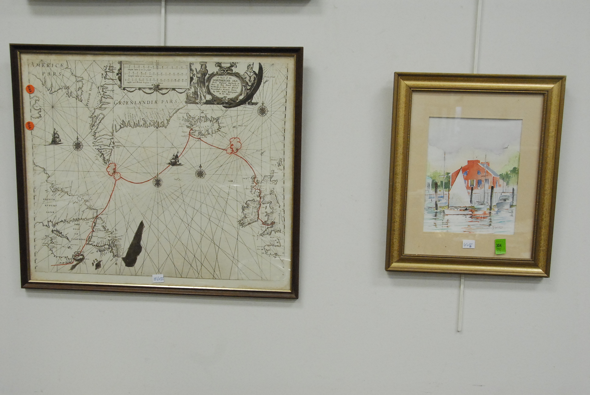 Group of four framed pieces to include two watercolors, a map, and an oil on canvas of a house.
