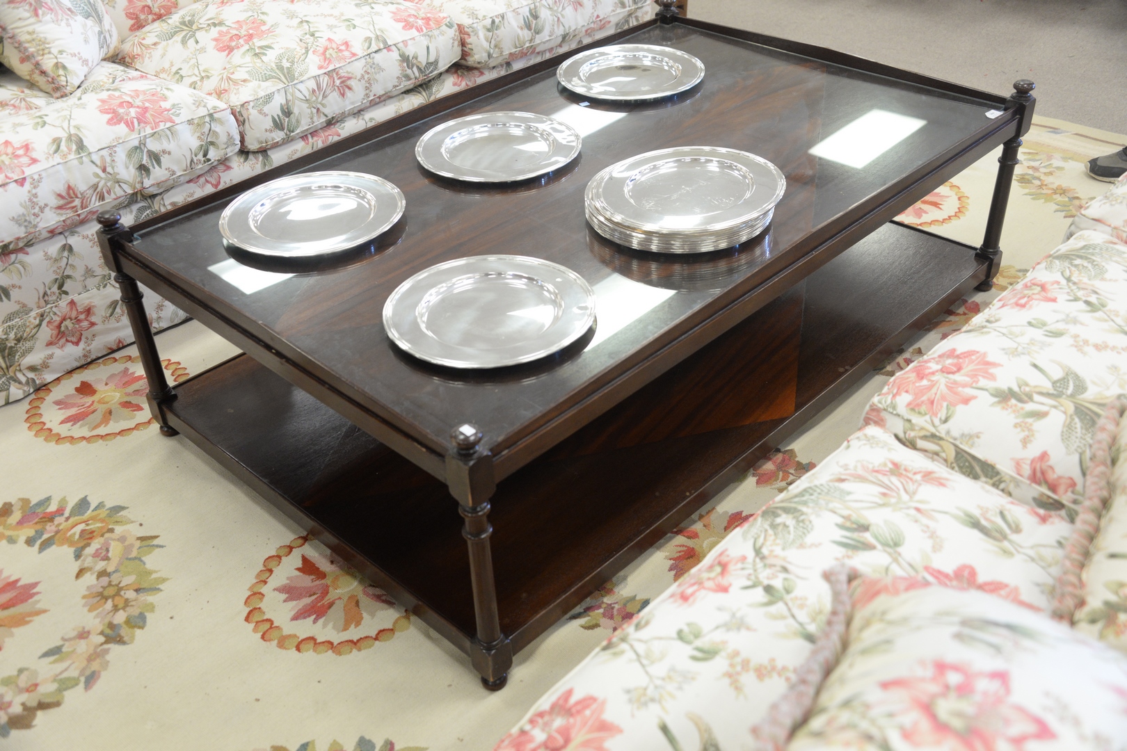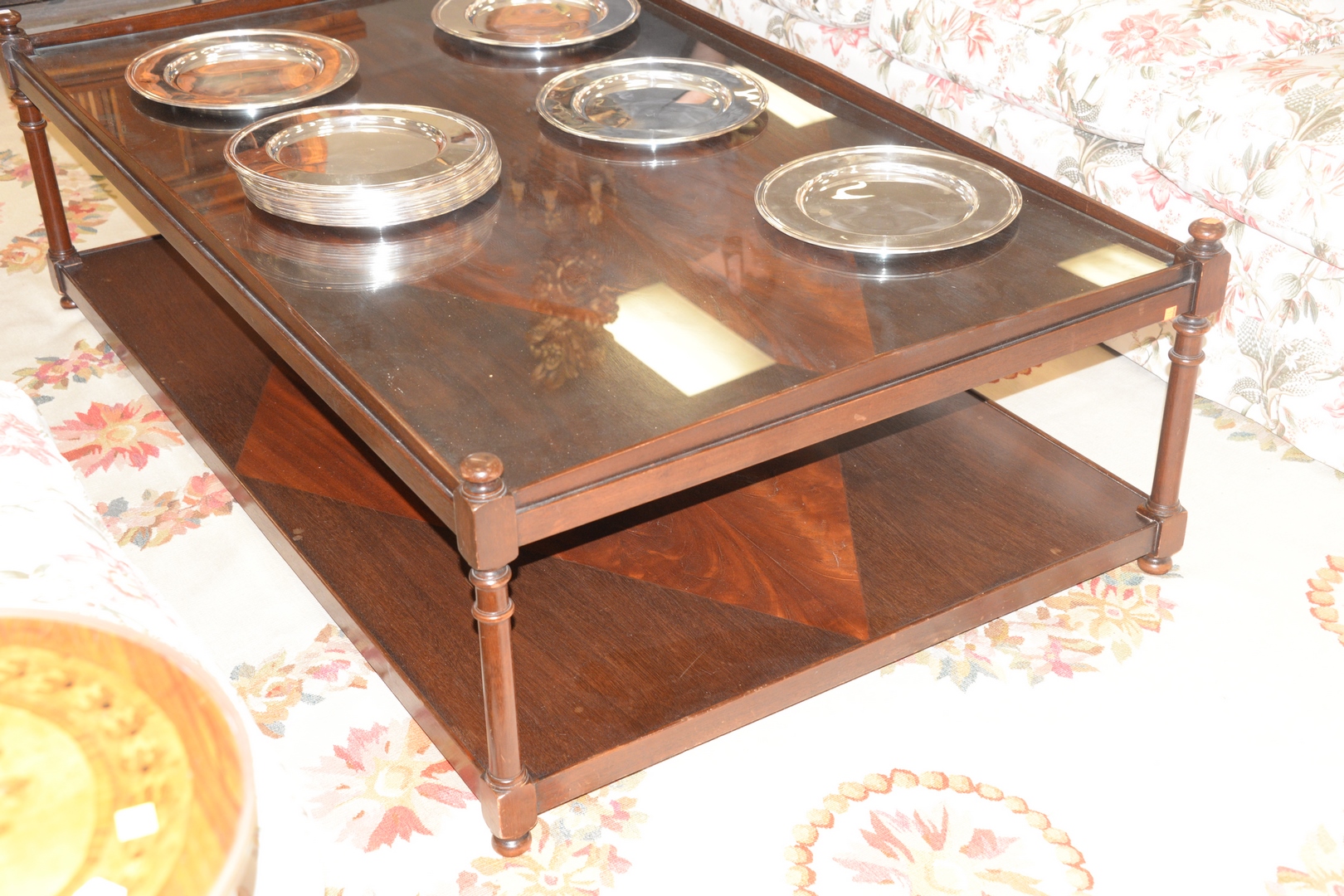 Lot 304: Large Contemporary Mahogany Rectangle Coffee Table, two tier with diamond inlaid panel, glass top insert, width 62 inches, height 17…