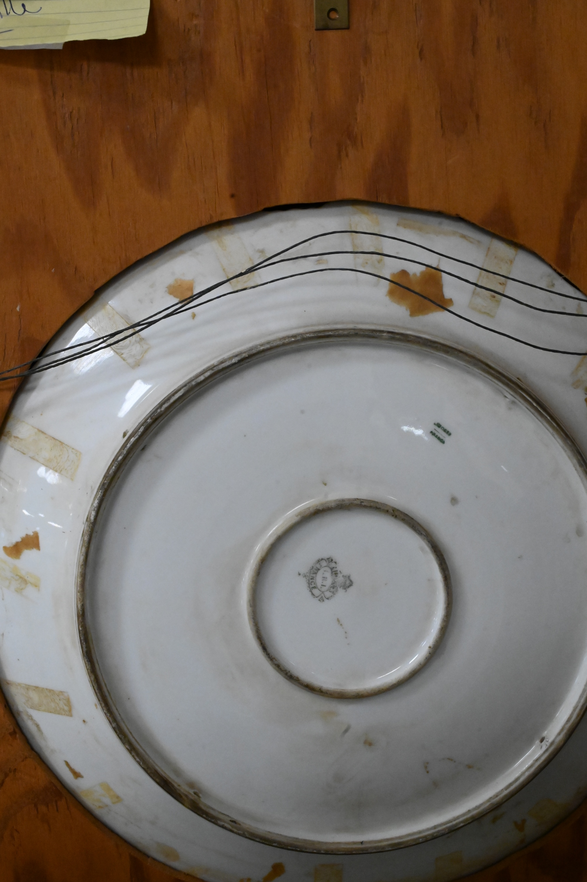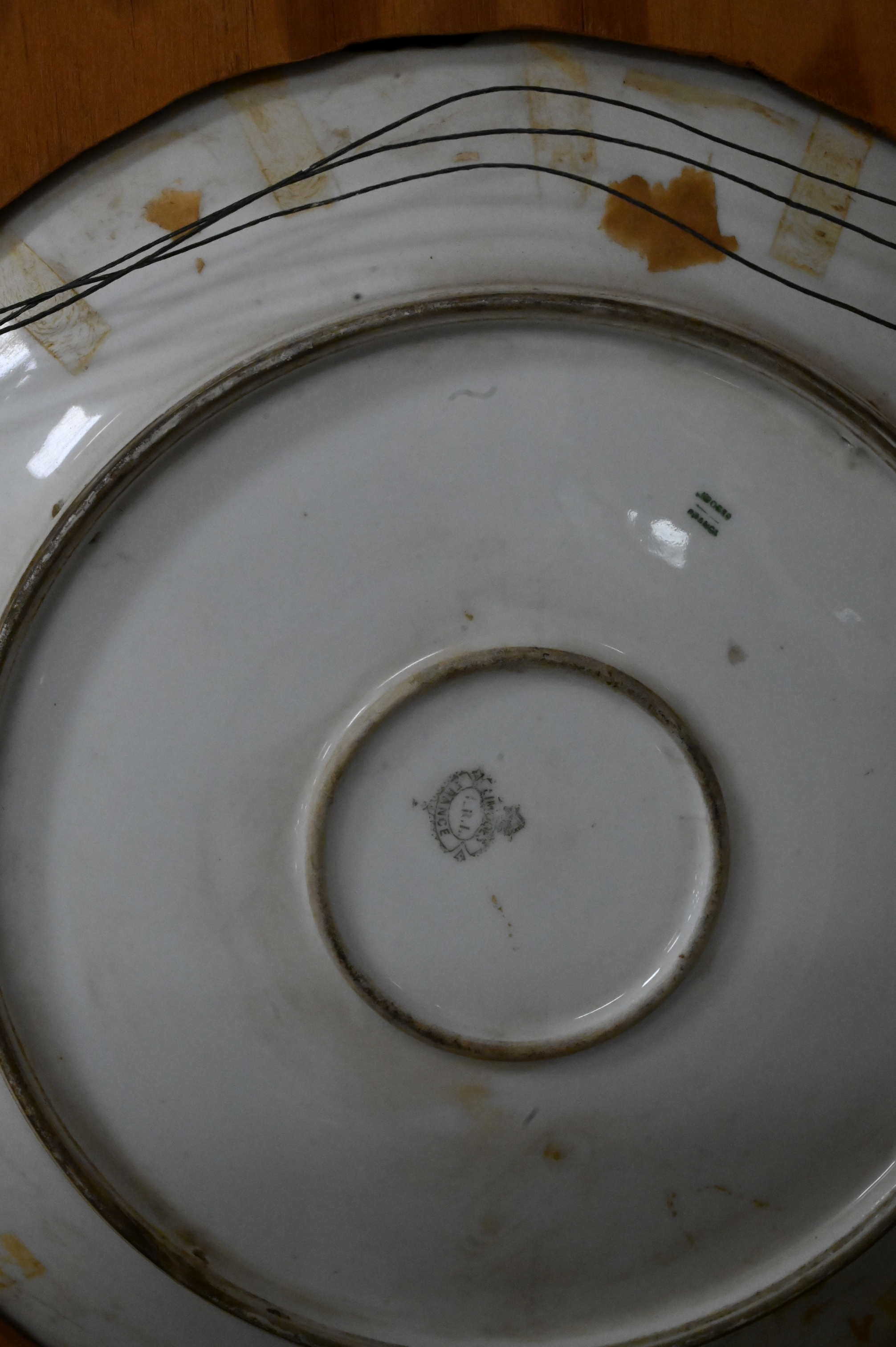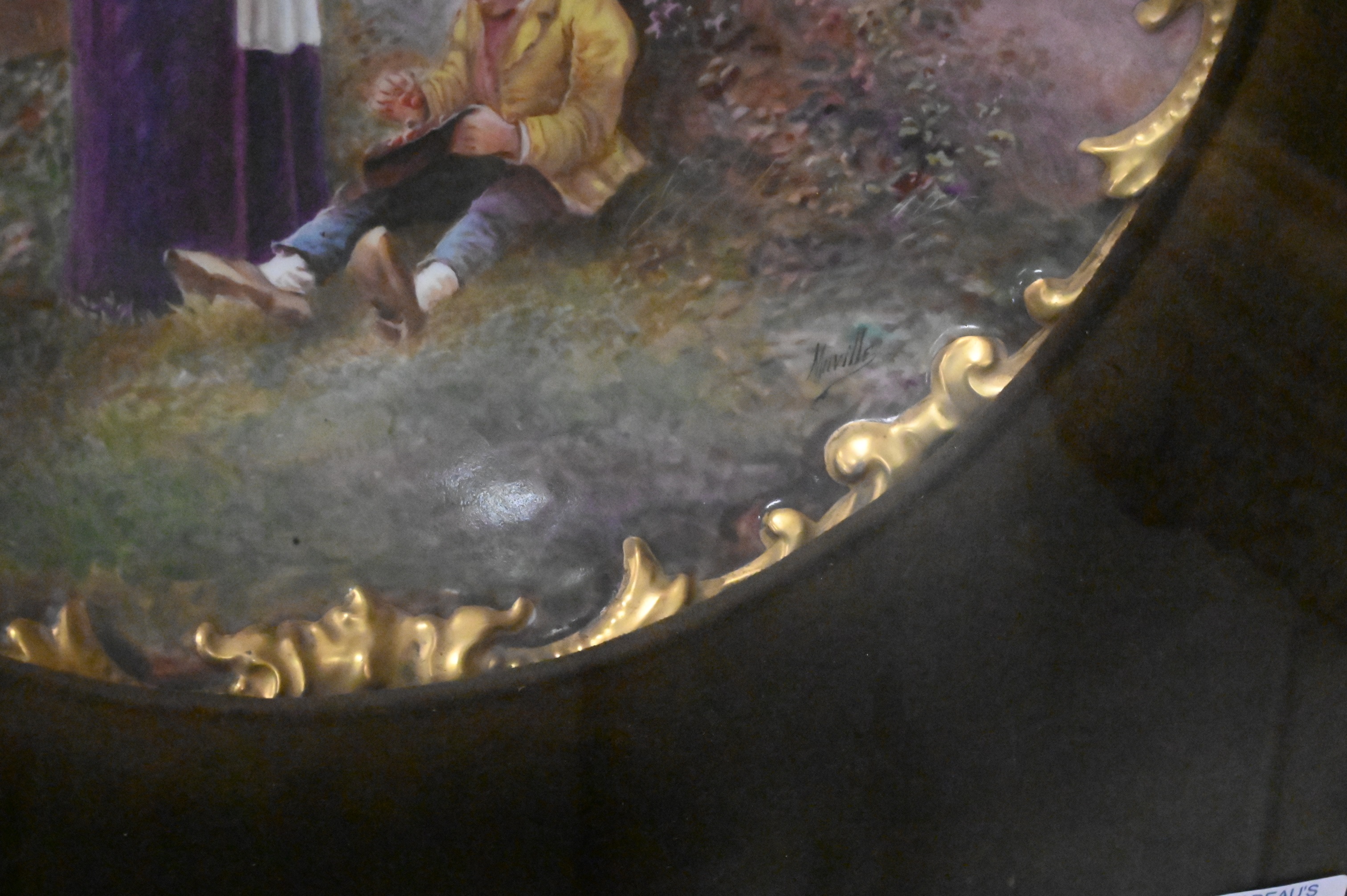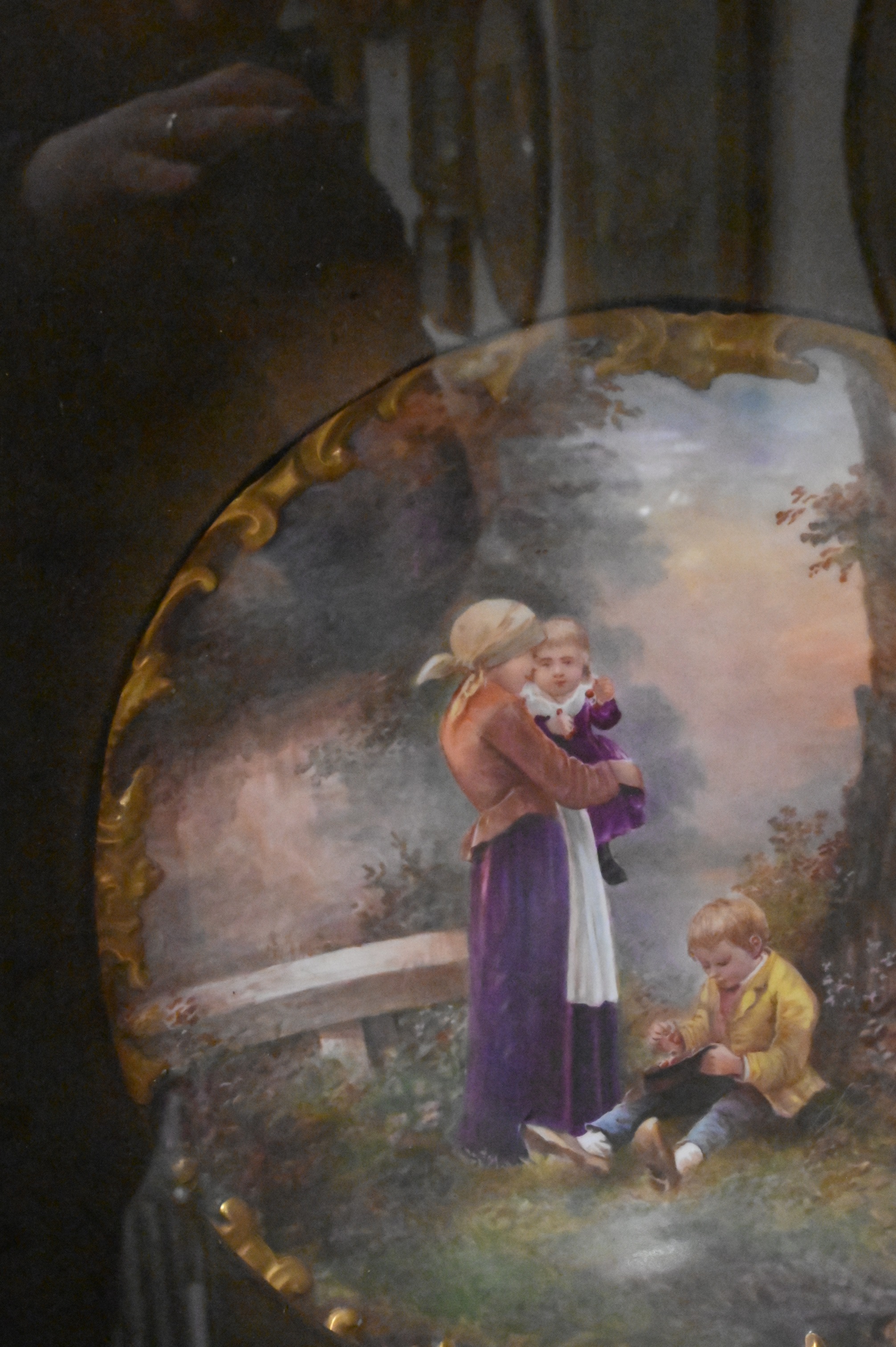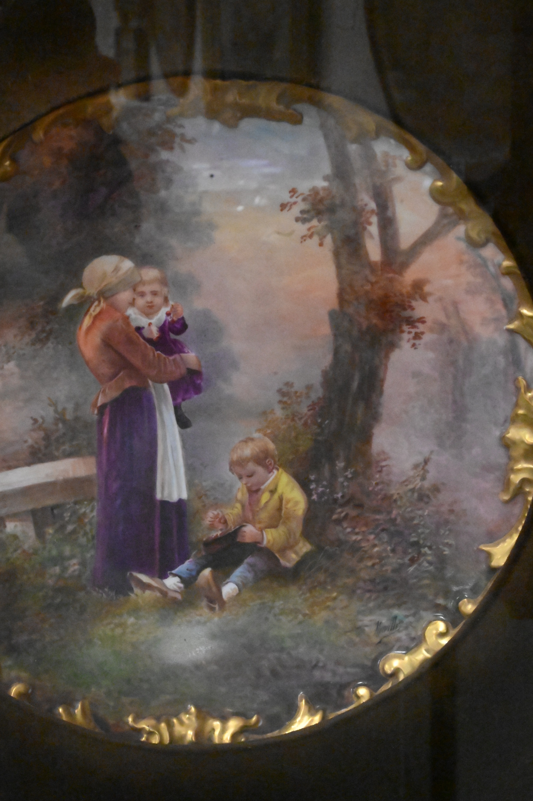 Large French Limoge Hand Painted Scenic Plates, painted with two boys with their mother, signed “Muville”, frame size 24 1/2″ x 21 1/2″, plate diameter 12 1/2 inches.