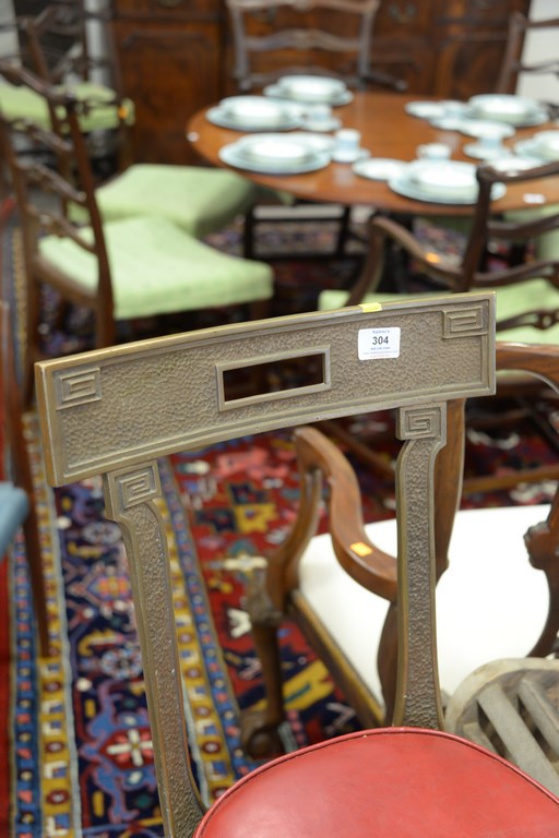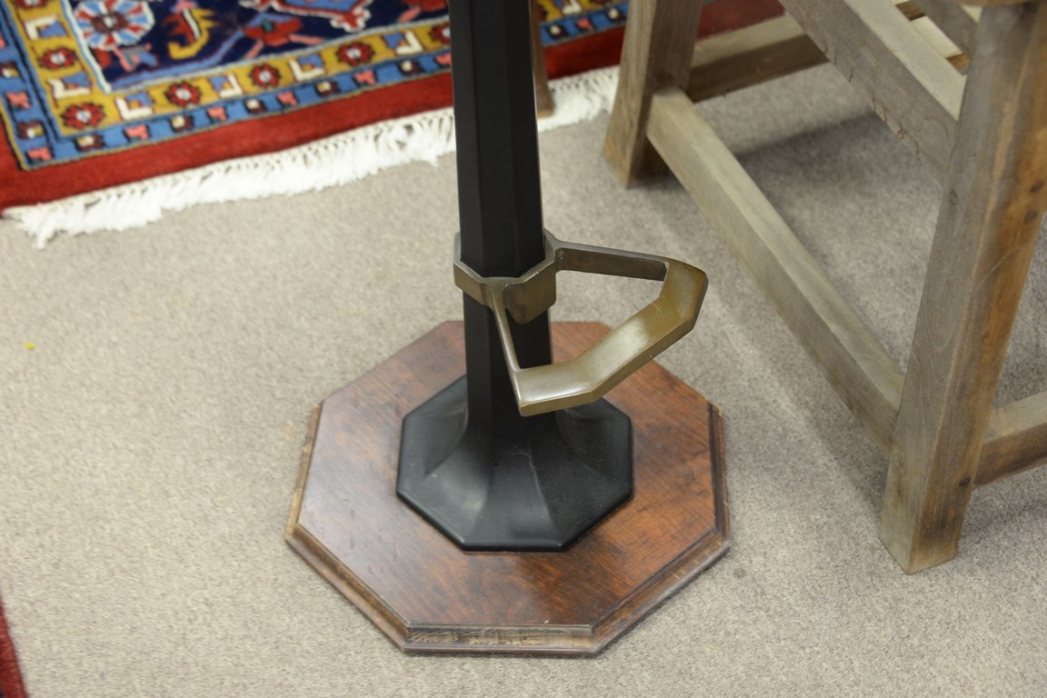 Mission style barstool with bronze back and iron shaft, ht. 46 in. seat ht. 31 1/2 in.