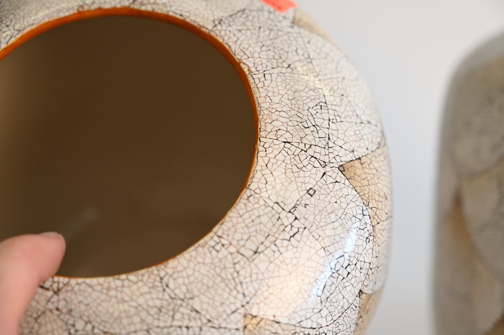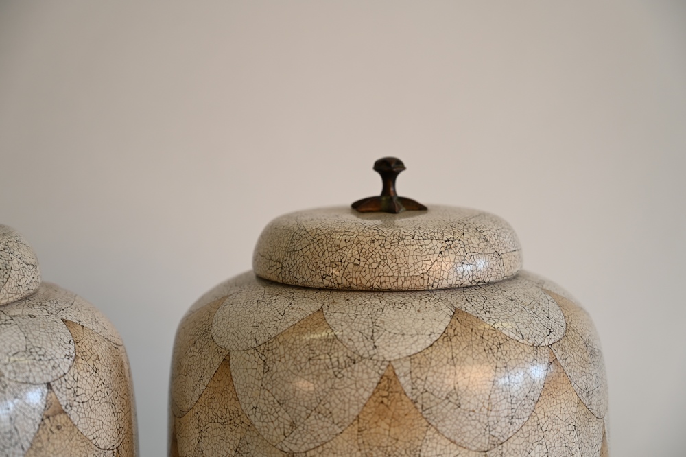Lot 304: Pair of Maitland Smith White and Tan Cloisonne Lidded Ginger Jars, height 10 inches.