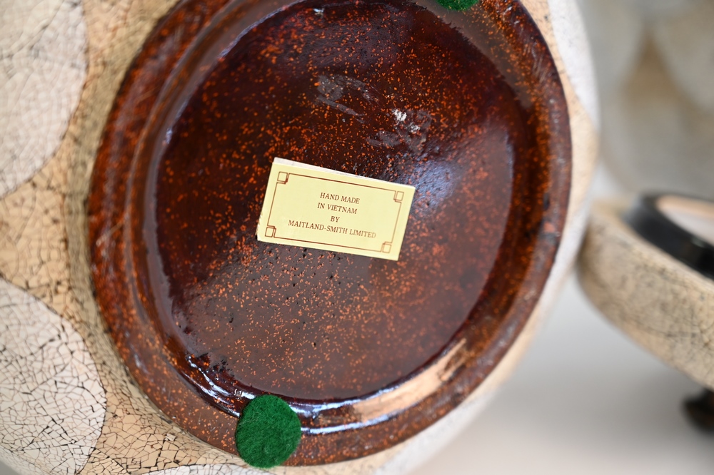 Pair of Maitland Smith White and Tan Cloisonne Lidded Ginger Jars, height 10 inches.