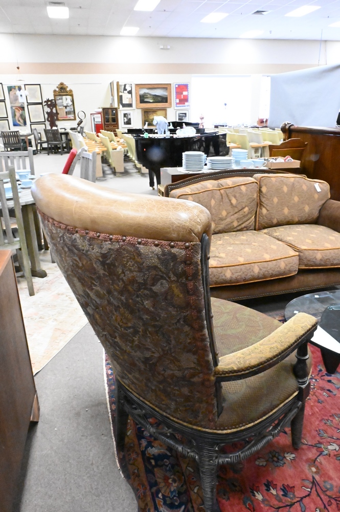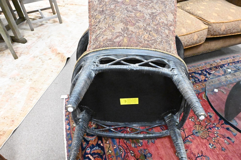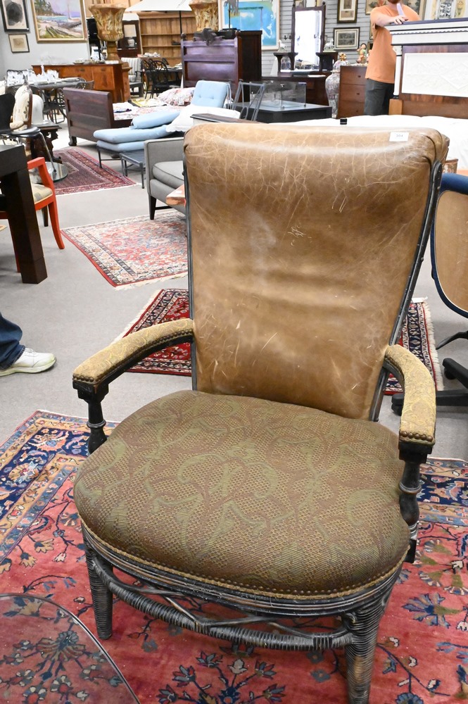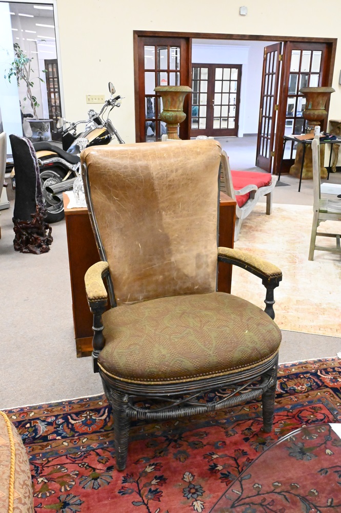 Lot 304: Pair of Occasional Armchairs, having leather backs and rattan wrapped base, (wear to backs), height 43 1/2 inches.
