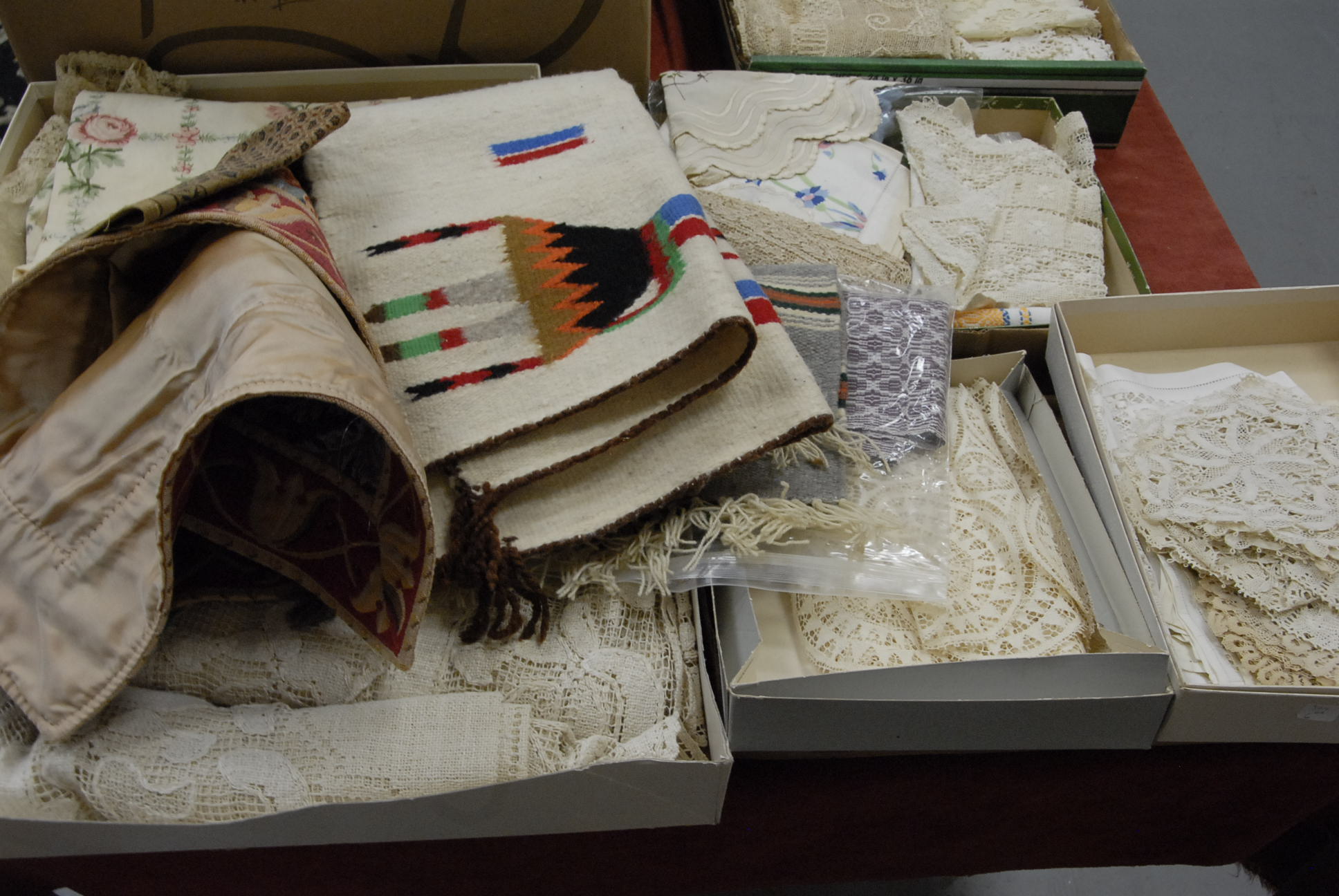 Six box lots of linen, lace, a sleigh robe and a quilt