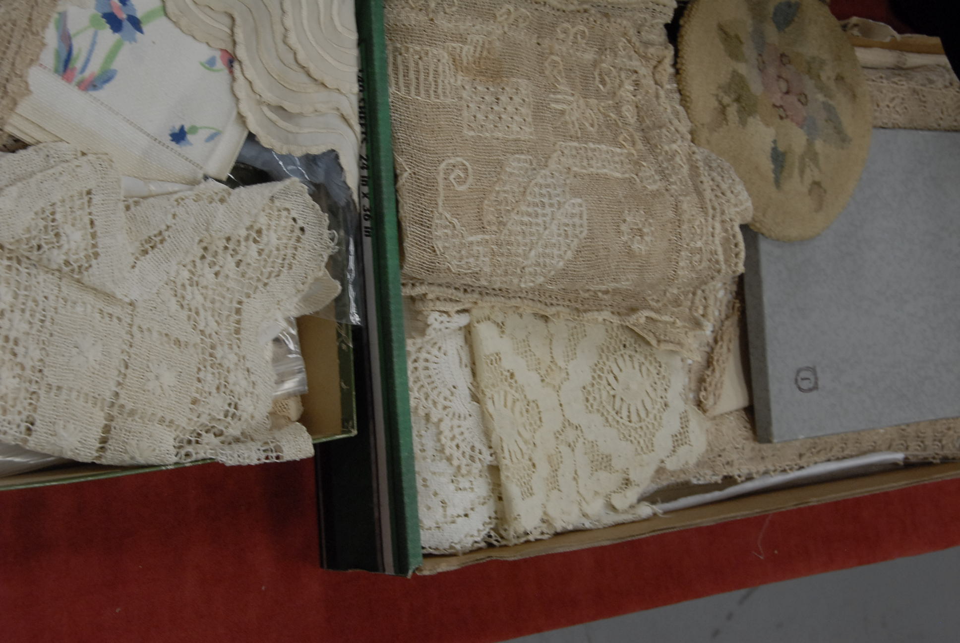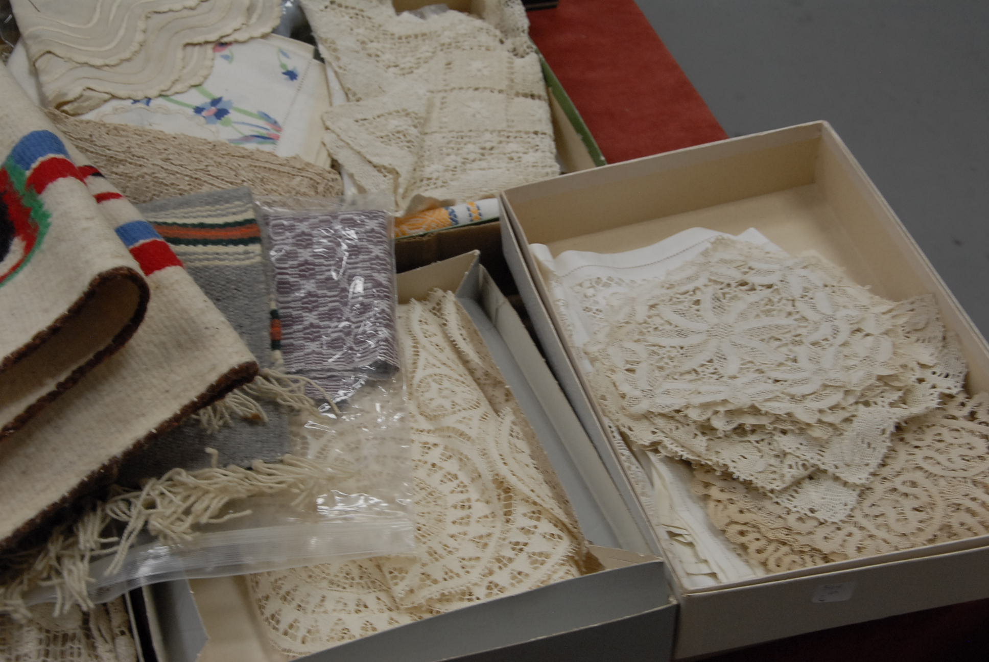 Lot 304: Six box lots of linen, lace, a sleigh robe and a