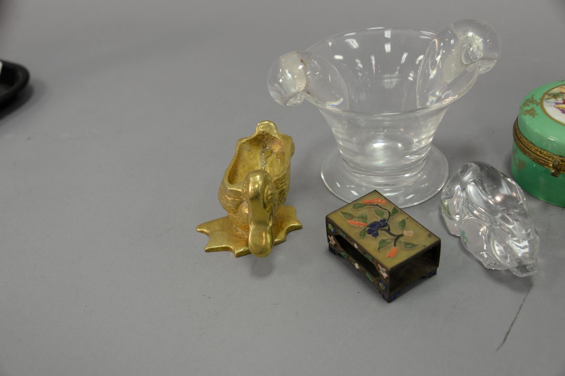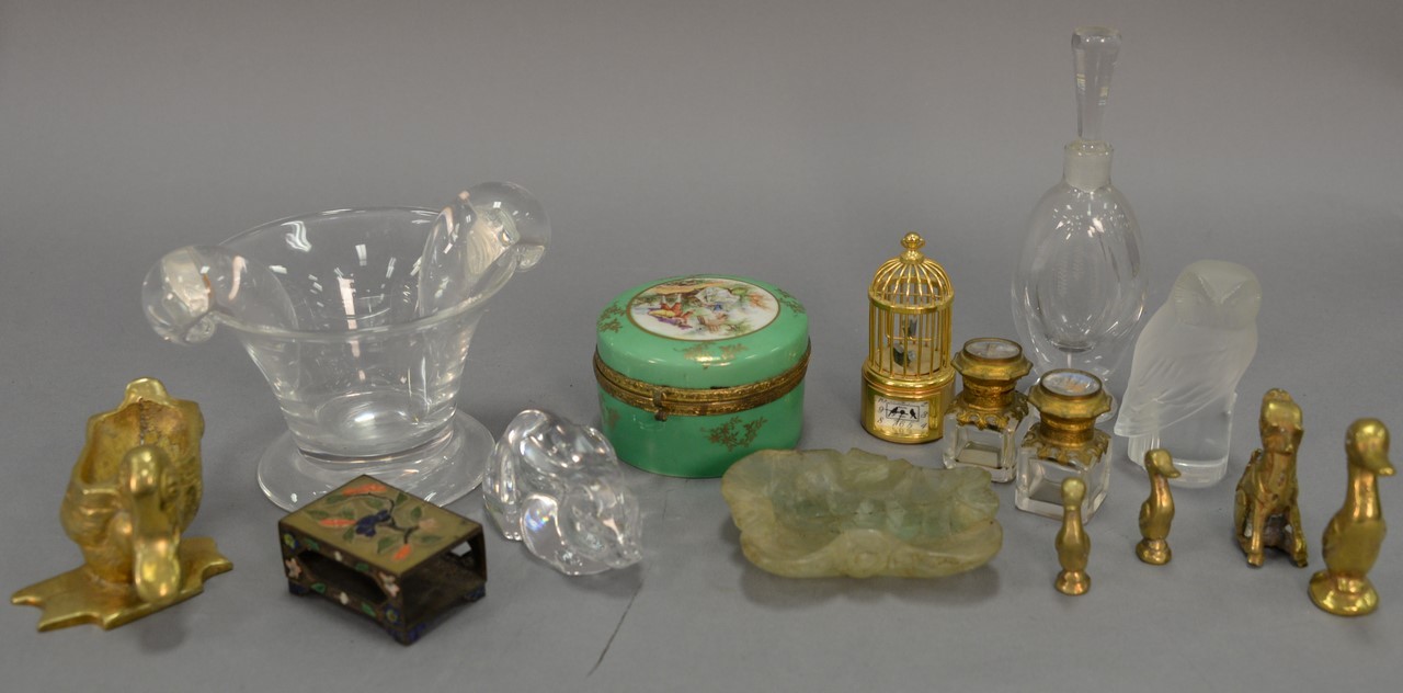Box lot to include Lalique owl, Steuben bowl, hardstone Chinese dish, pair of perfumes with painted tops, porcelain box, brass figures, etc.
