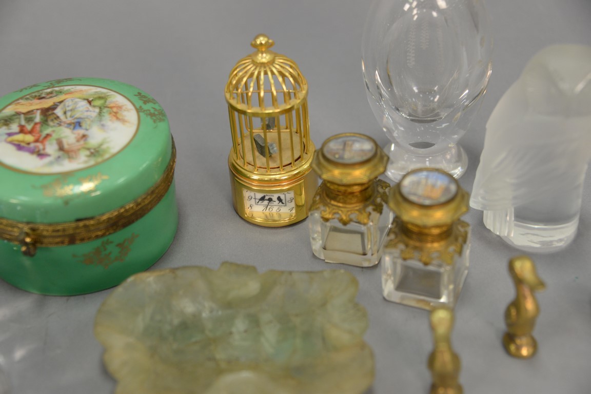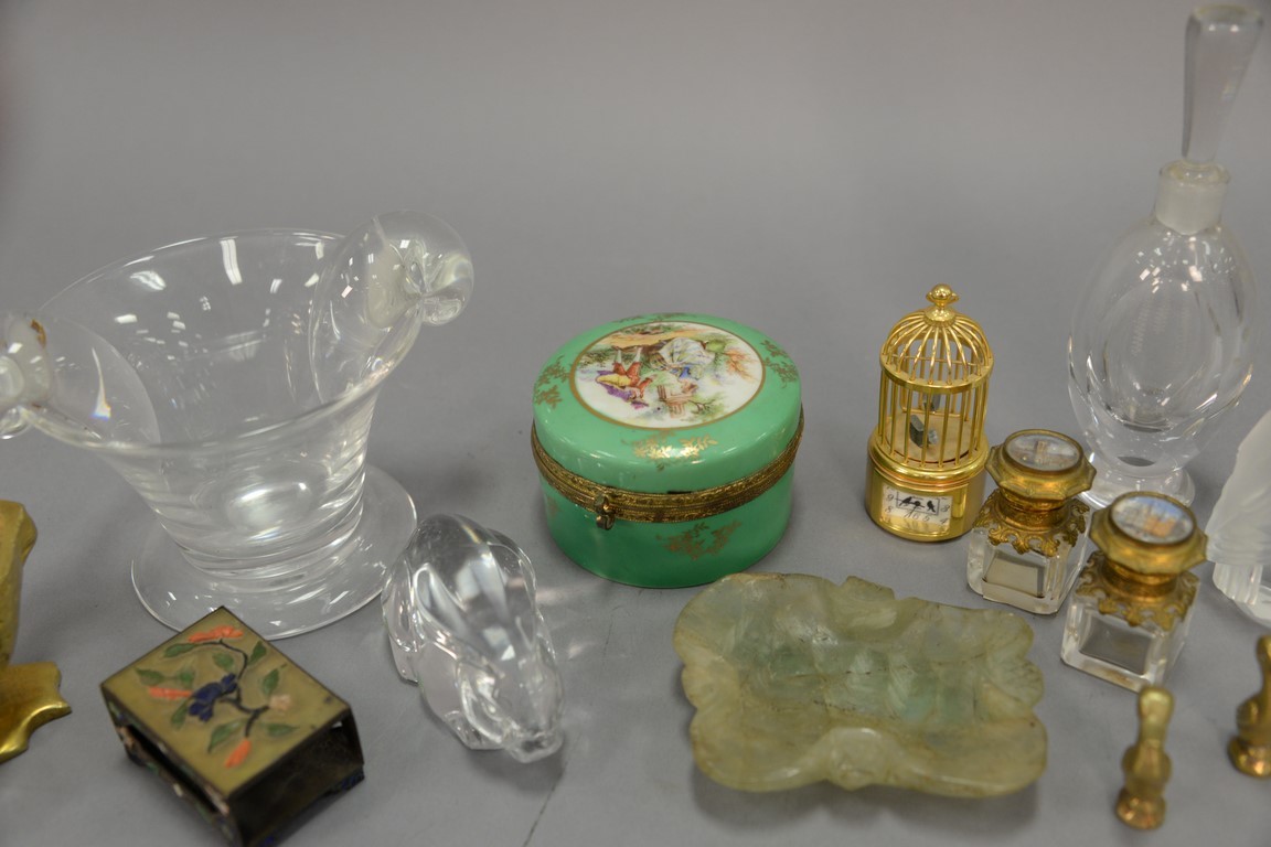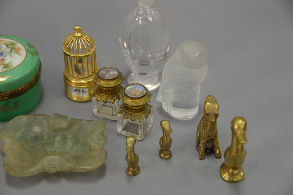 Lot 305: Box lot to include Lalique owl, Steuben bowl, hardstone Chinese dish, pair of perfumes with painted tops, porcelain box, brass figur…