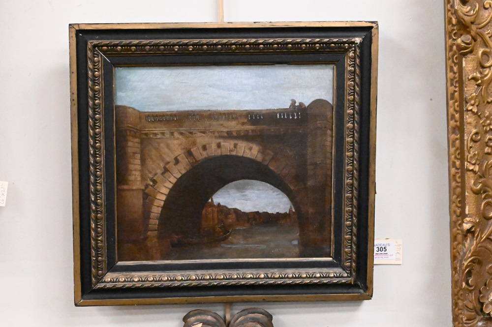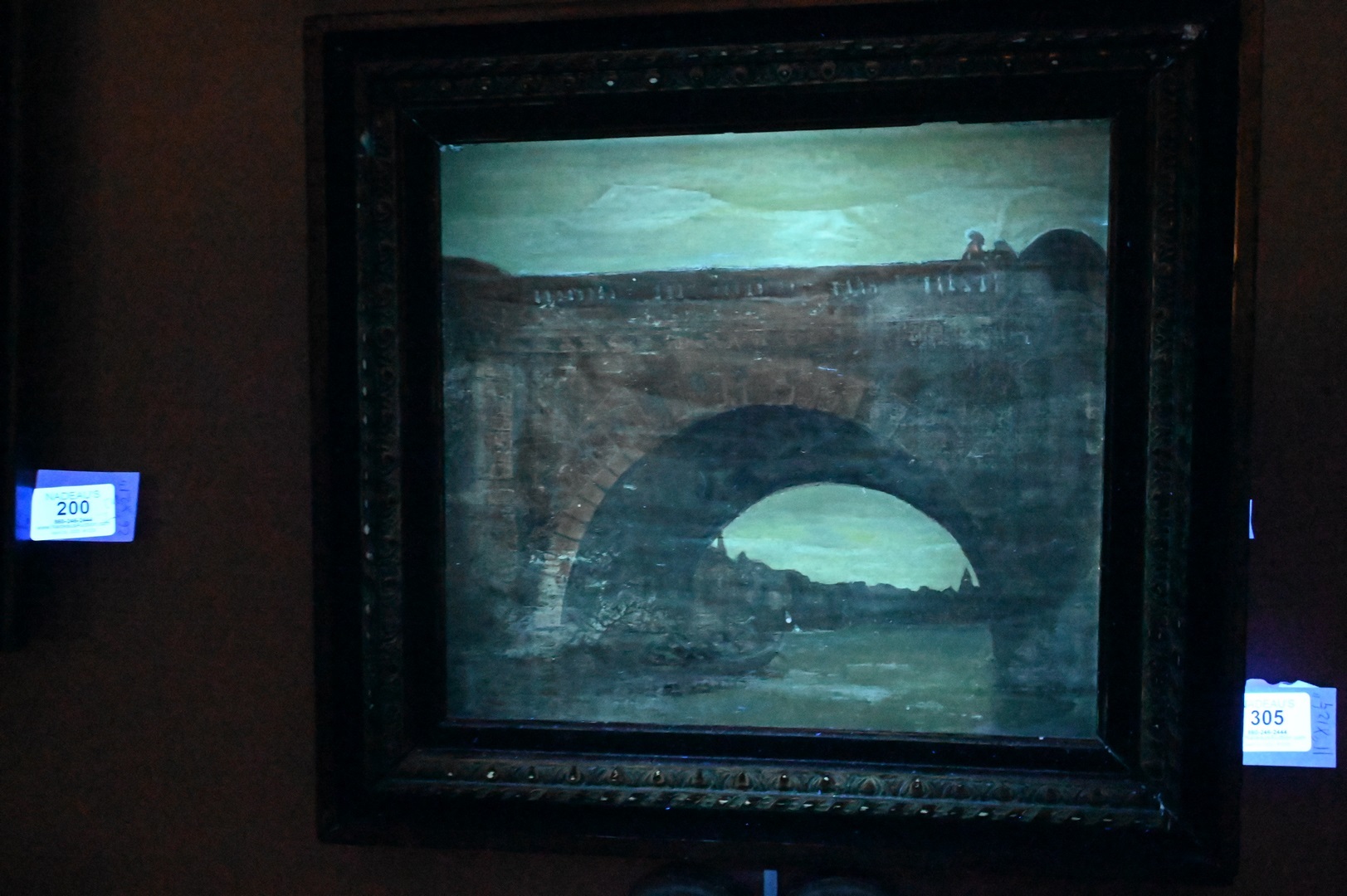 Lot 305: British School, 18th century, Westminster Bridge, London, oil on canvas, 11″ x 12 1/4″, inscribed in brown ink on stretcher, Westminster Bridge. Provenance: Purchased The Perfect Touch, Chicago, February 26, 1977, no receipt available. Estate of Wallace Bradway, New Haven, CT.