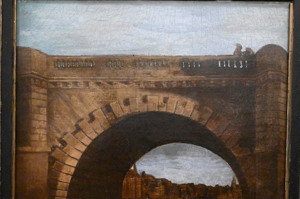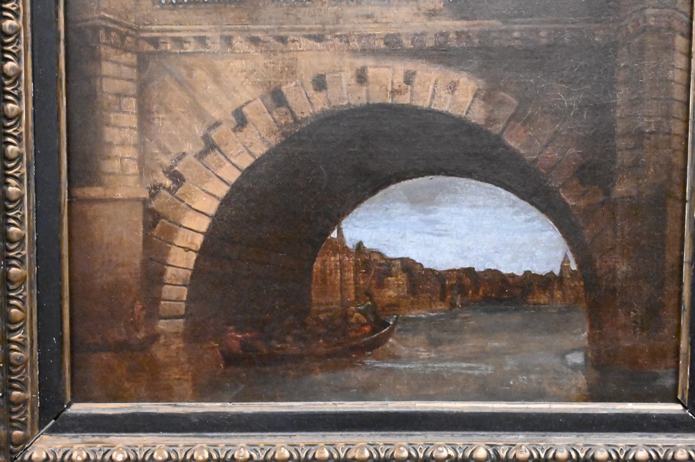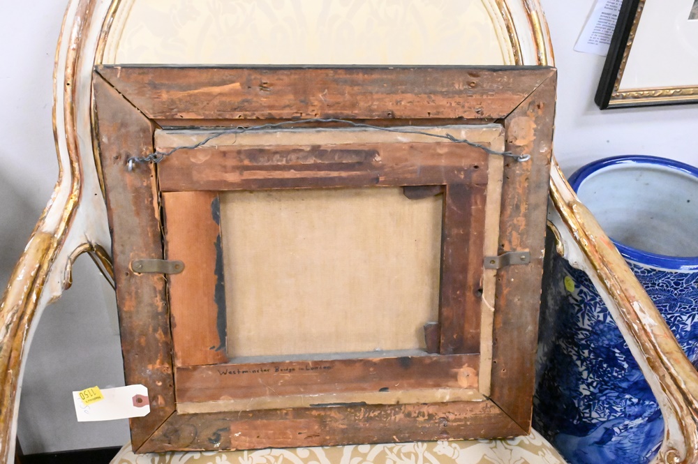 British School, 18th century, Westminster Bridge, London, oil on canvas, 11″ x 12 1/4″, inscribed in brown ink on stretcher, Westminster Bridge. Provenance: Purchased The Perfect Touch, Chicago, February 26, 1977, no receipt available. Estate of Wallace Bradway, New Haven, CT.
