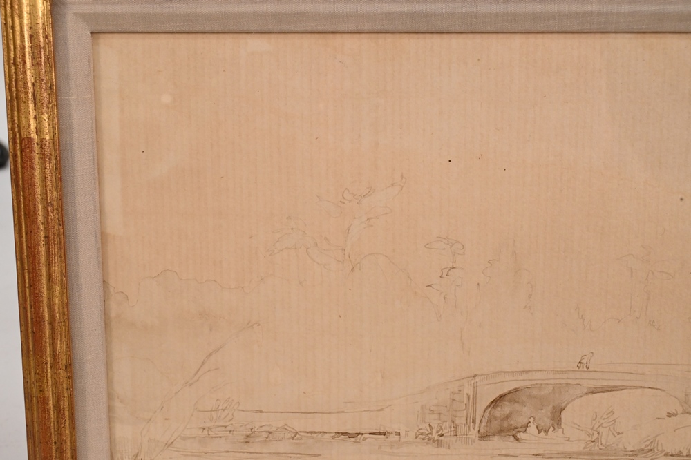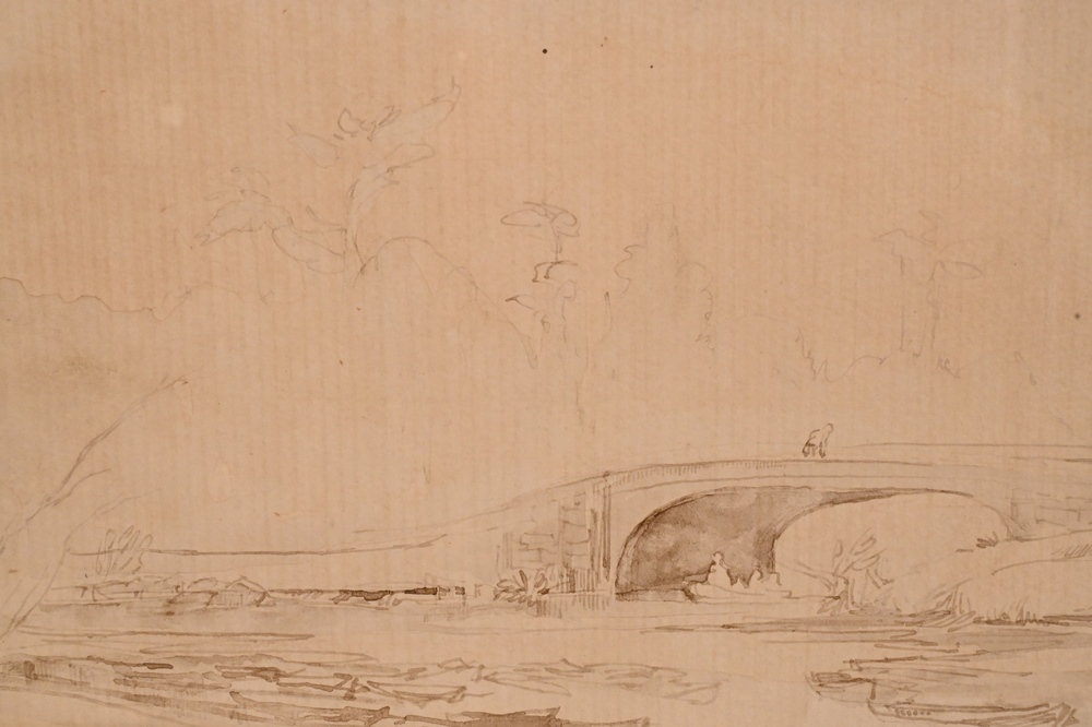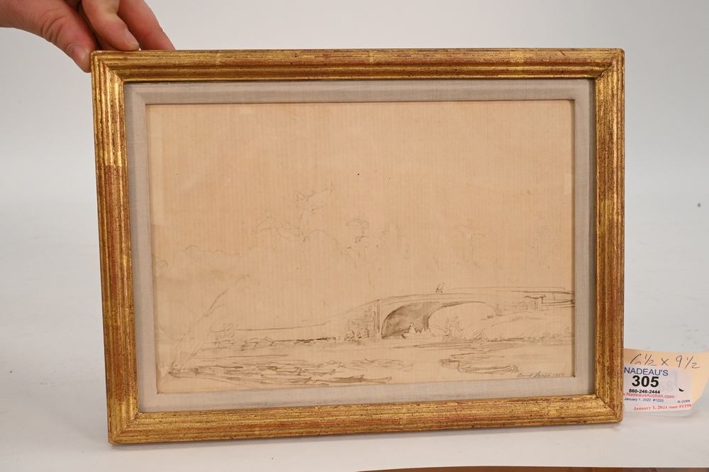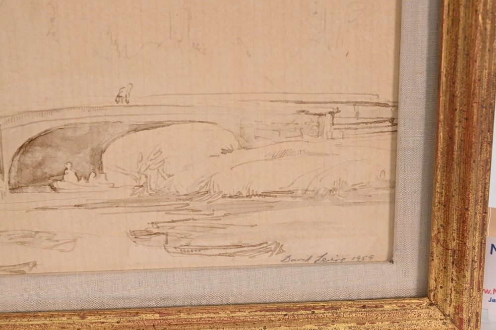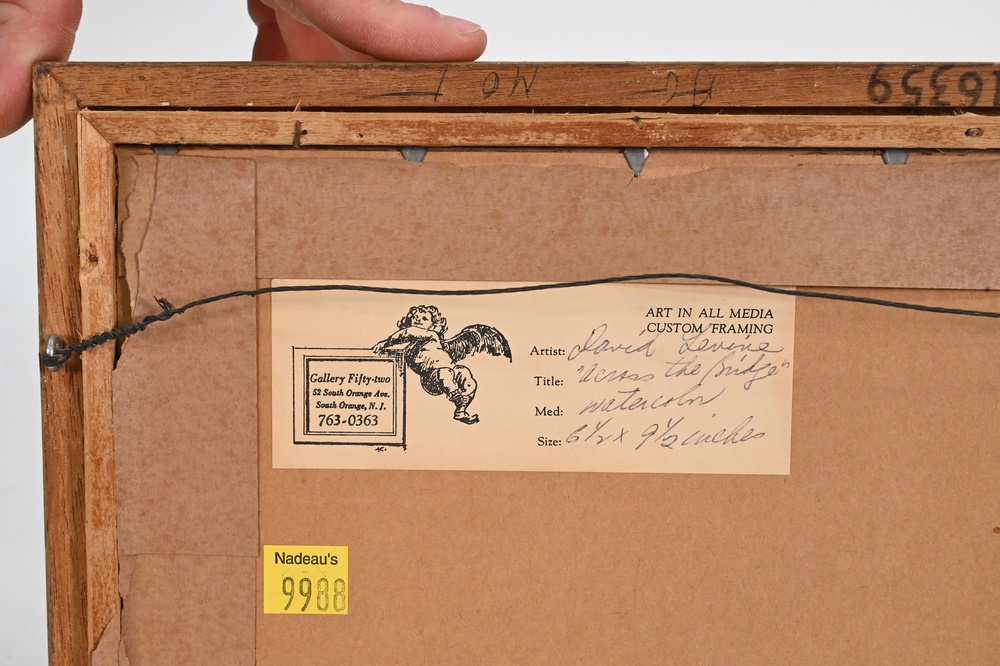 David Levine (1926 – 2009), Across the Bridge, possibly Central Park, signed lower right David Levine, 1959, sight size 6 1/2″ x 9 1/2″, Gallery Fifty-two, New Jersey label verso. Provenance: The Estate of Ed Brenner, Short Hills, New Jersey.