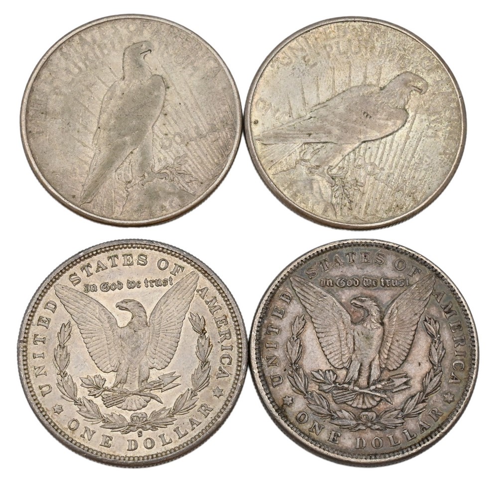 Lot 305: Four Silver Dollars, to include two Morgan and two Peace.