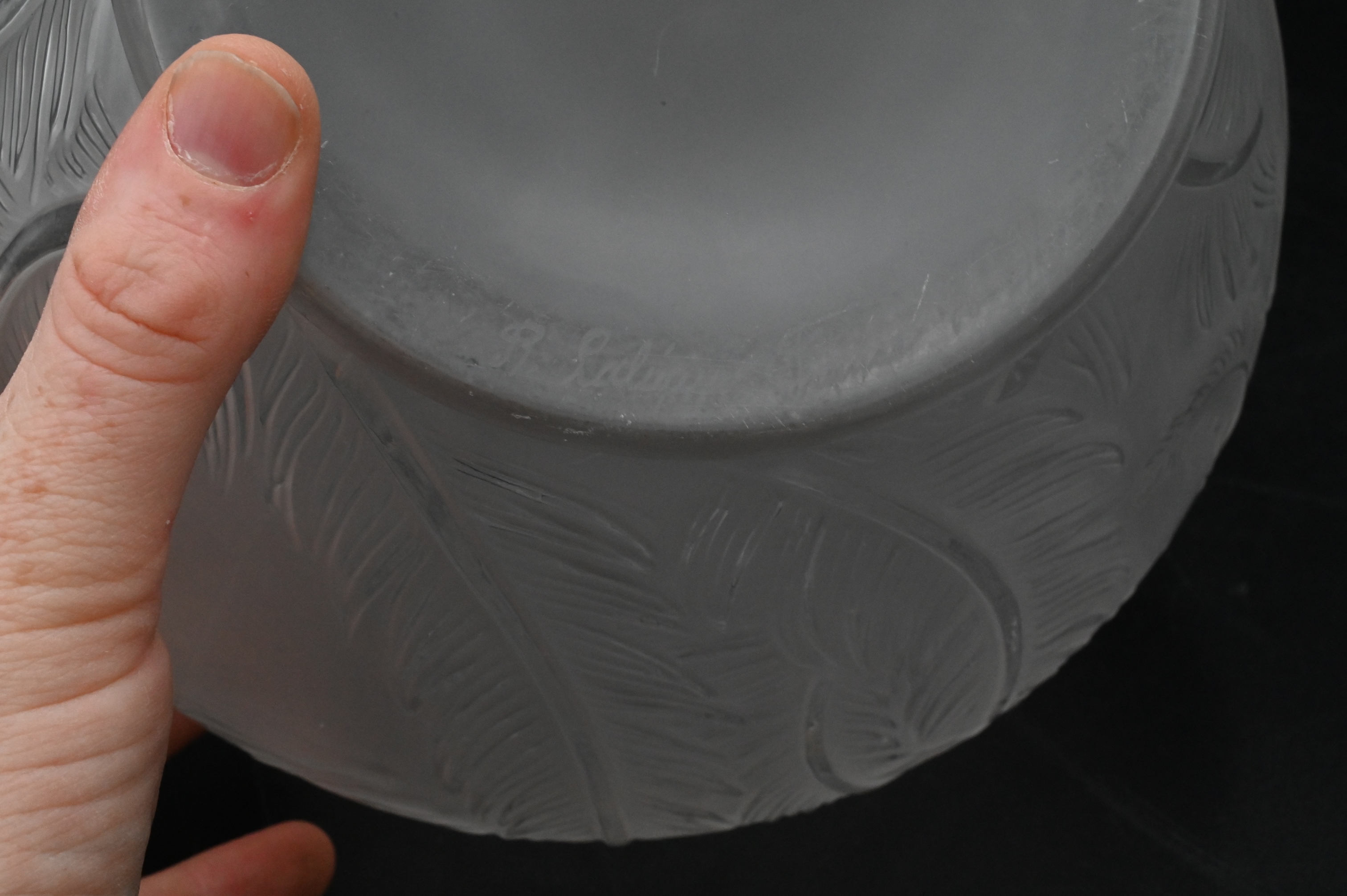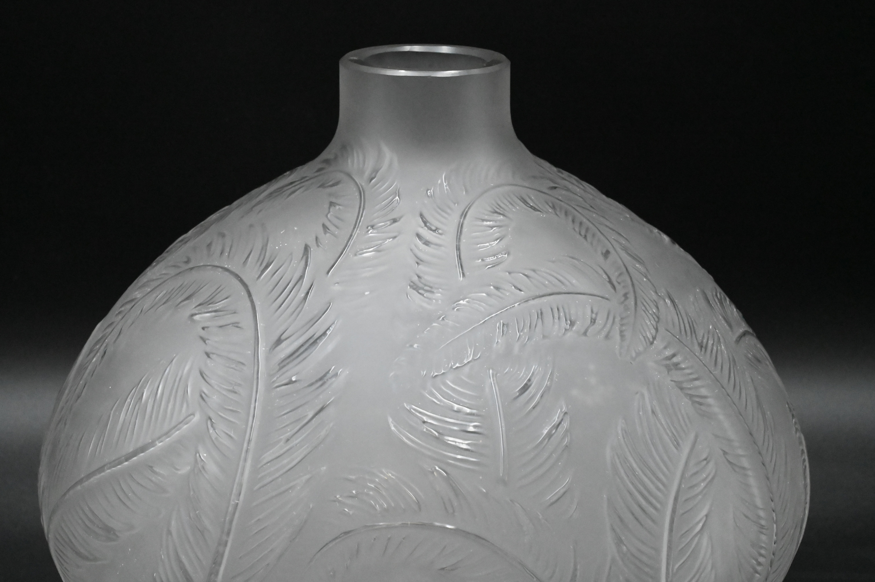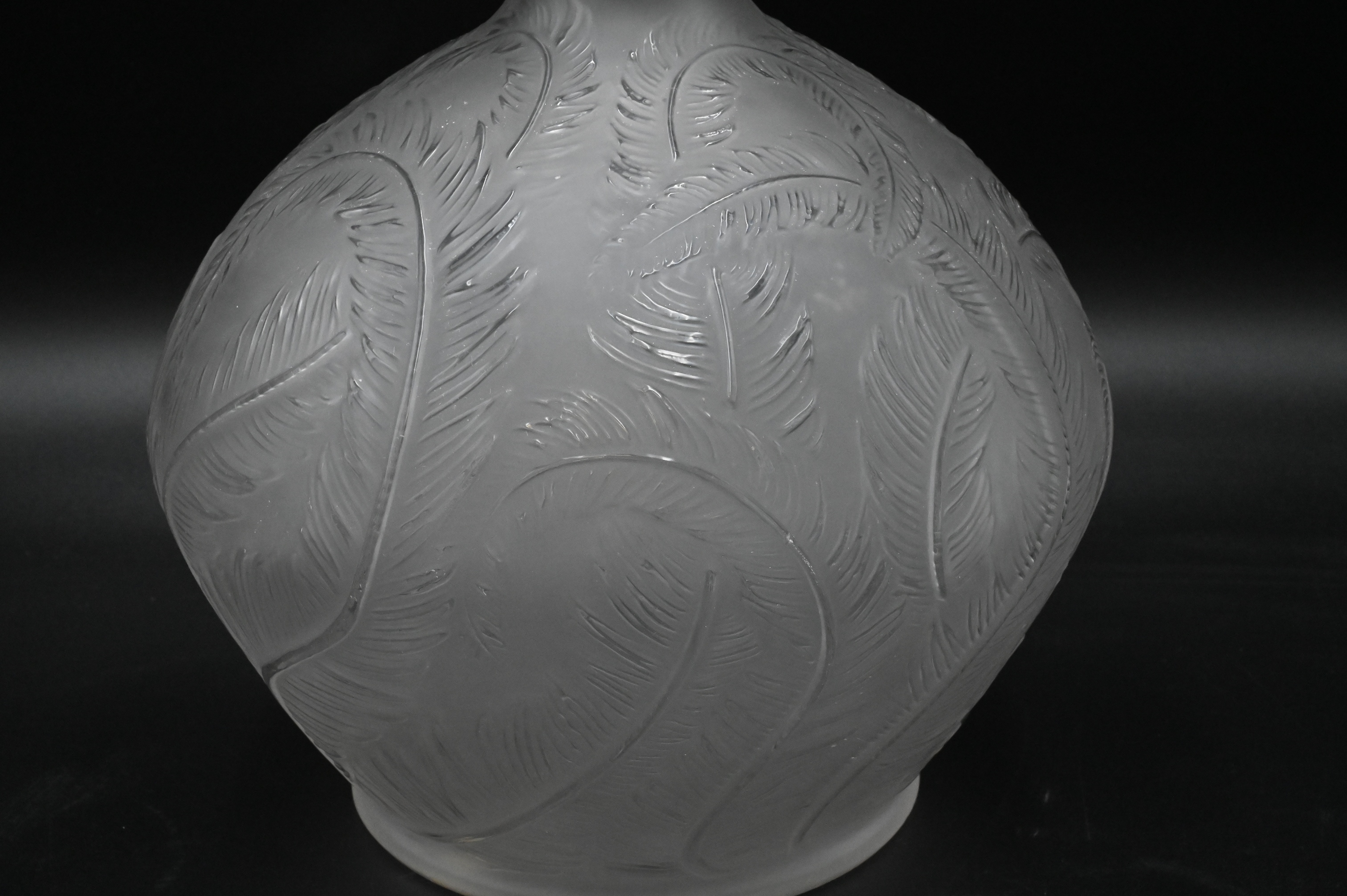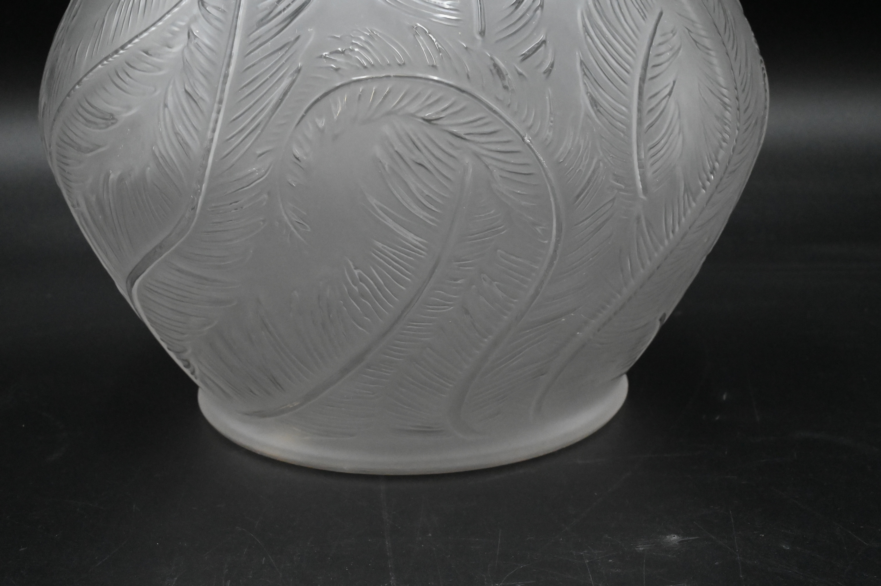 Lalique “Plumes” Frosted Crystal Vase, having short neck over globular body with swirling feather design, signed R. “Lalique France” and marked “No 944”, height 8 1/2 inches, diameter 8 1/2 inches