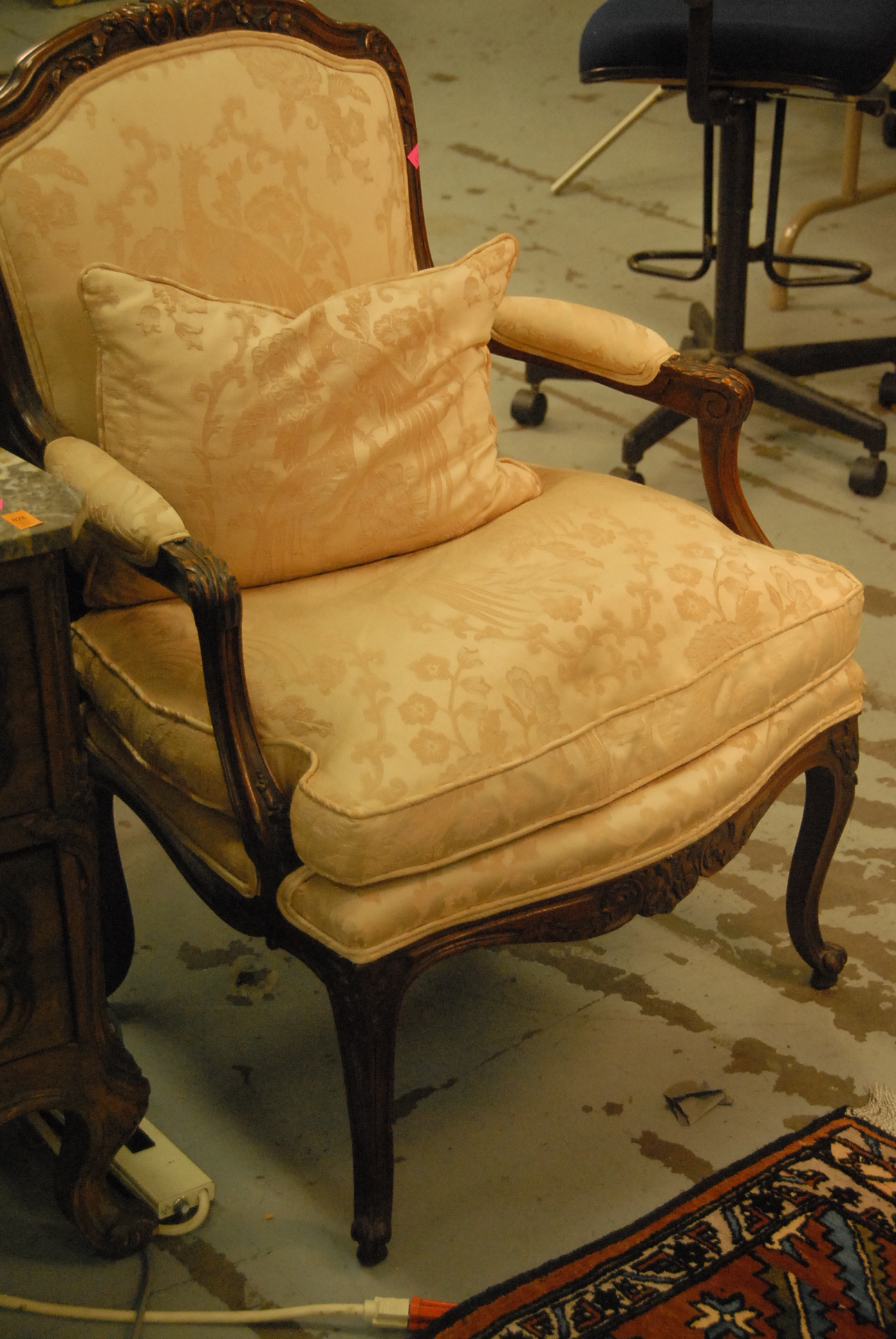 Louis XV style upholstered armchair in custom upholstery with down cushion.