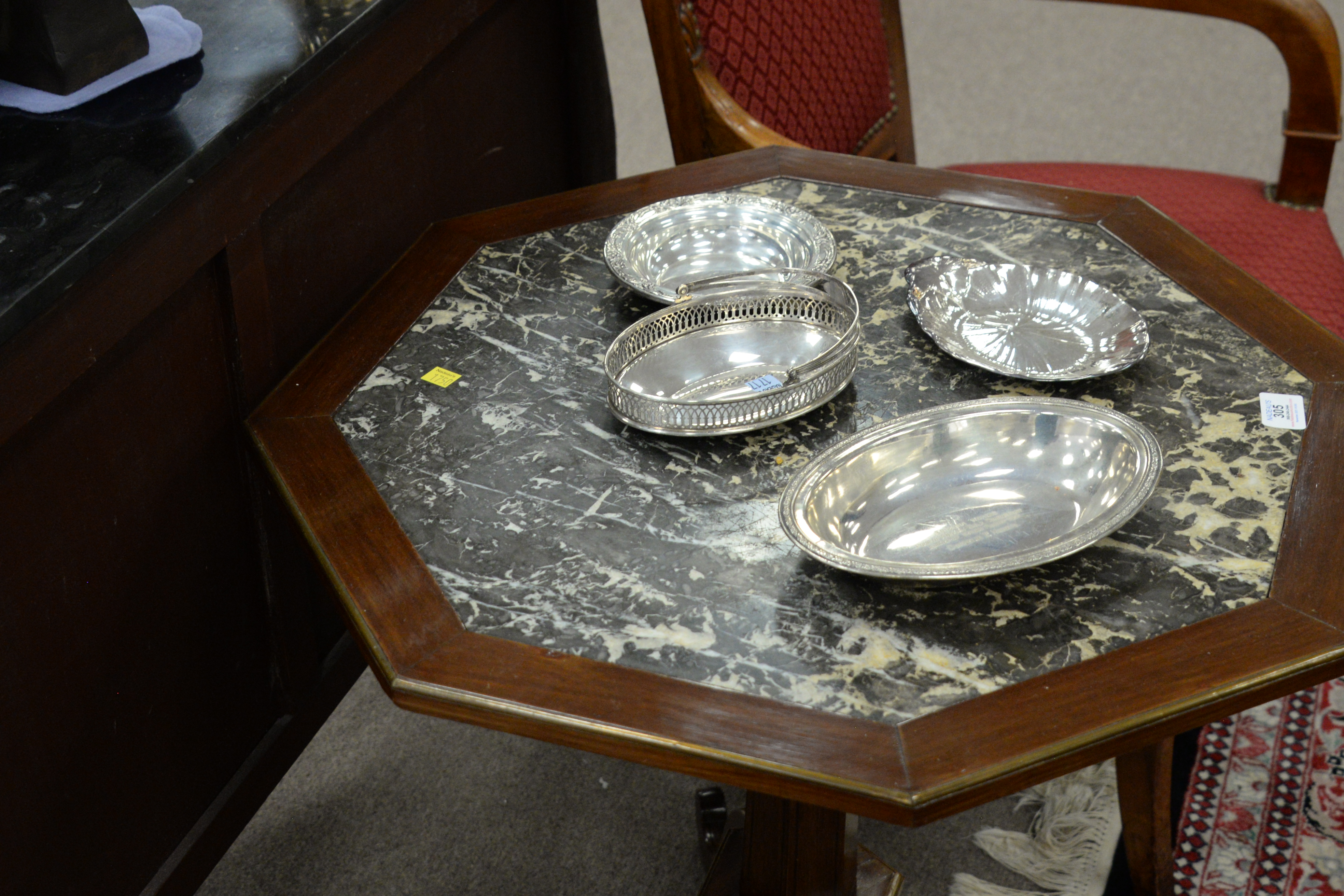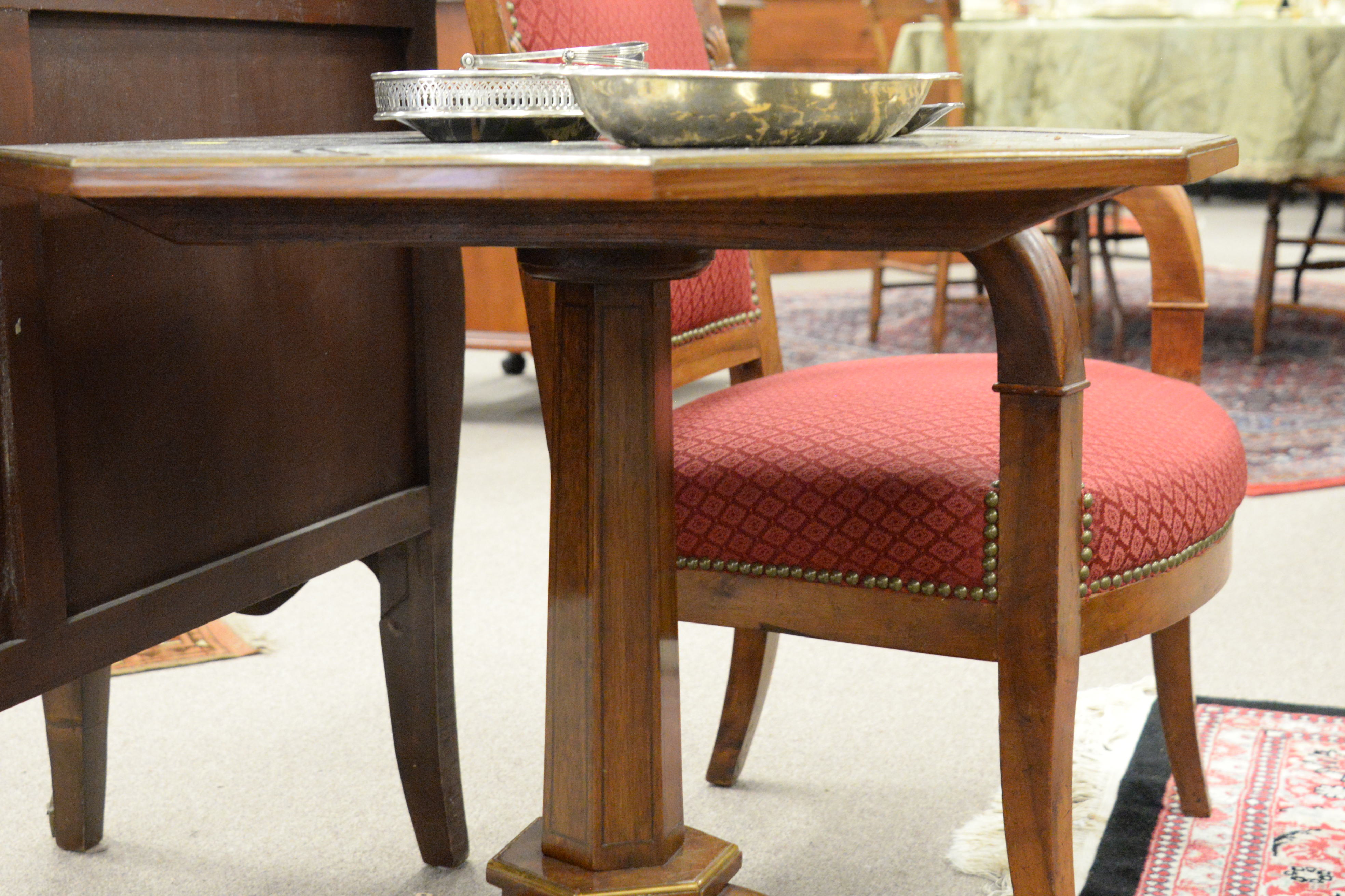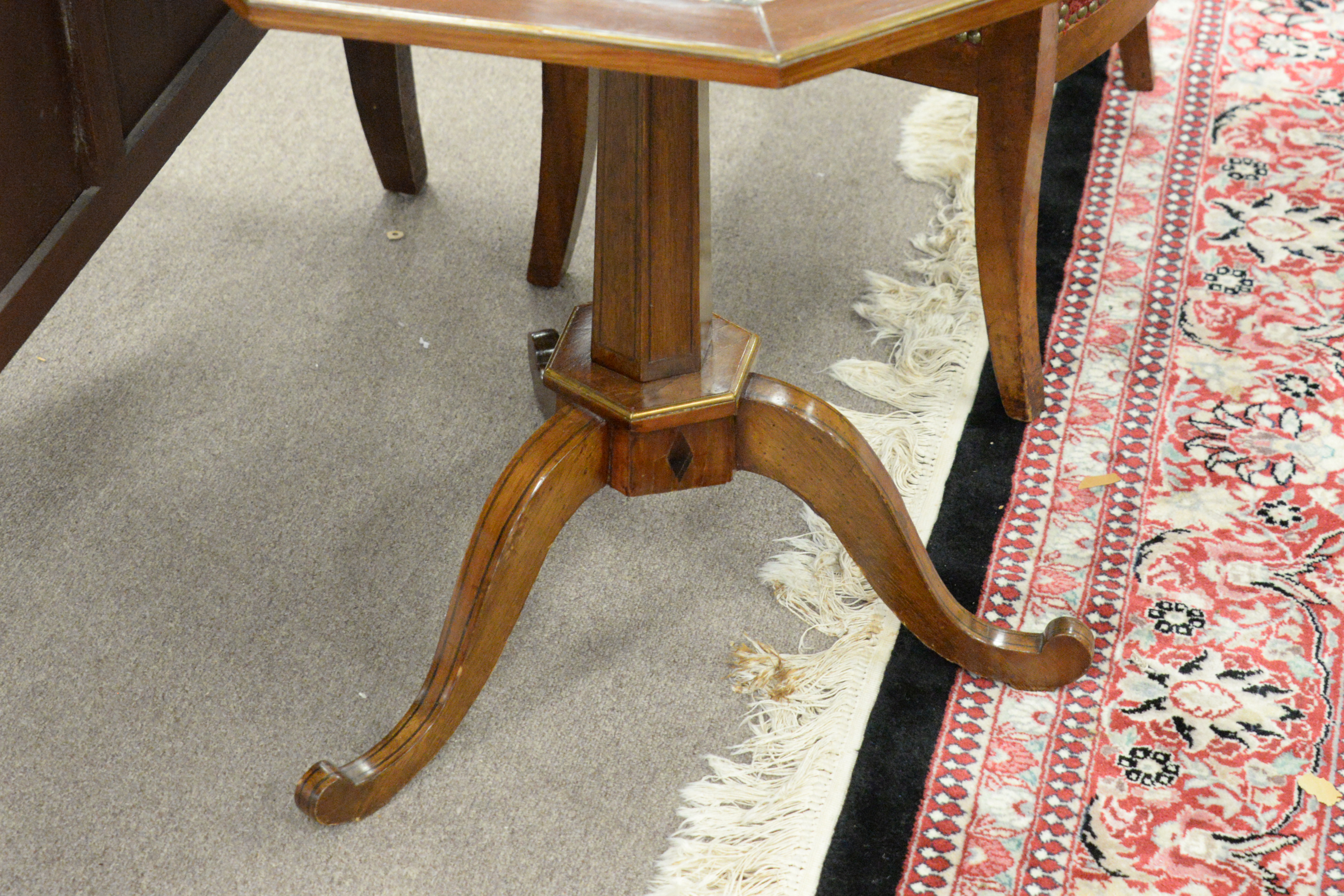 Louis XVI Style Mahogany and Brass-Mounted Tripod Octagonal-Form Marble Inset Tilt-Top Tea Table, mid 19th century, on scroll feet, height 26 inches, diameter 26 1/2 inches