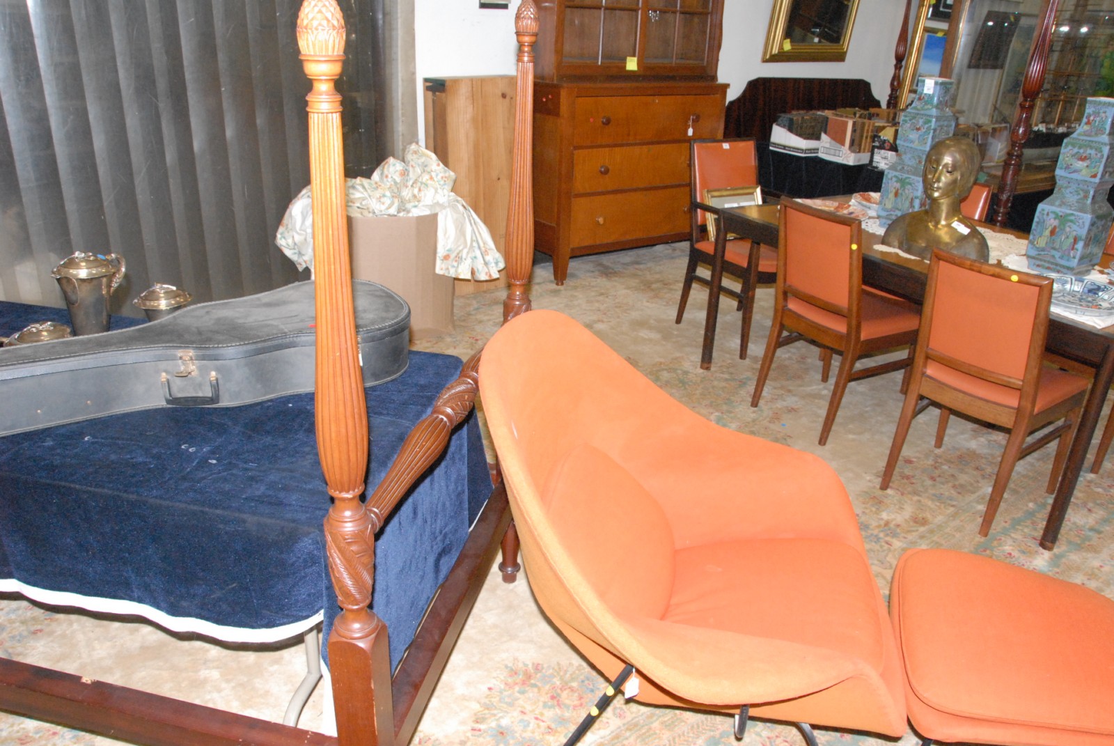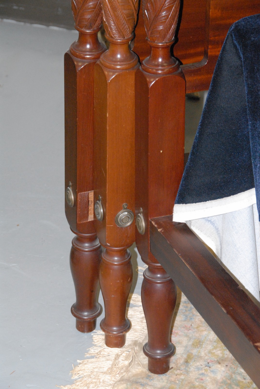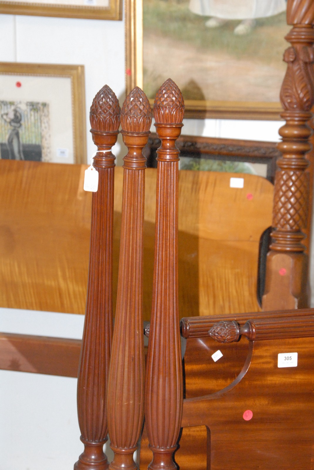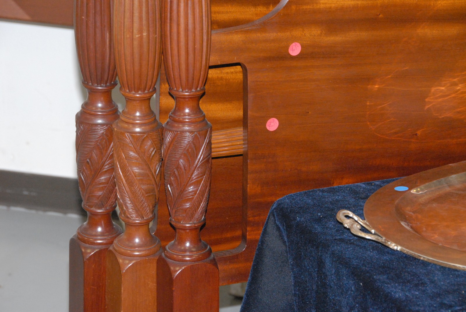 Margolis pair of four post beds with pineapple tops signed Margolis 1930 along with custom quilt and bed skirts.
