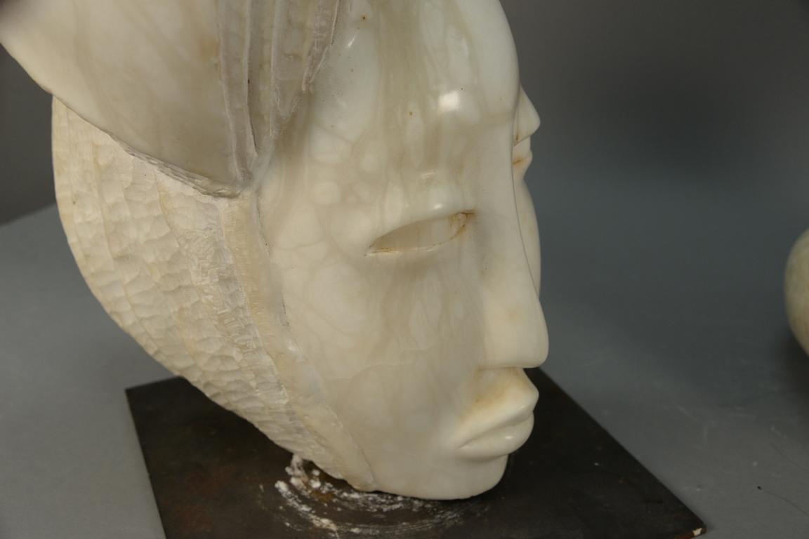 Ousmane Gueye b. 1956 marble two faced sculpture signed in marble Ousmane Gueye. ht. 22in. Provenance: Collection of Anne Jones Willis and the late John Ralph Willis, New Jersey