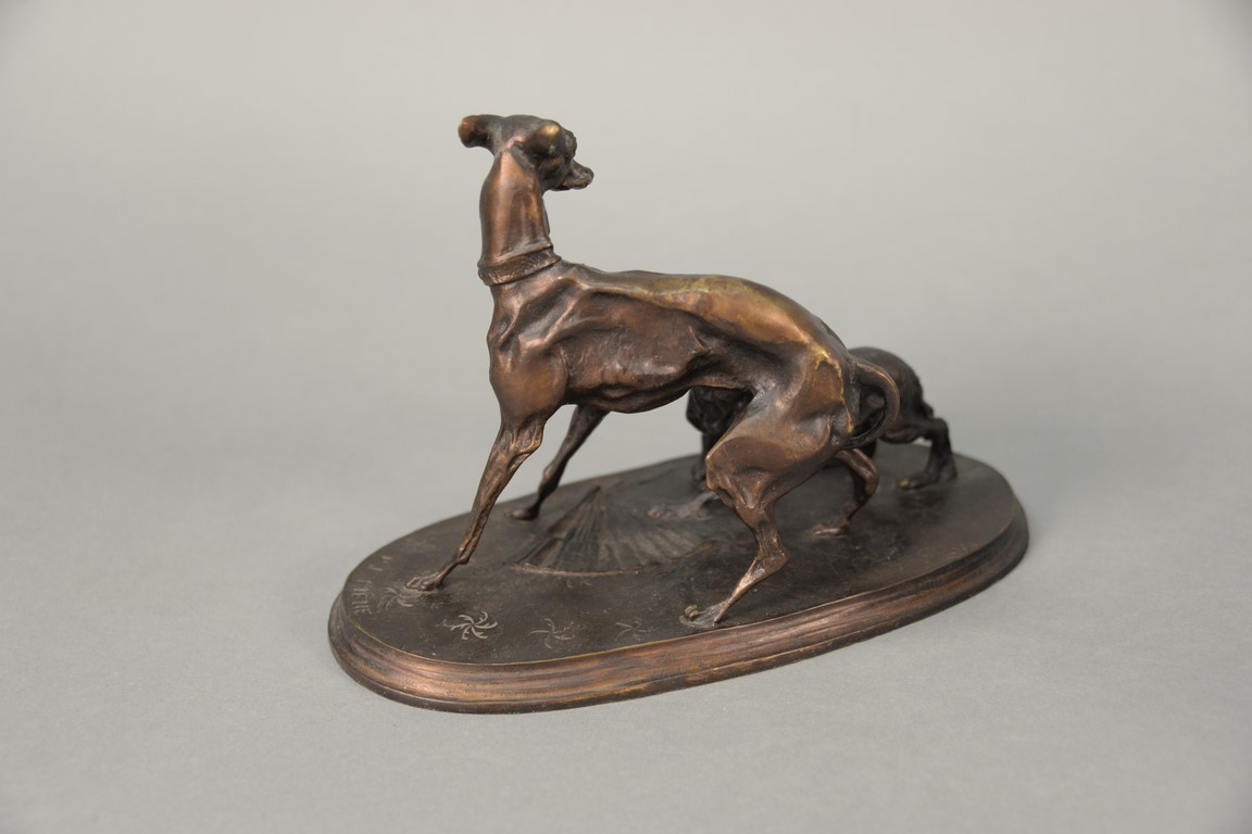 Pierre Jules Mene 1810-1879 bronze restrike King Charles Scaring the Whippet signed on base: PJ Mene height 6 inches, length 8 1/2 inches