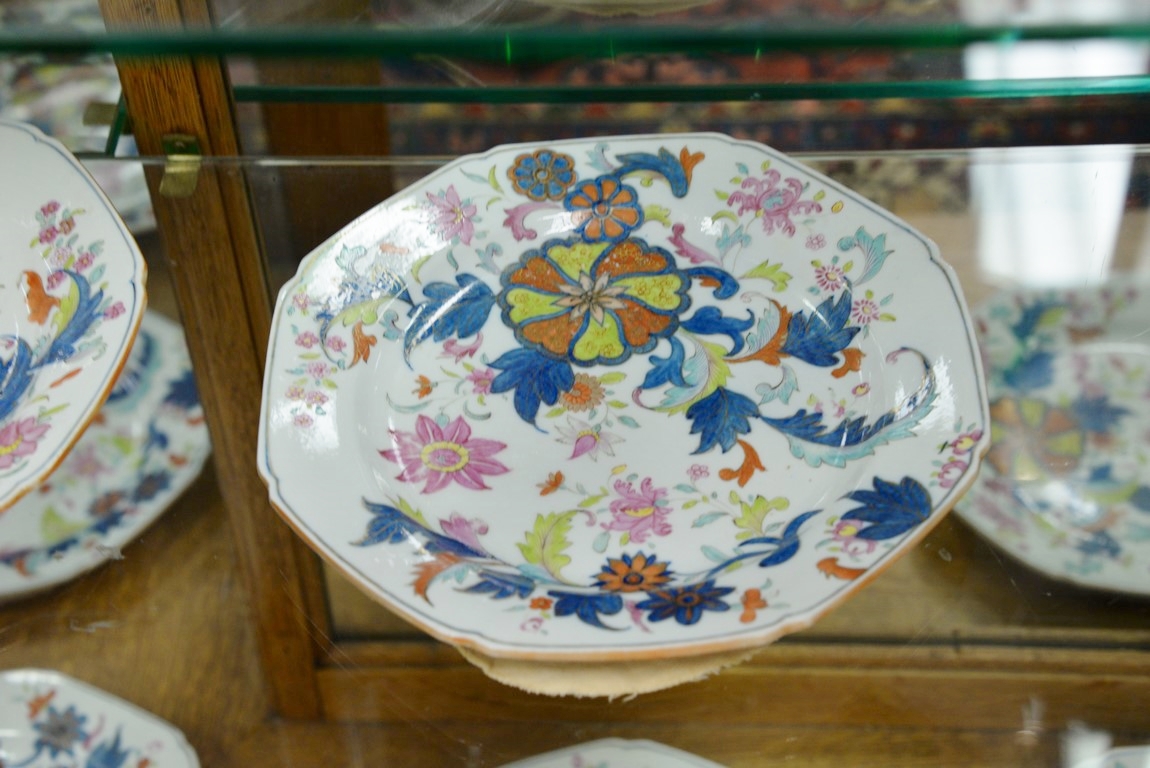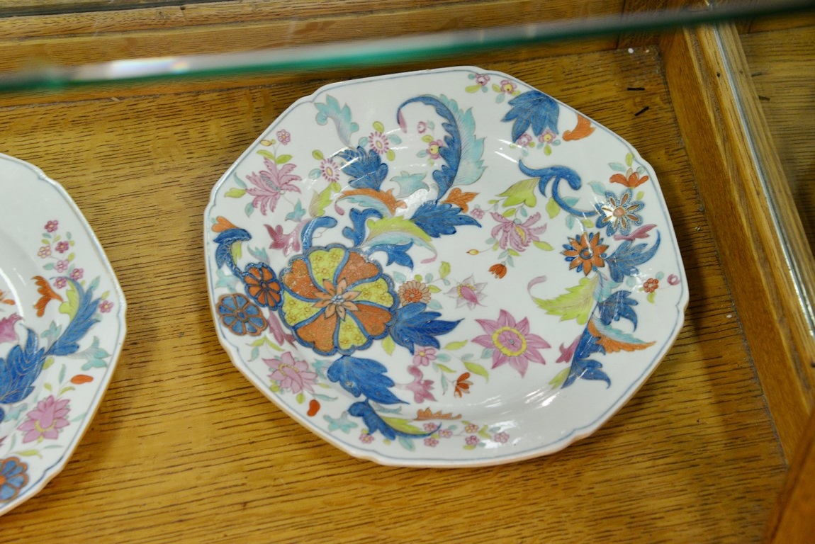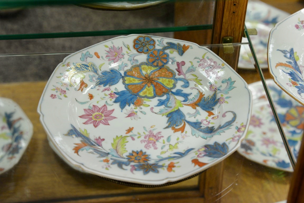 Lot 305: Set of twelve Chinese Export Pseudo Tobacco Leaf plate with scalloped edge and enamels of pink, yellow, iron-red, and green with ov…